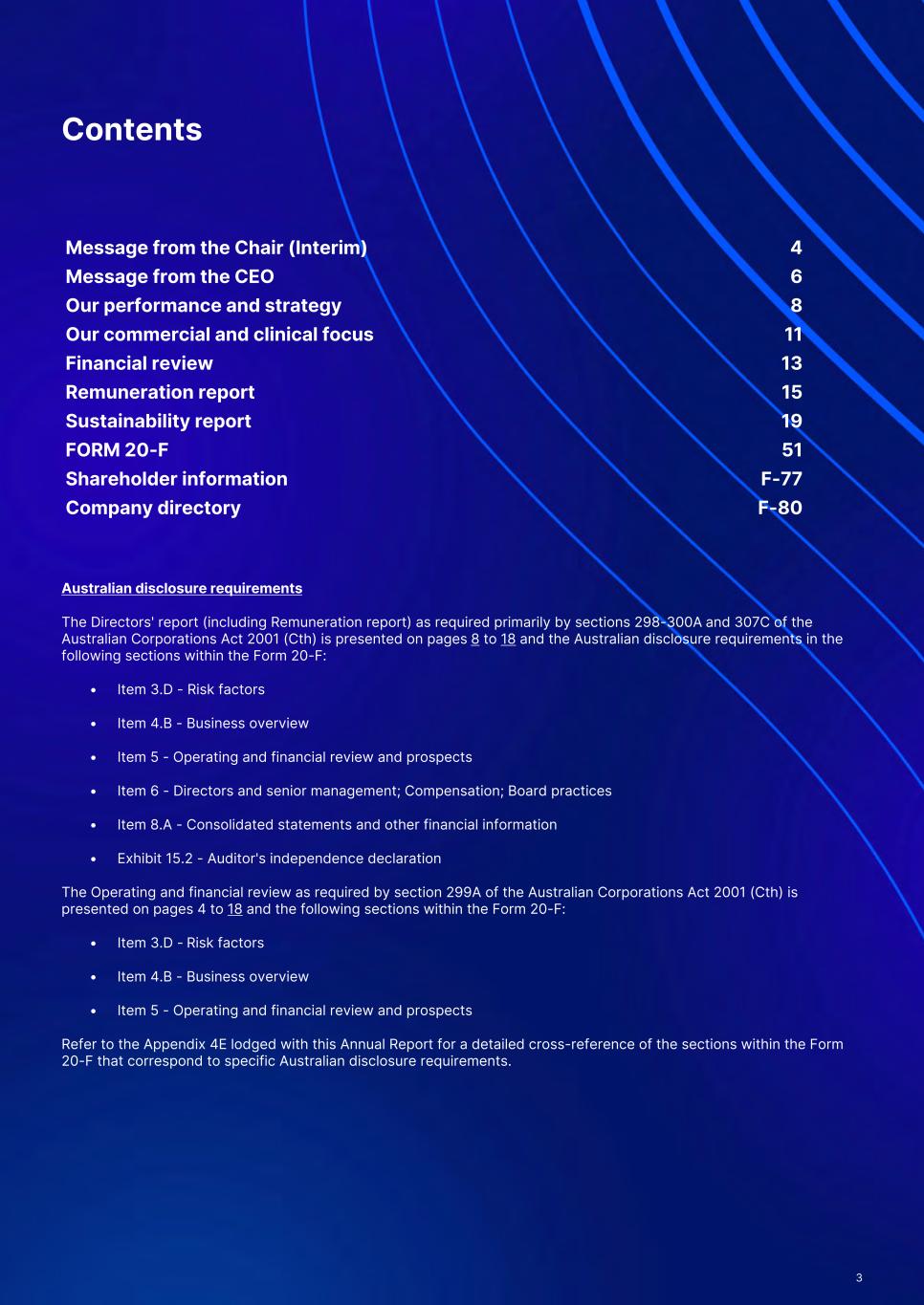 Contents Message from the Chair (Interim) 4 Message from the CEO 6 Our performance and strategy 8 Our commercial and clinical focus 11 Financial review 13 Remuneration report 15 Sustainability report 19 FORM 20-F 51 Shareholder information F-77 Company directory F-80 Australian disclosure requirements The Directors' report (including Remuneration report) as required primarily by sections 298-300A and 307C of the Australian Corporations Act 2001 (Cth) is presented on pages 8 to 18 and the Australian disclosure requirements in the following sections within the Form 20-F: • Item 3.D - Risk factors • Item 4.B - Business overview • Item 5 - Operating and financial review and prospects • Item 6 - Directors and senior management; Compensation; Board practices • Item 8.A - Consolidated statements and other financial information • Exhibit 15.2 - Auditor's independence declaration The Operating and financial review as required by section 299A of the Australian Corporations Act 2001 (Cth) is presented on pages 4 to 18 and the following sections within the Form 20-F: • Item 3.D - Risk factors • Item 4.B - Business overview • Item 5 - Operating and financial review and prospects Refer to the Appendix 4E lodged with this Annual Report for a detailed cross-reference of the sections within the Form 20-F that correspond to specific Australian disclosure requirements. 3