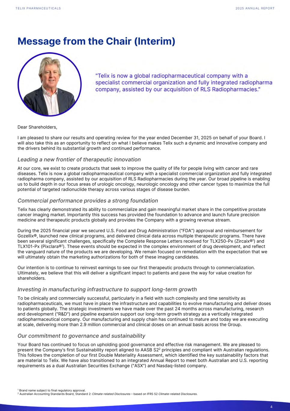 Message from the Chair (Interim) Dear Shareholders, I am pleased to share our results and operating review for the year ended December 31, 2025 on behalf of your Board. I will also take this as an opportunity to reflect on what I believe makes Telix such a dynamic and innovative company and the drivers behind its substantial growth and continued performance. Leading a new frontier of therapeutic innovation At our core, we exist to create products that seek to improve the quality of life for people living with cancer and rare diseases. Telix is now a global radiopharmaceutical company with a specialist commercial organization and fully integrated radiopharma company, assisted by our acquisition of RLS Radiopharmacies during the year. Our broad pipeline is enabling us to build depth in our focus areas of urologic oncology, neurologic oncology and other cancer types to maximize the full potential of targeted radionuclide therapy across various stages of disease burden. Commercial performance provides a strong foundation Telix has clearly demonstrated its ability to commercialize and gain meaningful market share in the competitive prostate cancer imaging market. Importantly this success has provided the foundation to advance and launch future precision medicine and therapeutic products globally and provides the Company with a growing revenue stream. During the 2025 financial year we secured U.S. Food and Drug Administration ("FDA") approval and reimbursement for Gozellix®, launched new clinical programs, and delivered clinical data across multiple therapeutic programs. There have been several significant challenges, specifically the Complete Response Letters received for TLX250-Px (Zircaix®1) and TLX101-Px (Pixclara®1). These events should be expected in the complex environment of drug development, and reflect the vanguard nature of the products we are developing. We remain focused on remediation with the expectation that we will ultimately obtain the marketing authorizations for both of these imaging candidates. Our intention is to continue to reinvest earnings to see our first therapeutic products through to commercialization. Ultimately, we believe that this will deliver a significant impact to patients and pave the way for value creation for shareholders. Investing in manufacturing infrastructure to support long-term growth To be clinically and commercially successful, particularly in a field with such complexity and time sensitivity as radiopharmaceuticals, we must have in place the infrastructure and capabilities to evolve manufacturing and deliver doses to patients globally. The strategic investments we have made over the past 24 months across manufacturing, research and development ("R&D") and pipeline expansion support our long-term growth strategy as a vertically integrated radiopharmaceutical company. Our manufacturing and supply chain has continued to mature and today we are executing at scale, delivering more than 2.9 million commercial and clinical doses on an annual basis across the Group. Our commitment to governance and sustainability Your Board has continued to focus on upholding good governance and effective risk management. We are pleased to present the Company’s first Sustainability report aligned to AASB S22 principles and compliant with Australian regulations. This follows the completion of our first Double Materiality Assessment, which identified the key sustainability factors that are material to Telix. We have also transitioned to an integrated Annual Report to meet both Australian and U.S. reporting requirements as a dual Australian Securities Exchange ("ASX") and Nasdaq-listed company. 4 1 Brand name subject to final regulatory approval. 2 Australian Accounting Standards Board, Standard 2: Climate-related Disclosures – based on IFRS S2 Climate-related Disclosures.