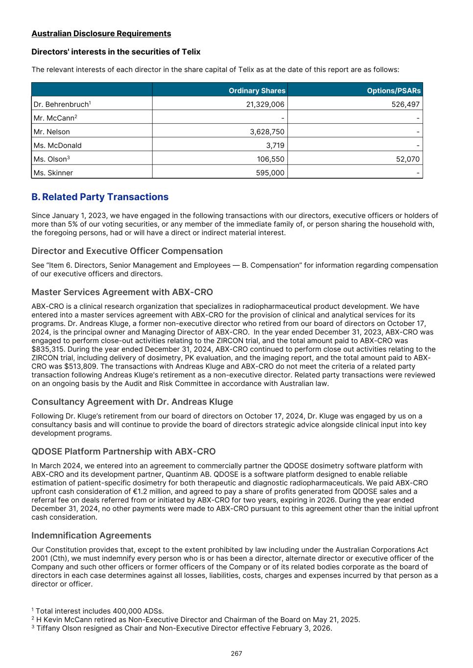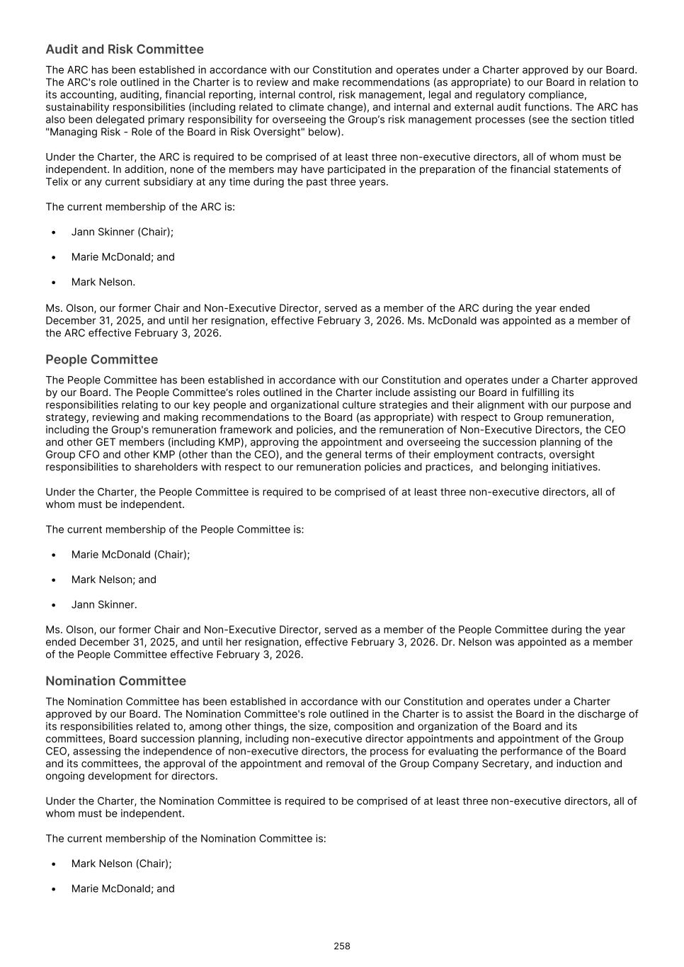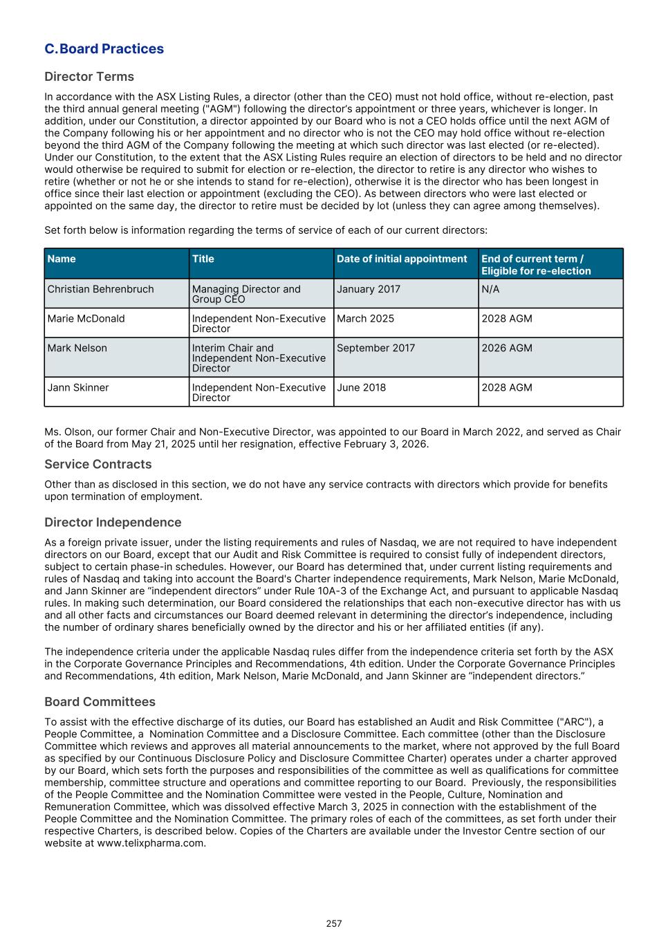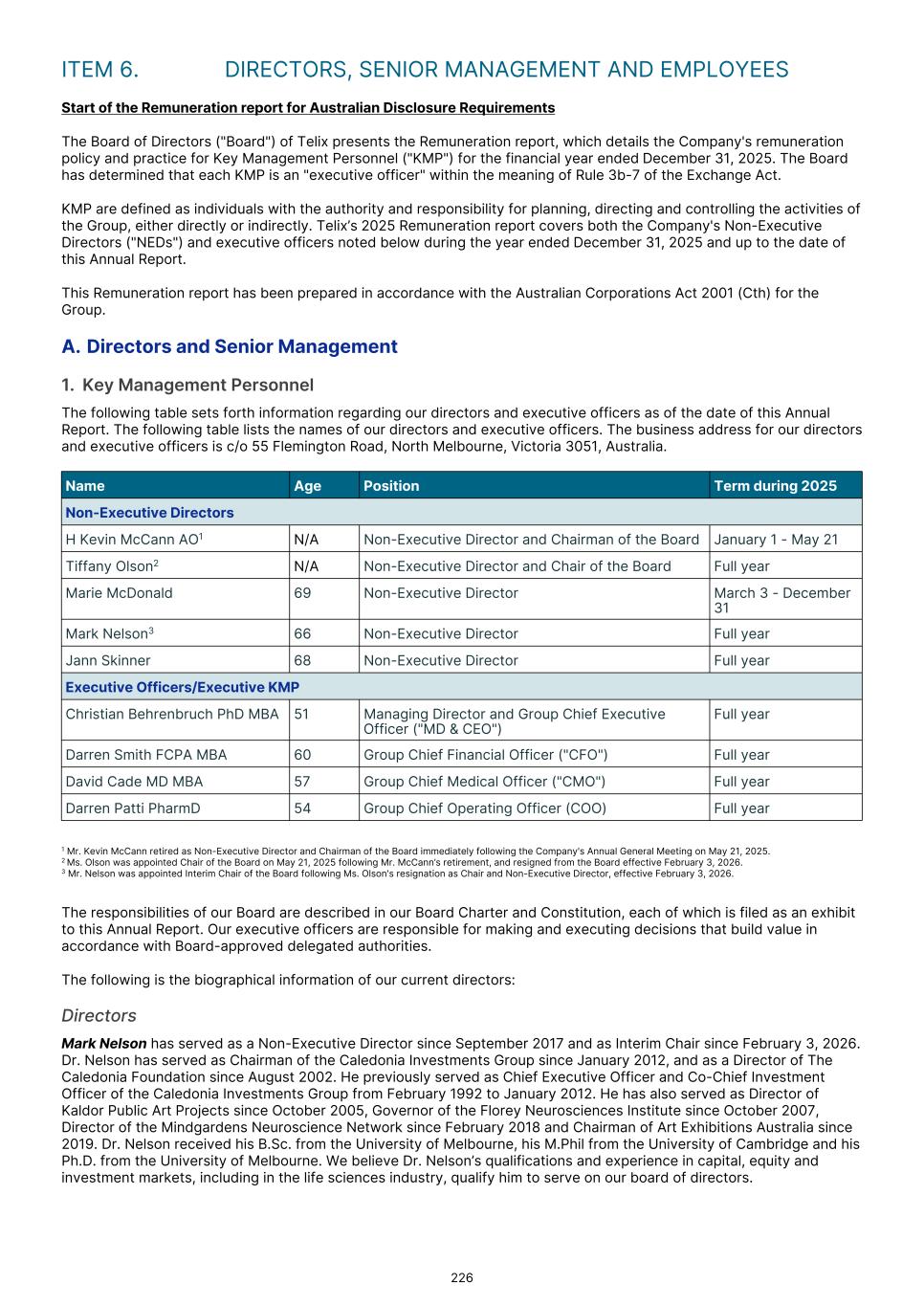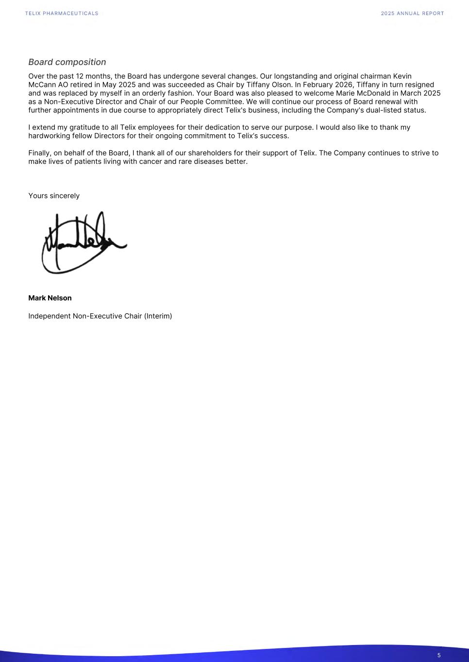 Board composition Over the past 12 months, the Board has undergone several changes. Our longstanding and original chairman Kevin McCann AO retired in May 2025 and was succeeded as Chair by Tiffany Olson. In February 2026, Tiffany in turn resigned and was replaced by myself in an orderly fashion. Your Board was also pleased to welcome Marie McDonald in March 2025 as a Non-Executive Director and Chair of our People Committee. We will continue our process of Board renewal with further appointments in due course to appropriately direct Telix's business, including the Company's dual-listed status. I extend my gratitude to all Telix employees for their dedication to serve our purpose. I would also like to thank my hardworking fellow Directors for their ongoing commitment to Telix’s success. Finally, on behalf of the Board, I thank all of our shareholders for their support of Telix. The Company continues to strive to make lives of patients living with cancer and rare diseases better. Yours sincerely Mark Nelson Independent Non-Executive Chair (Interim) 5