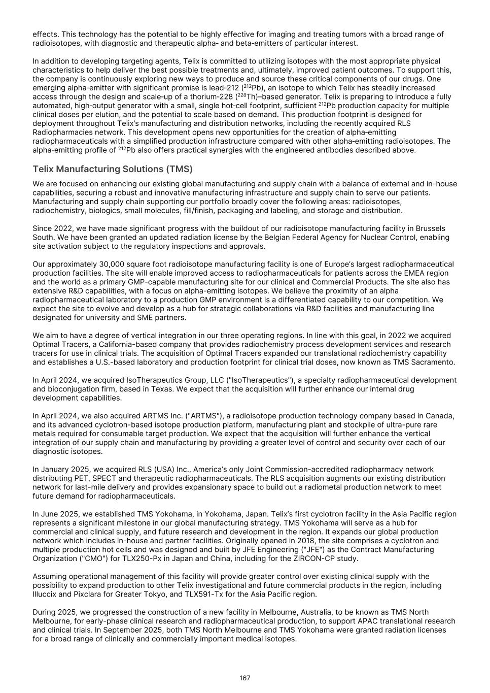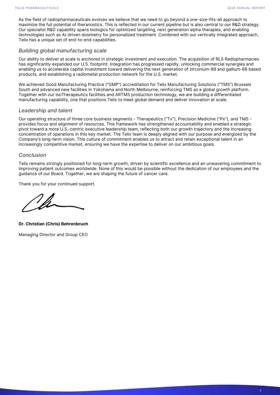 As the field of radiopharmaceuticals evolves we believe that we need to go beyond a one-size-fits-all approach to maximize the full potential of theranostics. This is reflected in our current pipeline but is also central to our R&D strategy. Our specialist R&D capability spans biologics for optimized targeting, next generation alpha therapies, and enabling technologies such as AI-driven dosimetry for personalized treatment. Combined with our vertically integrated approach, Telix has a unique set of end-to-end capabilities. Building global manufacturing scale Our ability to deliver at scale is anchored in strategic investment and execution. The acquisition of RLS Radiopharmacies has significantly expanded our U.S. footprint. Integration has progressed rapidly, unlocking commercial synergies and enabling us to accelerate capital investment toward delivering the next generation of zirconium-89 and gallium-68 based products, and establishing a radiometal production network for the U.S. market. We achieved Good Manufacturing Practice ("GMP") accreditation for Telix Manufacturing Solutions ("TMS") Brussels South and advanced new facilities in Yokohama and North Melbourne, reinforcing TMS as a global growth platform. Together with our IsoTherapeutics facilities and ARTMS production technology, we are building a differentiated manufacturing capability, one that positions Telix to meet global demand and deliver innovation at scale. Leadership and talent Our operating structure of three core business segments - Therapeutics ("Tx"), Precision Medicine ("Px"), and TMS - provides focus and alignment of resources. This framework has strengthened accountability and enabled a strategic pivot toward a more U.S.-centric executive leadership team, reflecting both our growth trajectory and the increasing concentration of operations in this key market. The Telix team is deeply aligned with our purpose and energized by the Company’s long-term vision. This culture of commitment enables us to attract and retain exceptional talent in an increasingly competitive market, ensuring we have the expertise to deliver on our ambitious goals. Conclusion Telix remains strongly positioned for long-term growth, driven by scientific excellence and an unwavering commitment to improving patient outcomes worldwide. None of this would be possible without the dedication of our employees and the guidance of our Board. Together, we are shaping the future of cancer care. Thank you for your continued support. Dr. Christian (Chris) Behrenbruch Managing Director and Group CEO 7