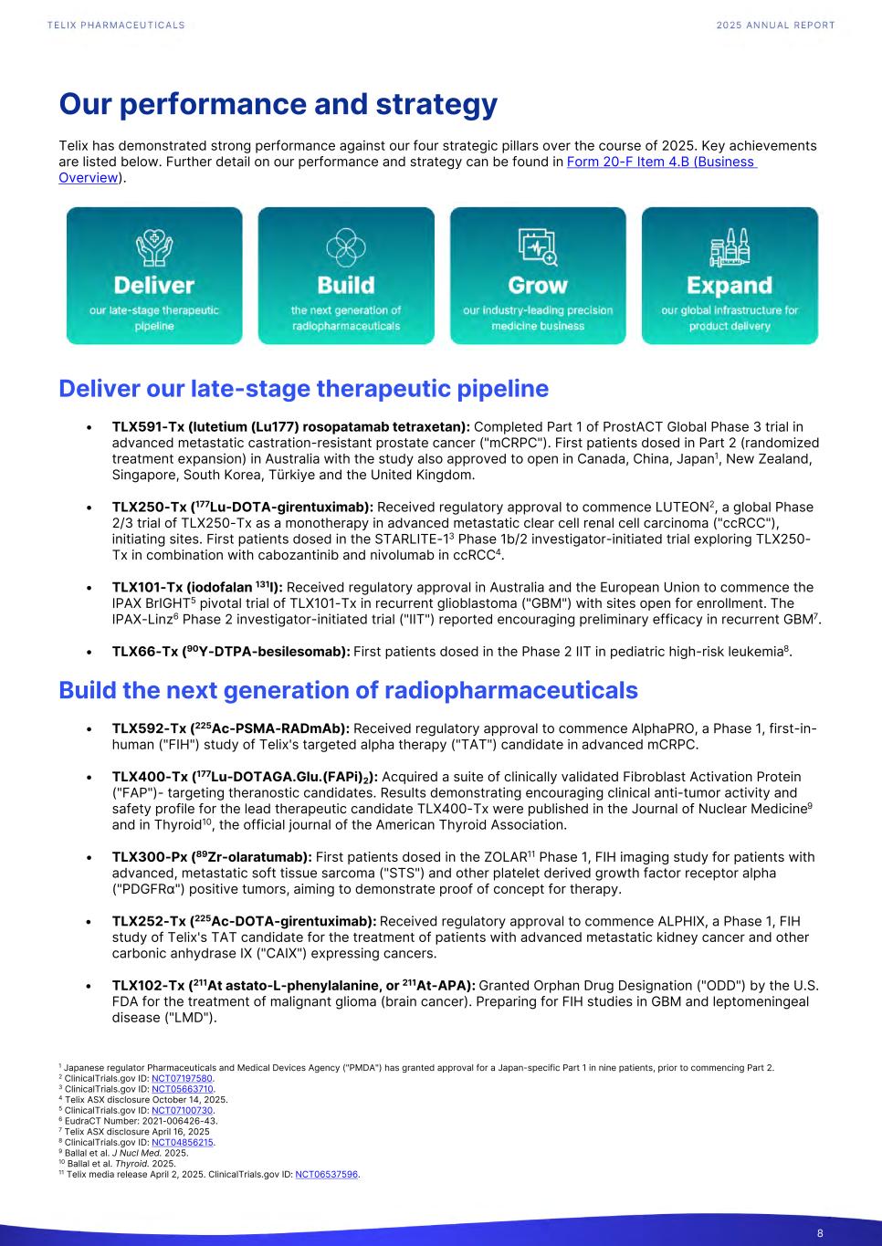 Our performance and strategy Telix has demonstrated strong performance against our four strategic pillars over the course of 2025. Key achievements are listed below. Further detail on our performance and strategy can be found in Form 20-F Item 4.B (Business Overview). Deliver our late-stage therapeutic pipeline • TLX591-Tx (lutetium (Lu177) rosopatamab tetraxetan): Completed Part 1 of ProstACT Global Phase 3 trial in advanced metastatic castration-resistant prostate cancer ("mCRPC"). First patients dosed in Part 2 (randomized treatment expansion) in Australia with the study also approved to open in Canada, China, Japan1, New Zealand, Singapore, South Korea, Türkiye and the United Kingdom. • TLX250-Tx (177Lu-DOTA-girentuximab): Received regulatory approval to commence LUTEON2, a global Phase 2/3 trial of TLX250-Tx as a monotherapy in advanced metastatic clear cell renal cell carcinoma ("ccRCC"), initiating sites. First patients dosed in the STARLITE-13 Phase 1b/2 investigator-initiated trial exploring TLX250- Tx in combination with cabozantinib and nivolumab in ccRCC4. • TLX101-Tx (iodofalan 131I): Received regulatory approval in Australia and the European Union to commence the IPAX BrIGHT5 pivotal trial of TLX101-Tx in recurrent glioblastoma ("GBM") with sites open for enrollment. The IPAX-Linz6 Phase 2 investigator-initiated trial ("IIT") reported encouraging preliminary efficacy in recurrent GBM7. • TLX66-Tx (90Y-DTPA-besilesomab): First patients dosed in the Phase 2 IIT in pediatric high-risk leukemia8. Build the next generation of radiopharmaceuticals • TLX592-Tx (225Ac-PSMA-RADmAb): Received regulatory approval to commence AlphaPRO, a Phase 1, first-in- human ("FIH") study of Telix's targeted alpha therapy ("TAT") candidate in advanced mCRPC. • TLX400-Tx (177Lu-DOTAGA.Glu.(FAPi)2): Acquired a suite of clinically validated Fibroblast Activation Protein ("FAP")- targeting theranostic candidates. Results demonstrating encouraging clinical anti-tumor activity and safety profile for the lead therapeutic candidate TLX400-Tx were published in the Journal of Nuclear Medicine9 and in Thyroid10, the official journal of the American Thyroid Association. • TLX300-Px (89Zr-olaratumab): First patients dosed in the ZOLAR11 Phase 1, FIH imaging study for patients with advanced, metastatic soft tissue sarcoma ("STS") and other platelet derived growth factor receptor alpha ("PDGFRα") positive tumors, aiming to demonstrate proof of concept for therapy. • TLX252-Tx (225Ac-DOTA-girentuximab): Received regulatory approval to commence ALPHIX, a Phase 1, FIH study of Telix's TAT candidate for the treatment of patients with advanced metastatic kidney cancer and other carbonic anhydrase IX ("CAIX") expressing cancers. • TLX102-Tx (211At astato-L-phenylalanine, or 211At-APA): Granted Orphan Drug Designation ("ODD") by the U.S. FDA for the treatment of malignant glioma (brain cancer). Preparing for FIH studies in GBM and leptomeningeal disease ("LMD"). 8 1 Japanese regulator Pharmaceuticals and Medical Devices Agency ("PMDA") has granted approval for a Japan-specific Part 1 in nine patients, prior to commencing Part 2. 2 ClinicalTrials.gov ID: NCT07197580. 3 ClinicalTrials.gov ID: NCT05663710. 4 Telix ASX disclosure October 14, 2025. 5 ClinicalTrials.gov ID: NCT07100730. 6 EudraCT Number: 2021-006426-43. 7 Telix ASX disclosure April 16, 2025 8 ClinicalTrials.gov ID: NCT04856215. 9 Ballal et al. J Nucl Med. 2025. 10 Ballal et al. Thyroid. 2025. 11 Telix media release April 2, 2025. ClinicalTrials.gov ID: NCT06537596.