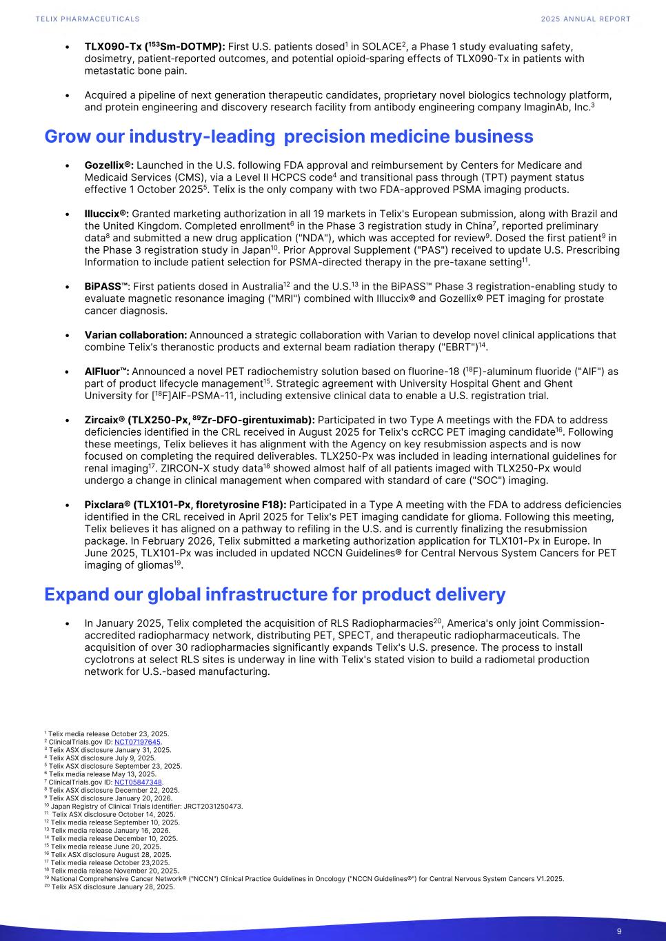 • TLX090-Tx (153Sm-DOTMP): First U.S. patients dosed1 in SOLACE2, a Phase 1 study evaluating safety, dosimetry, patient‑reported outcomes, and potential opioid‑sparing effects of TLX090‑Tx in patients with metastatic bone pain. • Acquired a pipeline of next generation therapeutic candidates, proprietary novel biologics technology platform, and protein engineering and discovery research facility from antibody engineering company ImaginAb, Inc.3 Grow our industry-leading precision medicine business • Gozellix®: Launched in the U.S. following FDA approval and reimbursement by Centers for Medicare and Medicaid Services (CMS), via a Level II HCPCS code4 and transitional pass through (TPT) payment status effective 1 October 20255. Telix is the only company with two FDA-approved PSMA imaging products. • Illuccix®: Granted marketing authorization in all 19 markets in Telix's European submission, along with Brazil and the United Kingdom. Completed enrollment6 in the Phase 3 registration study in China7, reported preliminary data8 and submitted a new drug application ("NDA"), which was accepted for review9. Dosed the first patient9 in the Phase 3 registration study in Japan10. Prior Approval Supplement ("PAS") received to update U.S. Prescribing Information to include patient selection for PSMA-directed therapy in the pre-taxane setting11. • BiPASS™: First patients dosed in Australia12 and the U.S.13 in the BiPASS™ Phase 3 registration-enabling study to evaluate magnetic resonance imaging ("MRI") combined with Illuccix® and Gozellix® PET imaging for prostate cancer diagnosis. • Varian collaboration: Announced a strategic collaboration with Varian to develop novel clinical applications that combine Telix’s theranostic products and external beam radiation therapy ("EBRT")14. • AlFluor™: Announced a novel PET radiochemistry solution based on fluorine-18 (18F)-aluminum fluoride ("AlF") as part of product lifecycle management15. Strategic agreement with University Hospital Ghent and Ghent University for [18F]AlF-PSMA-11, including extensive clinical data to enable a U.S. registration trial. • Zircaix® (TLX250-Px, 89Zr-DFO-girentuximab): Participated in two Type A meetings with the FDA to address deficiencies identified in the CRL received in August 2025 for Telix's ccRCC PET imaging candidate16. Following these meetings, Telix believes it has alignment with the Agency on key resubmission aspects and is now focused on completing the required deliverables. TLX250-Px was included in leading international guidelines for renal imaging17. ZIRCON-X study data18 showed almost half of all patients imaged with TLX250-Px would undergo a change in clinical management when compared with standard of care ("SOC") imaging. • Pixclara® (TLX101-Px, floretyrosine F18): Participated in a Type A meeting with the FDA to address deficiencies identified in the CRL received in April 2025 for Telix's PET imaging candidate for glioma. Following this meeting, Telix believes it has aligned on a pathway to refiling in the U.S. and is currently finalizing the resubmission package. In February 2026, Telix submitted a marketing authorization application for TLX101-Px in Europe. In June 2025, TLX101-Px was included in updated NCCN Guidelines® for Central Nervous System Cancers for PET imaging of gliomas19. Expand our global infrastructure for product delivery • In January 2025, Telix completed the acquisition of RLS Radiopharmacies20, America's only joint Commission- accredited radiopharmacy network, distributing PET, SPECT, and therapeutic radiopharmaceuticals. The acquisition of over 30 radiopharmacies significantly expands Telix's U.S. presence. The process to install cyclotrons at select RLS sites is underway in line with Telix's stated vision to build a radiometal production network for U.S.-based manufacturing. 9 1 Telix media release October 23, 2025. 2 ClinicalTrials.gov ID: NCT07197645. 3 Telix ASX disclosure January 31, 2025. 4 Telix ASX disclosure July 9, 2025. 5 Telix ASX disclosure September 23, 2025. 6 Telix media release May 13, 2025. 7 ClinicalTrials.gov ID: NCT05847348. 8 Telix ASX disclosure December 22, 2025. 9 Telix ASX disclosure January 20, 2026. 10 Japan Registry of Clinical Trials identifier: JRCT2031250473. 11 Telix ASX disclosure October 14, 2025. 12 Telix media release September 10, 2025. 13 Telix media release January 16, 2026. 14 Telix media release December 10, 2025. 15 Telix media release June 20, 2025. 16 Telix ASX disclosure August 28, 2025. 17 Telix media release October 23,2025. 18 Telix media release November 20, 2025. 19 National Comprehensive Cancer Network® ("NCCN") Clinical Practice Guidelines in Oncology ("NCCN Guidelines®") for Central Nervous System Cancers V1.2025. 20 Telix ASX disclosure January 28, 2025.