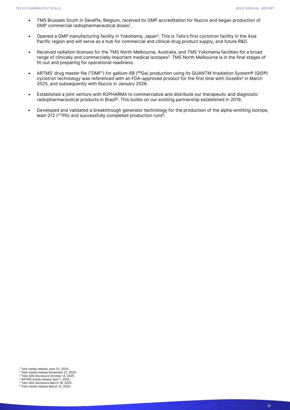 • TMS Brussels South in Seneffe, Belgium, received its GMP accreditation for Illuccix and began production of GMP commercial radiopharmaceutical doses1. • Opened a GMP manufacturing facility in Yokohama, Japan2. This is Telix's first cyclotron facility in the Asia Pacific region and will serve as a hub for commercial and clinical drug product supply, and future R&D. • Received radiation licenses for the TMS North Melbourne, Australia, and TMS Yokohama facilities for a broad range of clinically and commercially important medical isotopes3. TMS North Melbourne is in the final stages of fit-out and preparing for operational readiness. • ARTMS' drug master file ("DMF") for gallium-68 (68Ga) production using its QUANTM Irradiation System® (QIS®) cyclotron technology was referenced with an FDA-approved product for the first time with Gozellix4 in March 2025, and subsequently with Illuccix in January 2026. • Established a joint venture with R2PHARMA to commercialize and distribute our therapeutic and diagnostic radiopharmaceutical products in Brazil5. This builds on our existing partnership established in 2019. • Developed and validated a breakthrough generator technology for the production of the alpha-emitting isotope, lead-212 (212Pb) and successfully completed production runs6. 10 1 Telix media release June 25, 2025. 2 Telix media release November 21, 2025. 3 Telix ASX disclosure October 14, 2025. 4 ARTMS media release April 1, 2025. 5 Telix ASX disclosure March 18, 2025. 6 Telix media release March 13, 2025.