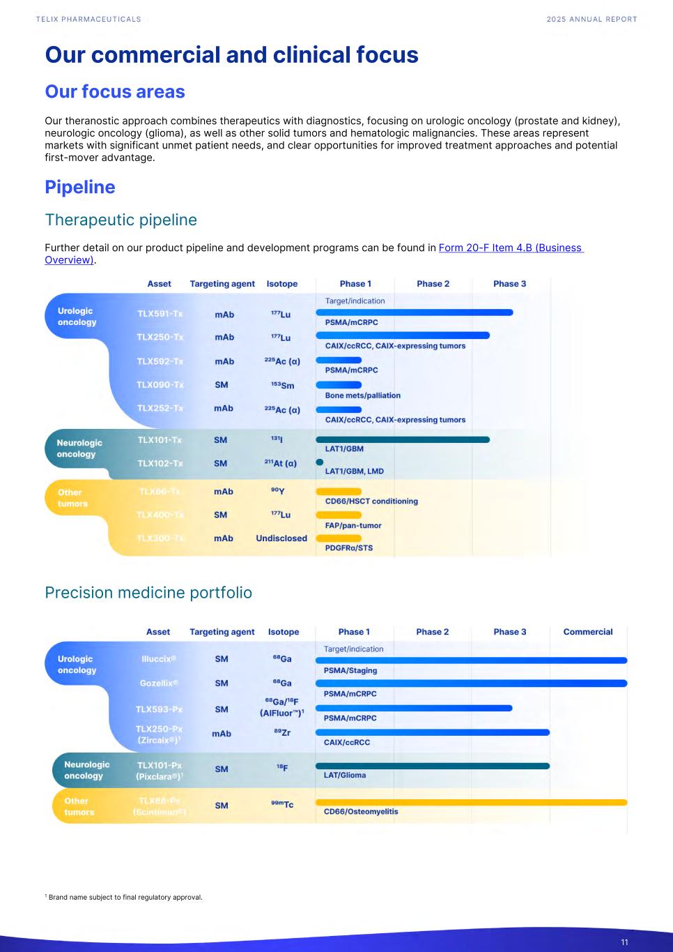 Our commercial and clinical focus Our focus areas Our theranostic approach combines therapeutics with diagnostics, focusing on urologic oncology (prostate and kidney), neurologic oncology (glioma), as well as other solid tumors and hematologic malignancies. These areas represent markets with significant unmet patient needs, and clear opportunities for improved treatment approaches and potential first-mover advantage. Pipeline Therapeutic pipeline Further detail on our product pipeline and development programs can be found in Form 20-F Item 4.B (Business Overview). Precision medicine portfolio 1 11 1 Brand name subject to final regulatory approval.