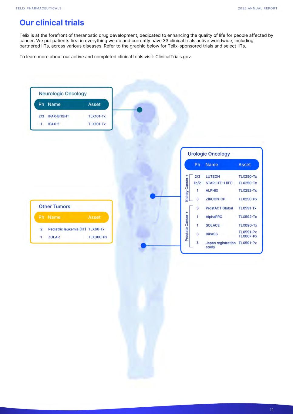 Our clinical trials Telix is at the forefront of theranostic drug development, dedicated to enhancing the quality of life for people affected by cancer. We put patients first in everything we do and currently have 33 clinical trials active worldwide, including partnered IITs, across various diseases. Refer to the graphic below for Telix-sponsored trials and select IITs. To learn more about our active and completed clinical trials visit: ClinicalTrials.gov 12