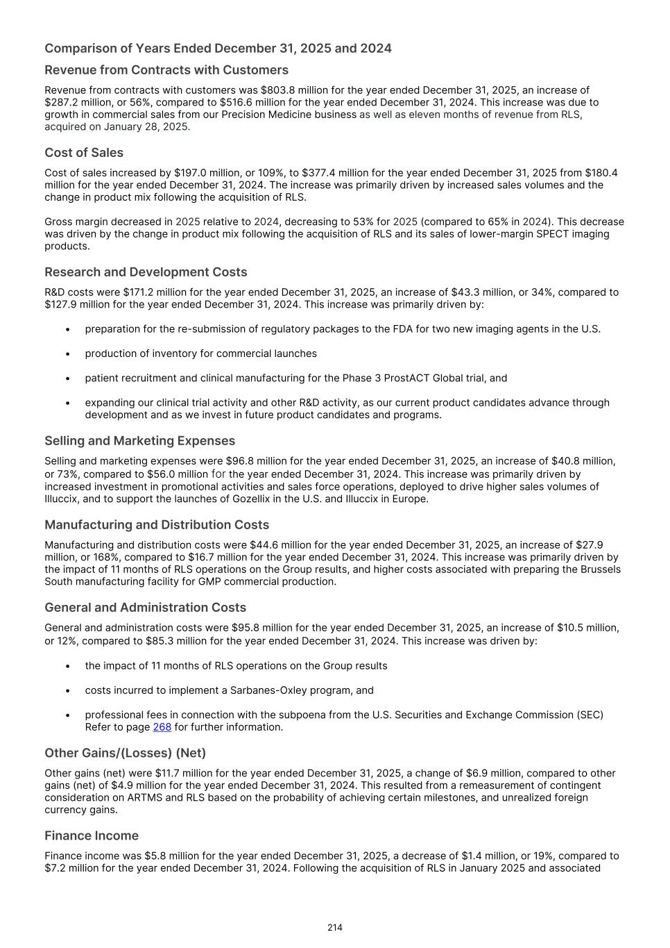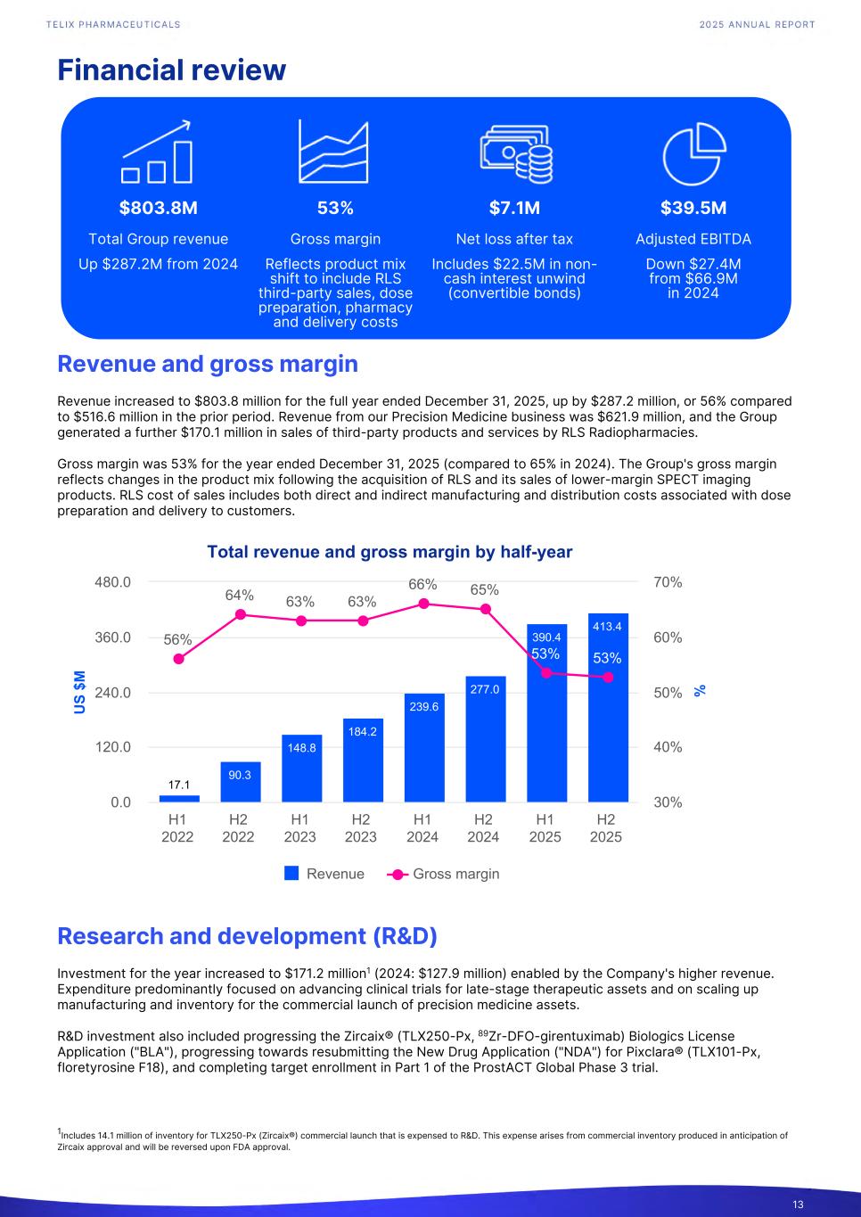 Financial review Revenue and gross margin Revenue increased to $803.8 million for the full year ended December 31, 2025, up by $287.2 million, or 56% compared to $516.6 million in the prior period. Revenue from our Precision Medicine business was $621.9 million, and the Group generated a further $170.1 million in sales of third-party products and services by RLS Radiopharmacies. Gross margin was 53% for the year ended December 31, 2025 (compared to 65% in 2024). The Group's gross margin reflects changes in the product mix following the acquisition of RLS and its sales of lower-margin SPECT imaging products. RLS cost of sales includes both direct and indirect manufacturing and distribution costs associated with dose preparation and delivery to customers. U S $M % Total revenue and gross margin by half-year 17.1 90.3 148.8 184.2 239.6 277.0 390.4 413.4 56% 64% 63% 63% 66% 65% 53% 53% Revenue Gross margin H1 2022 H2 2022 H1 2023 H2 2023 H1 2024 H2 2024 H1 2025 H2 2025 0.0 120.0 240.0 360.0 480.0 30% 40% 50% 60% 70% Research and development (R&D) Investment for the year increased to $171.2 million1 (2024: $127.9 million) enabled by the Company's higher revenue. Expenditure predominantly focused on advancing clinical trials for late-stage therapeutic assets and on scaling up manufacturing and inventory for the commercial launch of precision medicine assets. R&D investment also included progressing the Zircaix® (TLX250-Px, 89Zr-DFO-girentuximab) Biologics License Application ("BLA"), progressing towards resubmitting the New Drug Application ("NDA") for Pixclara® (TLX101-Px, floretyrosine F18), and completing target enrollment in Part 1 of the ProstACT Global Phase 3 trial. 13 1Includes 14.1 million of inventory for TLX250-Px (Zircaix®) commercial launch that is expensed to R&D. This expense arises from commercial inventory produced in anticipation of Zircaix approval and will be reversed upon FDA approval. $803.8M 53% $7.1M $39.5M Total Group revenue Gross margin Net loss after tax Adjusted EBITDA Up $287.2M from 2024 Reflects product mix shift to include RLS third-party sales, dose preparation, pharmacy and delivery costs Includes $22.5M in non- cash interest unwind (convertible bonds) Down $27.4M from $66.9M in 2024