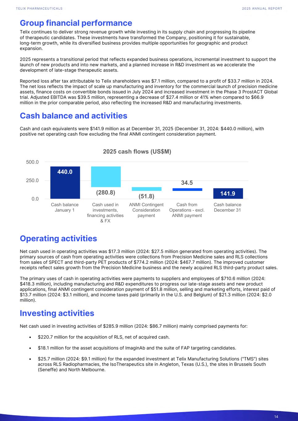 Group financial performance Telix continues to deliver strong revenue growth while investing in its supply chain and progressing its pipeline of therapeutic candidates. These investments have transformed the Company, positioning it for sustainable, long-term growth, while its diversified business provides multiple opportunities for geographic and product expansion. 2025 represents a transitional period that reflects expanded business operations, incremental investment to support the launch of new products and into new markets, and a planned increase in R&D investment as we accelerate the development of late-stage therapeutic assets. Reported loss after tax attributable to Telix shareholders was $7.1 million, compared to a profit of $33.7 million in 2024. The net loss reflects the impact of scale up manufacturing and inventory for the commercial launch of precision medicine assets, finance costs on convertible bonds issued in July 2024 and increased investment in the Phase 3 ProstACT Global trial. Adjusted EBITDA was $39.5 million, representing a decrease of $27.4 million or 41% when compared to $66.9 million in the prior comparable period, also reflecting the increased R&D and manufacturing investments. Cash balance and activities Cash and cash equivalents were $141.9 million as at December 31, 2025 (December 31, 2024: $440.0 million), with positive net operating cash flow excluding the final ANMI contingent consideration payment. Operating activities Net cash used in operating activities was $17.3 million (2024: $27.5 million generated from operating activities). The primary sources of cash from operating activities were collections from Precision Medicine sales and RLS collections from sales of SPECT and third-party PET products of $774.2 million (2024: $467.7 million). The improved customer receipts reflect sales growth from the Precision Medicine business and the newly acquired RLS third-party product sales. The primary uses of cash in operating activities were payments to suppliers and employees of $710.6 million (2024: $418.3 million), including manufacturing and R&D expenditures to progress our late-stage assets and new product applications, final ANMI contingent consideration payment of $51.8 million, selling and marketing efforts, interest paid of $13.7 million (2024: $3.1 million), and income taxes paid (primarily in the U.S. and Belgium) of $21.3 million (2024: $2.0 million). Investing activities Net cash used in investing activities of $285.9 million (2024: $86.7 million) mainly comprised payments for: • $220.7 million for the acquisition of RLS, net of acquired cash. • $18.1 million for the asset acquisitions of ImaginAb and the suite of FAP targeting candidates. • $25.7 million (2024: $9.1 million) for the expanded investment at Telix Manufacturing Solutions ("TMS") sites across RLS Radiopharmacies, the IsoTherapeutics site in Angleton, Texas (U.S.), the sites in Brussels South (Seneffe) and North Melbourne. 14 2025 cash flows (US$M) 440.0 (280.8) (51.8) 34.5 141.9 Cash balance January 1 Cash used in investments, financing activities & FX ANMI Contingent Consideration payment Cash from Operations - excl. ANMI payment Cash balance December 31 0.0 250.0 500.0