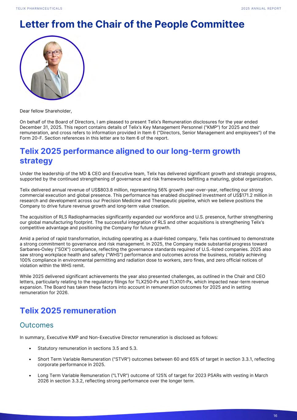 Letter from the Chair of the People Committee Dear fellow Shareholder, On behalf of the Board of Directors, I am pleased to present Telix’s Remuneration disclosures for the year ended December 31, 2025. This report contains details of Telix’s Key Management Personnel ("KMP") for 2025 and their remuneration, and cross refers to information provided in Item 6 ("Directors, Senior Management and employees") of the Form 20-F. Section references in this letter are to Item 6 of the report. Telix 2025 performance aligned to our long-term growth strategy Under the leadership of the MD & CEO and Executive team, Telix has delivered significant growth and strategic progress, supported by the continued strengthening of governance and risk frameworks befitting a maturing, global organization. Telix delivered annual revenue of US$803.8 million, representing 56% growth year-over-year, reflecting our strong commercial execution and global presence. This performance has enabled disciplined investment of US$171.2 million in research and development across our Precision Medicine and Therapeutic pipeline, which we believe positions the Company to drive future revenue growth and long‑term value creation. The acquisition of RLS Radiopharmacies significantly expanded our workforce and U.S. presence, further strengthening our global manufacturing footprint. The successful integration of RLS and other acquisitions is strengthening Telix’s competitive advantage and positioning the Company for future growth. Amid a period of rapid transformation, including operating as a dual‑listed company, Telix has continued to demonstrate a strong commitment to governance and risk management. In 2025, the Company made substantial progress toward Sarbanes‑Oxley ("SOX") compliance, reflecting the governance standards required of U.S.‑listed companies. 2025 also saw strong workplace health and safety ("WHS") performance and outcomes across the business, notably achieving 100% compliance in environmental permitting and radiation dose to workers, zero fines, and zero official notices of violation within the WHS remit. While 2025 delivered significant achievements the year also presented challenges, as outlined in the Chair and CEO letters, particularly relating to the regulatory filings for TLX250‑Px and TLX101‑Px, which impacted near-term revenue expansion. The Board has taken these factors into account in remuneration outcomes for 2025 and in setting remuneration for 2026. Telix 2025 remuneration Outcomes In summary, Executive KMP and Non-Executive Director remuneration is disclosed as follows: • Statutory remuneration in sections 3.5 and 5.3. • Short Term Variable Remuneration ("STVR") outcomes between 60 and 65% of target in section 3.3.1, reflecting corporate performance in 2025. • Long Term Variable Remuneration ("LTVR") outcome of 125% of target for 2023 PSARs with vesting in March 2026 in section 3.3.2, reflecting strong performance over the longer term. 16