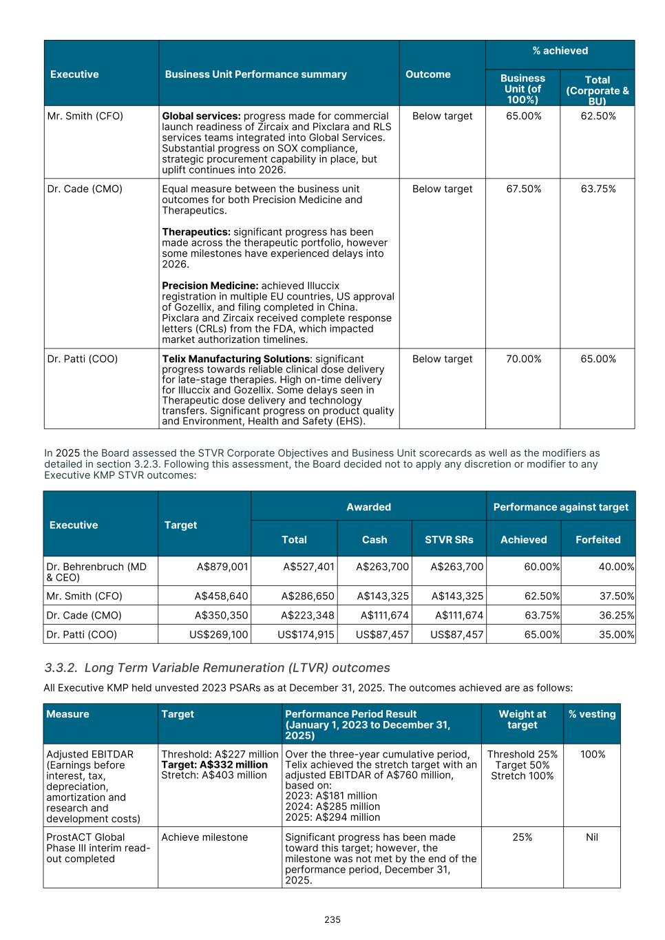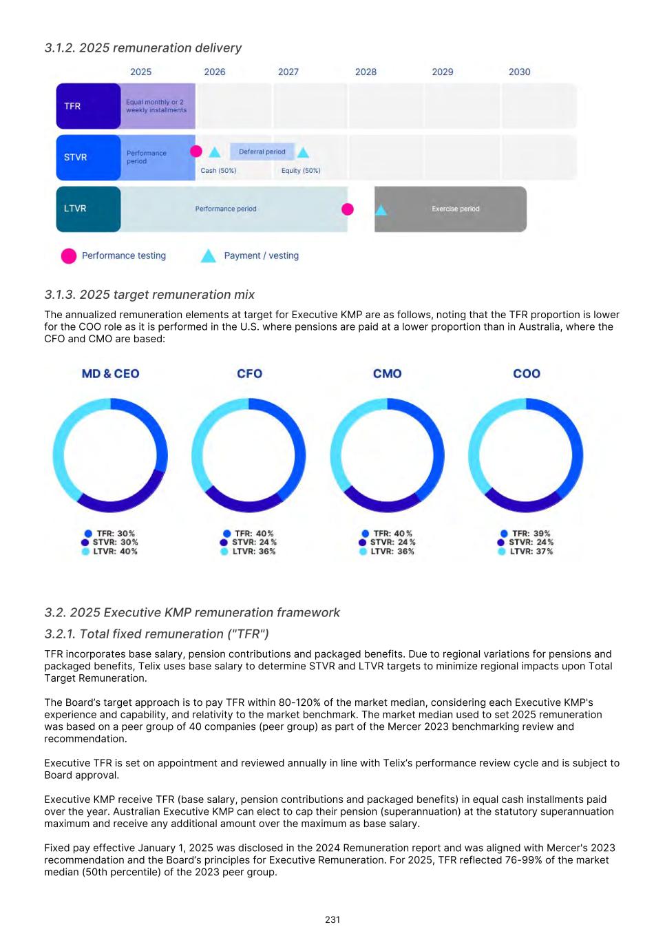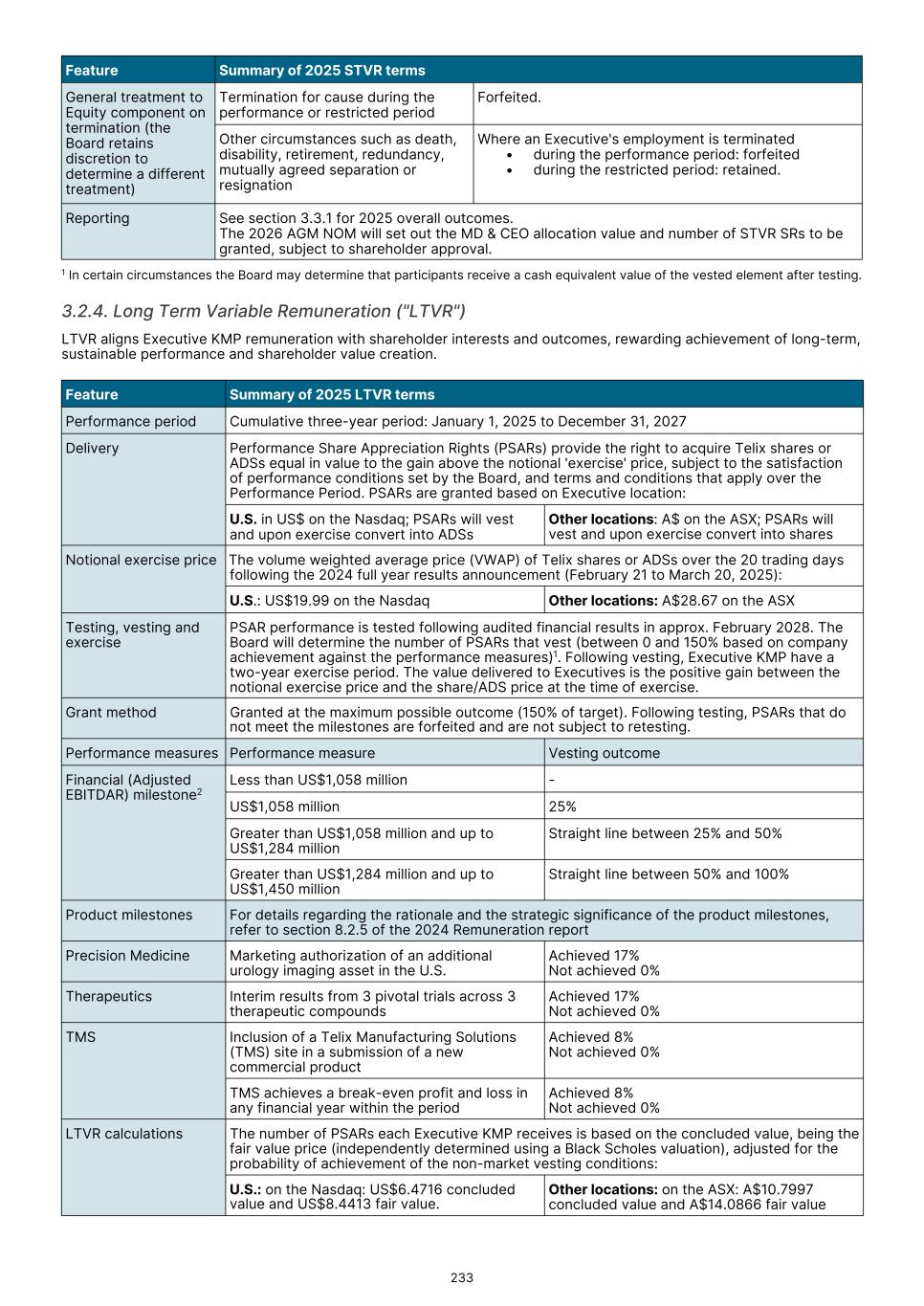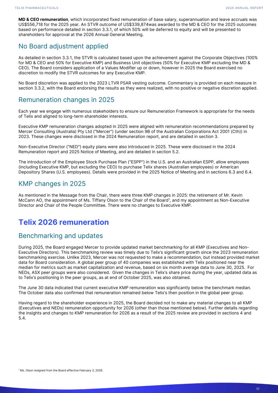 MD & CEO remuneration, which incorporated fixed remuneration of base salary, superannuation and leave accruals was US$556,718 for the 2025 year. An STVR outcome of US$339,874was awarded to the MD & CEO for the 2025 outcomes based on performance detailed in section 3.3.1, of which 50% will be deferred to equity and will be presented to shareholders for approval at the 2026 Annual General Meeting. No Board adjustment applied As detailed in section 3.3.1, the STVR is calculated based upon the achievement against the Corporate Objectives (100% for MD & CEO and 50% for Executive KMP) and Business Unit objectives (50% for Executive KMP excluding the MD & CEO). The Board considers application of a Values Modifier up or down, however in 2025 the Board exercised no discretion to modify the STVR outcomes for any Executive KMP. No Board discretion was applied to the 2023 LTVR PSAR vesting outcome. Commentary is provided on each measure in section 3.3.2, with the Board endorsing the results as they were realized, with no positive or negative discretion applied. Remuneration changes in 2025 Each year we engage with numerous stakeholders to ensure our Remuneration Framework is appropriate for the needs of Telix and aligned to long-term shareholder interests. Executive KMP remuneration changes adopted in 2025 were aligned with remuneration recommendations prepared by Mercer Consulting (Australia) Pty Ltd ("Mercer") (under section 9B of the Australian Corporations Act 2001 (Cth)) in 2023. These changes were disclosed in the 2024 Remuneration report, and are detailed in section 3. Non-Executive Director ("NED") equity plans were also introduced in 2025. These were disclosed in the 2024 Remuneration report and 2025 Notice of Meeting, and are detailed in section 5.2. The introduction of the Employee Stock Purchase Plan ("ESPP") in the U.S. and an Australian ESPP, allow employees (including Executive KMP, but excluding the CEO) to purchase Telix shares (Australian employees) or American Depository Shares (U.S. employees). Details were provided in the 2025 Notice of Meeting and in sections 6.3 and 6.4. KMP changes in 2025 As mentioned in the Message from the Chair, there were three KMP changes in 2025: the retirement of Mr. Kevin McCann AO, the appointment of Ms. Tiffany Olson to the Chair of the Board1, and my appointment as Non-Executive Director and Chair of the People Committee. There were no changes to Executive KMP. Telix 2026 remuneration Benchmarking and updates During 2025, the Board engaged Mercer to provide updated market benchmarking for all KMP (Executives and Non- Executive Directors). This benchmarking review was timely due to Telix’s significant growth since the 2023 remuneration benchmarking exercise. Unlike 2023, Mercer was not requested to make a recommendation, but instead provided market data for Board consideration. A global peer group of 40 companies was established with Telix positioned near the median for metrics such as market capitalization and revenue, based on six month average data to June 30, 2025. For NEDs, ASX peer groups were also considered. Given the changes in Telix’s share price during the year, updated data as to Telix’s positioning in the peer groups, as at end of October 2025, was also obtained. The June 30 data indicated that current executive KMP remuneration was significantly below the benchmark median. The October data also confirmed that remuneration remained below Telix’s then position in the global peer group. Having regard to the shareholder experience in 2025, the Board decided not to make any material changes to all KMP (Executives and NEDs) remuneration opportunity for 2026 (other than those mentioned below). Further details regarding the insights and changes to KMP remuneration for 2026 as a result of the 2025 review are provided in sections 4 and 5.4. 17 1 Ms. Olson resigned from the Board effective February 3, 2026.