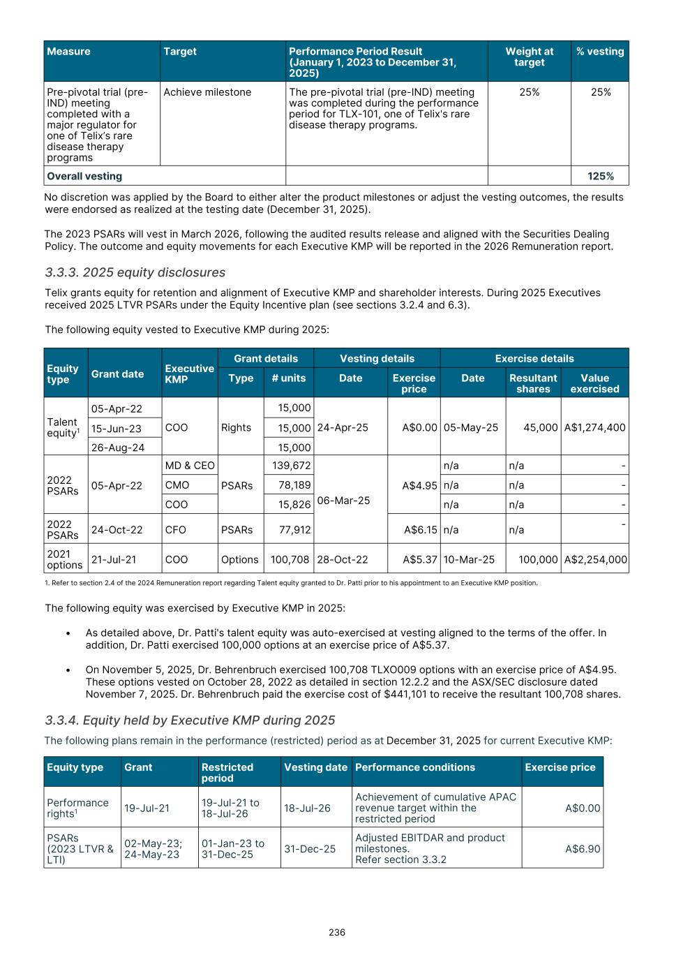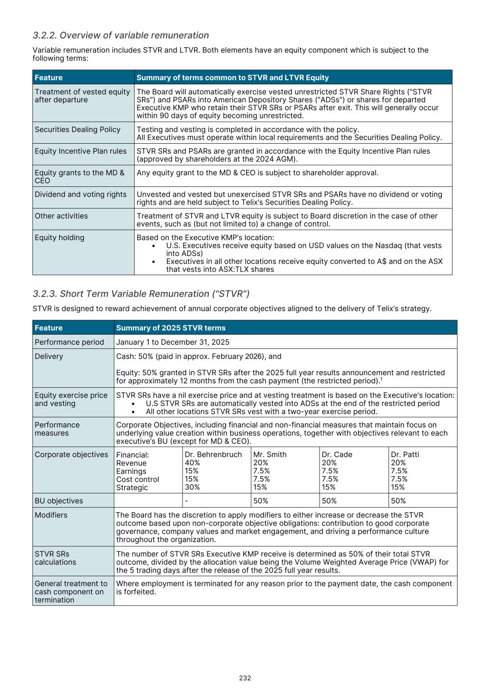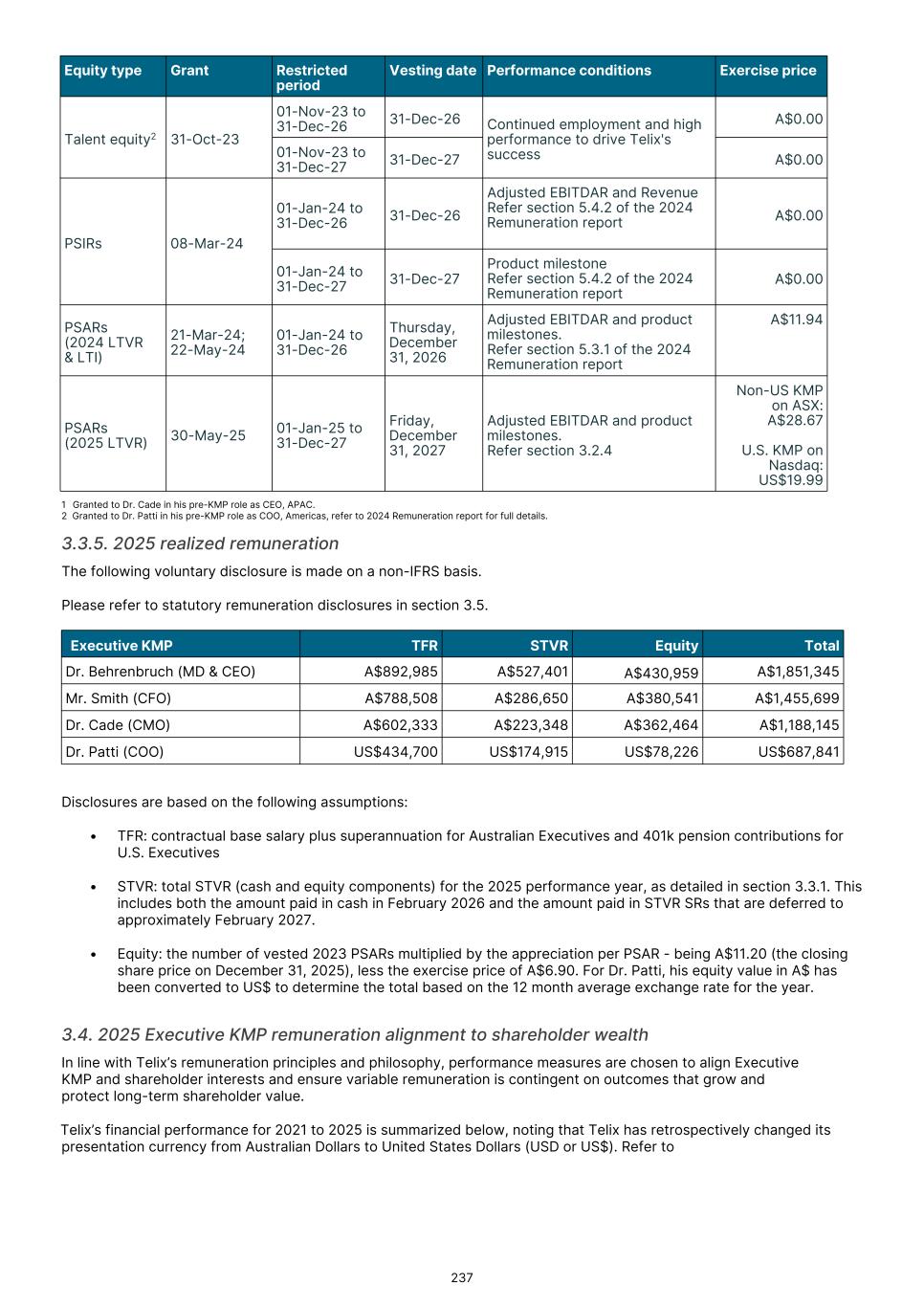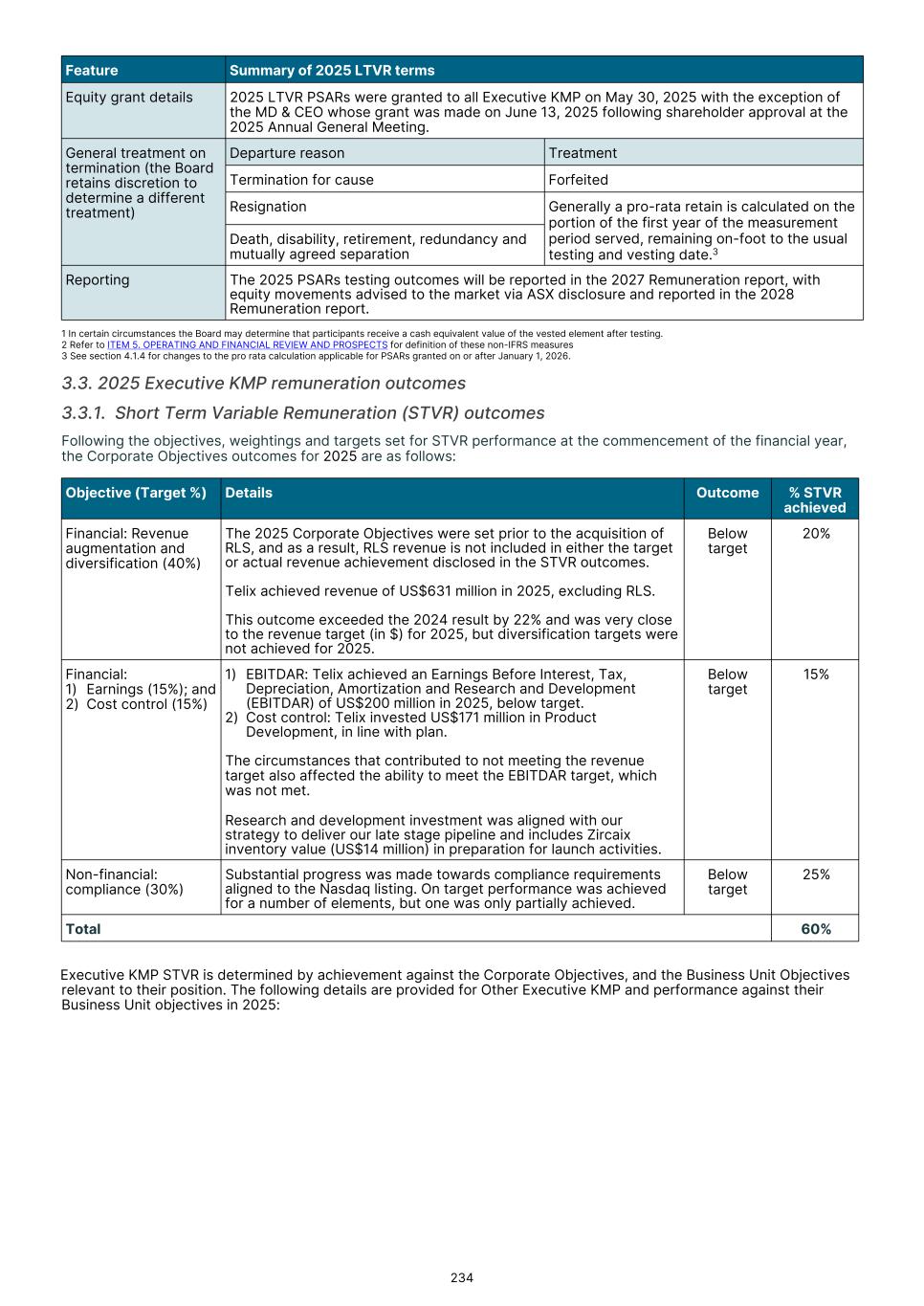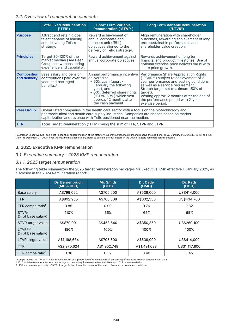 MD & CEO remuneration, which incorporated fixed remuneration of base salary, superannuation and leave accruals was US$556,718 for the 2025 year. An STVR outcome of US$339,874was awarded to the MD & CEO for the 2025 outcomes based on performance detailed in section 3.3.1, of which 50% will be deferred to equity and will be presented to shareholders for approval at the 2026 Annual General Meeting. No Board adjustment applied As detailed in section 3.3.1, the STVR is calculated based upon the achievement against the Corporate Objectives (100% for MD & CEO and 50% for Executive KMP) and Business Unit objectives (50% for Executive KMP excluding the MD & CEO). The Board considers application of a Values Modifier up or down, however in 2025 the Board exercised no discretion to modify the STVR outcomes for any Executive KMP. No Board discretion was applied to the 2023 LTVR PSAR vesting outcome. Commentary is provided on each measure in section 3.3.2, with the Board endorsing the results as they were realized, with no positive or negative discretion applied. Remuneration changes in 2025 Each year we engage with numerous stakeholders to ensure our Remuneration Framework is appropriate for the needs of Telix and aligned to long-term shareholder interests. Executive KMP remuneration changes adopted in 2025 were aligned with remuneration recommendations prepared by Mercer Consulting (Australia) Pty Ltd ("Mercer") (under section 9B of the Australian Corporations Act 2001 (Cth)) in 2023. These changes were disclosed in the 2024 Remuneration report, and are detailed in section 3. Non-Executive Director ("NED") equity plans were also introduced in 2025. These were disclosed in the 2024 Remuneration report and 2025 Notice of Meeting, and are detailed in section 5.2. The introduction of the Employee Stock Purchase Plan ("ESPP") in the U.S. and an Australian ESPP, allow employees (including Executive KMP, but excluding the CEO) to purchase Telix shares (Australian employees) or American Depository Shares (U.S. employees). Details were provided in the 2025 Notice of Meeting and in sections 6.3 and 6.4. KMP changes in 2025 As mentioned in the Message from the Chair, there were three KMP changes in 2025: the retirement of Mr. Kevin McCann AO, the appointment of Ms. Tiffany Olson to the Chair of the Board1, and my appointment as Non-Executive Director and Chair of the People Committee. There were no changes to Executive KMP. Telix 2026 remuneration Benchmarking and updates During 2025, the Board engaged Mercer to provide updated market benchmarking for all KMP (Executives and Non- Executive Directors). This benchmarking review was timely due to Telix’s significant growth since the 2023 remuneration benchmarking exercise. Unlike 2023, Mercer was not requested to make a recommendation, but instead provided market data for Board consideration. A global peer group of 40 companies was established with Telix positioned near the median for metrics such as market capitalization and revenue, based on six month average data to June 30, 2025. For NEDs, ASX peer groups were also considered. Given the changes in Telix’s share price during the year, updated data as to Telix’s positioning in the peer groups, as at end of October 2025, was also obtained. The June 30 data indicated that current executive KMP remuneration was significantly below the benchmark median. The October data also confirmed that remuneration remained below Telix’s then position in the global peer group. Having regard to the shareholder experience in 2025, the Board decided not to make any material changes to all KMP (Executives and NEDs) remuneration opportunity for 2026 (other than those mentioned below). Further details regarding the insights and changes to KMP remuneration for 2026 as a result of the 2025 review are provided in sections 4 and 5.4. 17 1 Ms. Olson resigned from the Board effective February 3, 2026.