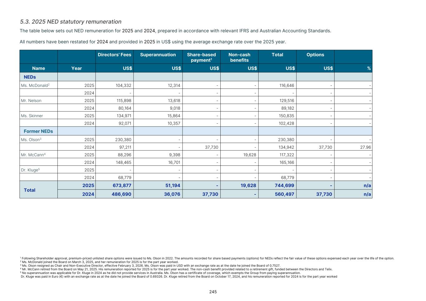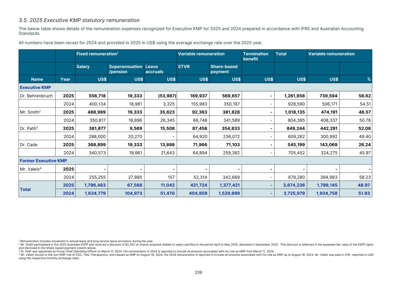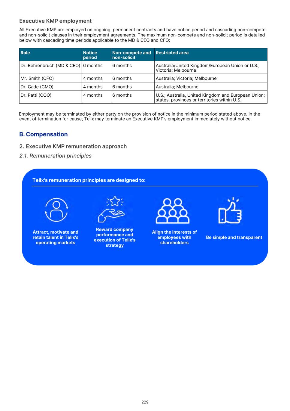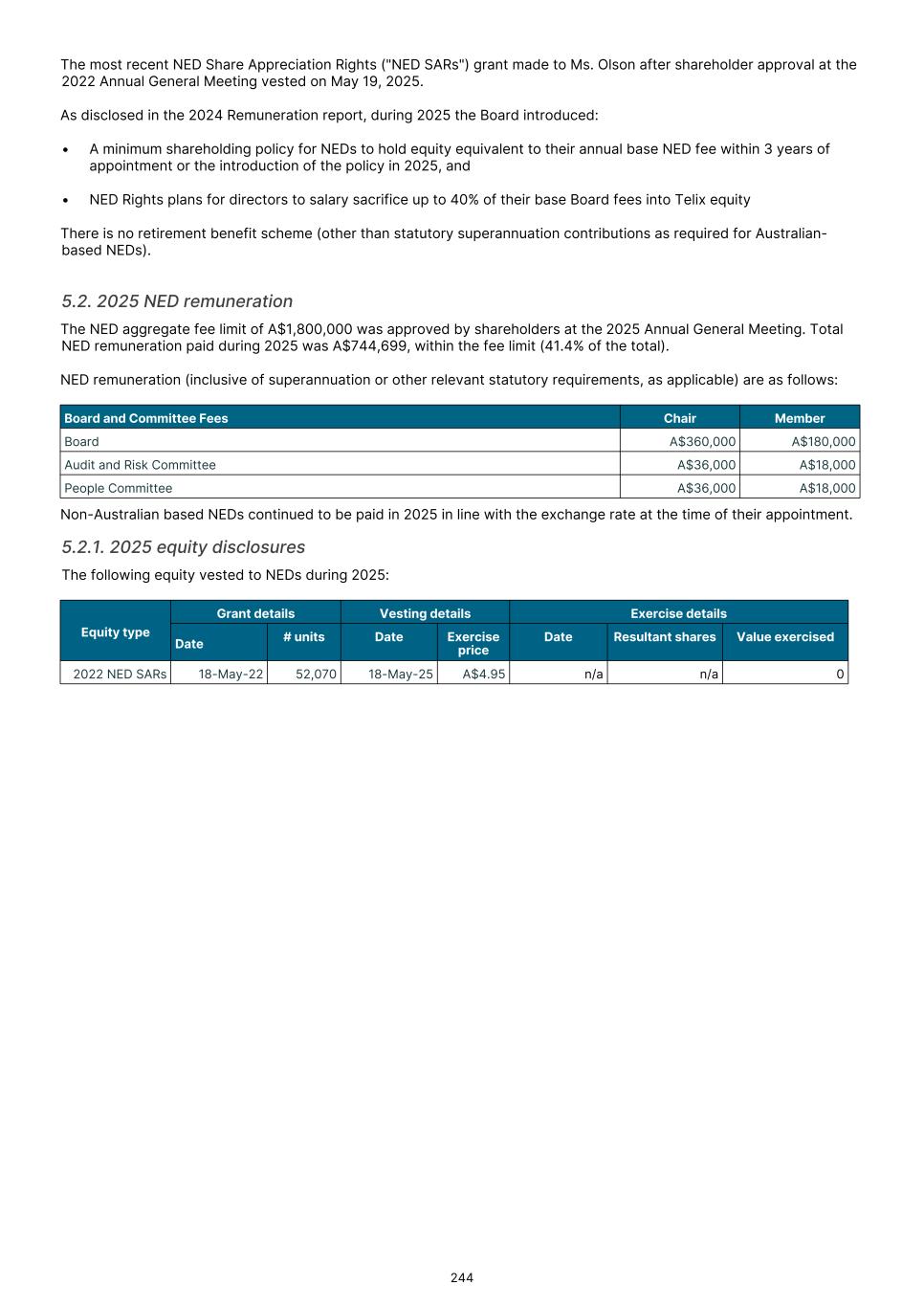 MD & CEO remuneration, which incorporated fixed remuneration of base salary, superannuation and leave accruals was US$556,718 for the 2025 year. An STVR outcome of US$339,874was awarded to the MD & CEO for the 2025 outcomes based on performance detailed in section 3.3.1, of which 50% will be deferred to equity and will be presented to shareholders for approval at the 2026 Annual General Meeting. No Board adjustment applied As detailed in section 3.3.1, the STVR is calculated based upon the achievement against the Corporate Objectives (100% for MD & CEO and 50% for Executive KMP) and Business Unit objectives (50% for Executive KMP excluding the MD & CEO). The Board considers application of a Values Modifier up or down, however in 2025 the Board exercised no discretion to modify the STVR outcomes for any Executive KMP. No Board discretion was applied to the 2023 LTVR PSAR vesting outcome. Commentary is provided on each measure in section 3.3.2, with the Board endorsing the results as they were realized, with no positive or negative discretion applied. Remuneration changes in 2025 Each year we engage with numerous stakeholders to ensure our Remuneration Framework is appropriate for the needs of Telix and aligned to long-term shareholder interests. Executive KMP remuneration changes adopted in 2025 were aligned with remuneration recommendations prepared by Mercer Consulting (Australia) Pty Ltd ("Mercer") (under section 9B of the Australian Corporations Act 2001 (Cth)) in 2023. These changes were disclosed in the 2024 Remuneration report, and are detailed in section 3. Non-Executive Director ("NED") equity plans were also introduced in 2025. These were disclosed in the 2024 Remuneration report and 2025 Notice of Meeting, and are detailed in section 5.2. The introduction of the Employee Stock Purchase Plan ("ESPP") in the U.S. and an Australian ESPP, allow employees (including Executive KMP, but excluding the CEO) to purchase Telix shares (Australian employees) or American Depository Shares (U.S. employees). Details were provided in the 2025 Notice of Meeting and in sections 6.3 and 6.4. KMP changes in 2025 As mentioned in the Message from the Chair, there were three KMP changes in 2025: the retirement of Mr. Kevin McCann AO, the appointment of Ms. Tiffany Olson to the Chair of the Board1, and my appointment as Non-Executive Director and Chair of the People Committee. There were no changes to Executive KMP. Telix 2026 remuneration Benchmarking and updates During 2025, the Board engaged Mercer to provide updated market benchmarking for all KMP (Executives and Non- Executive Directors). This benchmarking review was timely due to Telix’s significant growth since the 2023 remuneration benchmarking exercise. Unlike 2023, Mercer was not requested to make a recommendation, but instead provided market data for Board consideration. A global peer group of 40 companies was established with Telix positioned near the median for metrics such as market capitalization and revenue, based on six month average data to June 30, 2025. For NEDs, ASX peer groups were also considered. Given the changes in Telix’s share price during the year, updated data as to Telix’s positioning in the peer groups, as at end of October 2025, was also obtained. The June 30 data indicated that current executive KMP remuneration was significantly below the benchmark median. The October data also confirmed that remuneration remained below Telix’s then position in the global peer group. Having regard to the shareholder experience in 2025, the Board decided not to make any material changes to all KMP (Executives and NEDs) remuneration opportunity for 2026 (other than those mentioned below). Further details regarding the insights and changes to KMP remuneration for 2026 as a result of the 2025 review are provided in sections 4 and 5.4. 17 1 Ms. Olson resigned from the Board effective February 3, 2026.