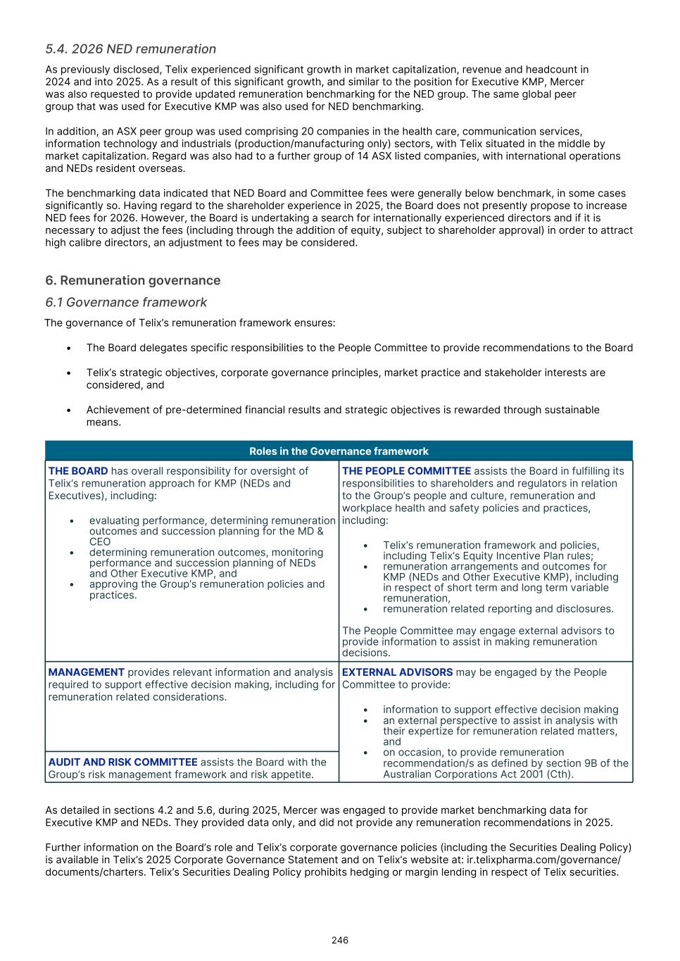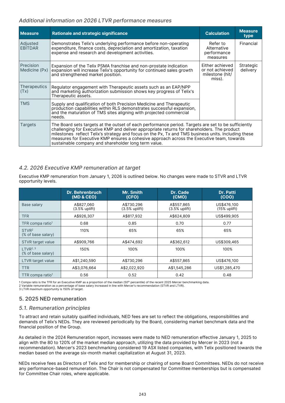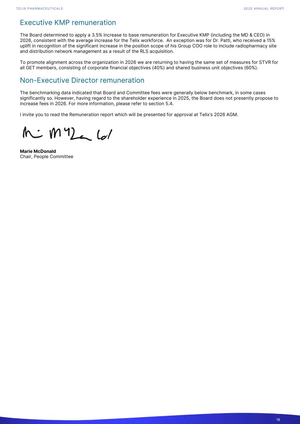 Executive KMP remuneration The Board determined to apply a 3.5% increase to base remuneration for Executive KMP (including the MD & CEO) in 2026, consistent with the average increase for the Telix workforce. An exception was for Dr. Patti, who received a 15% uplift in recognition of the significant increase in the position scope of his Group COO role to include radiopharmacy site and distribution network management as a result of the RLS acquisition. To promote alignment across the organization in 2026 we are returning to having the same set of measures for STVR for all GET members, consisting of corporate financial objectives (40%) and shared business unit objectives (60%). Non-Executive Director remuneration The benchmarking data indicated that Board and Committee fees were generally below benchmark, in some cases significantly so. However, having regard to the shareholder experience in 2025, the Board does not presently propose to increase fees in 2026. For more information, please refer to section 5.4. I invite you to read the Remuneration report which will be presented for approval at Telix’s 2026 AGM. Marie McDonald Chair, People Committee 18
