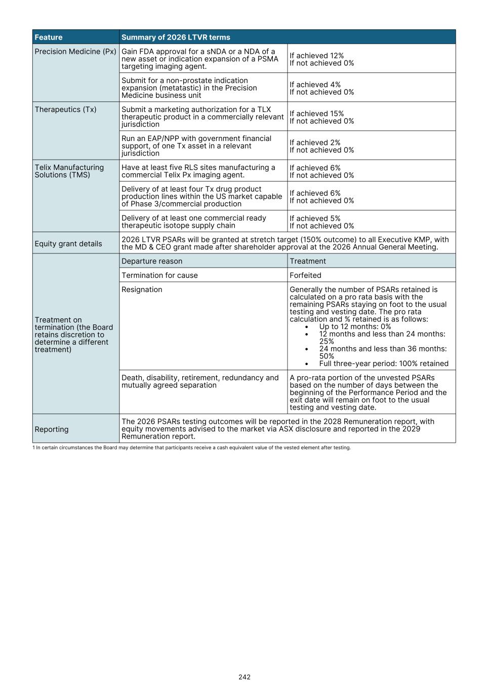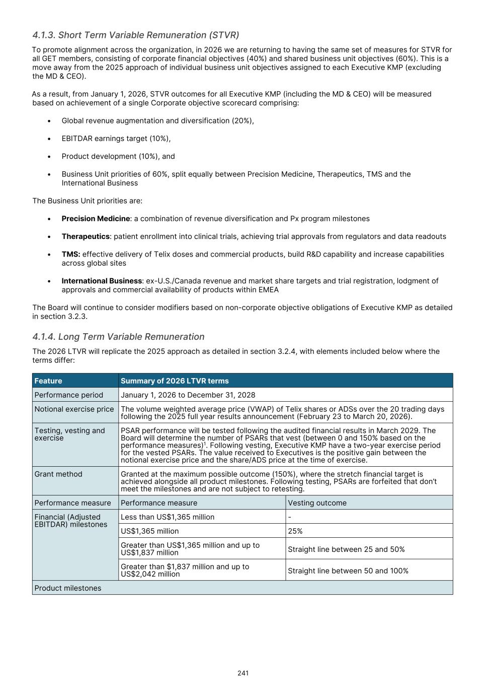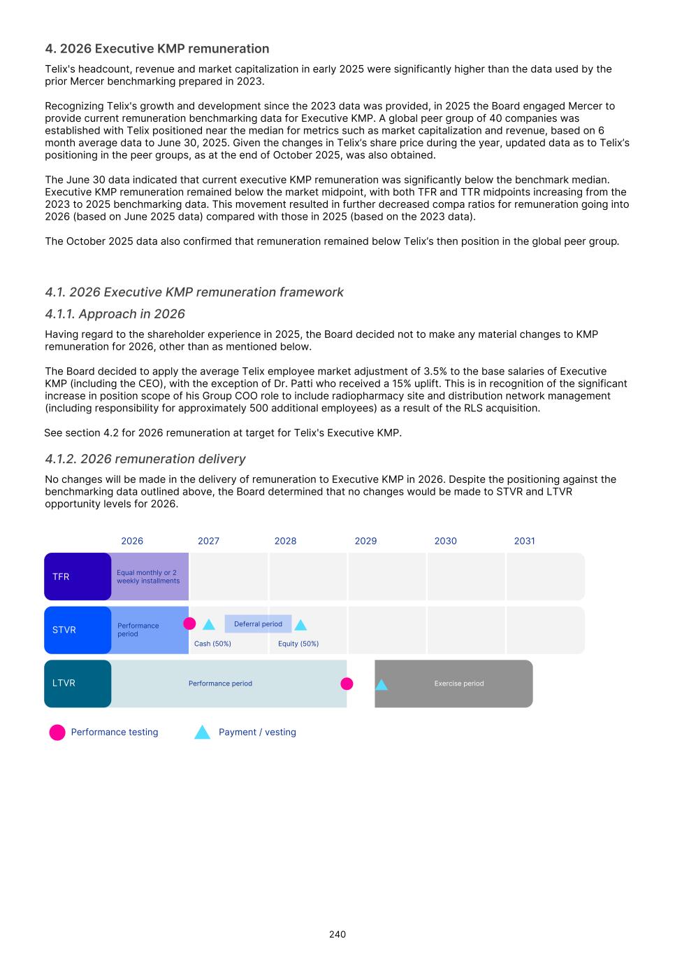Executive KMP remuneration The Board determined to apply a 3.5% increase to base remuneration for Executive KMP (including the MD & CEO) in 2026, consistent with the average increase for the Telix workforce. An exception was for Dr. Patti, who received a 15% uplift in recognition of the significant increase in the position scope of his Group COO role to include radiopharmacy site and distribution network management as a result of the RLS acquisition. To promote alignment across the organization in 2026 we are returning to having the same set of measures for STVR for all GET members, consisting of corporate financial objectives (40%) and shared business unit objectives (60%). Non-Executive Director remuneration The benchmarking data indicated that Board and Committee fees were generally below benchmark, in some cases significantly so. However, having regard to the shareholder experience in 2025, the Board does not presently propose to increase fees in 2026. For more information, please refer to section 5.4. I invite you to read the Remuneration report which will be presented for approval at Telix’s 2026 AGM. Marie McDonald Chair, People Committee 18