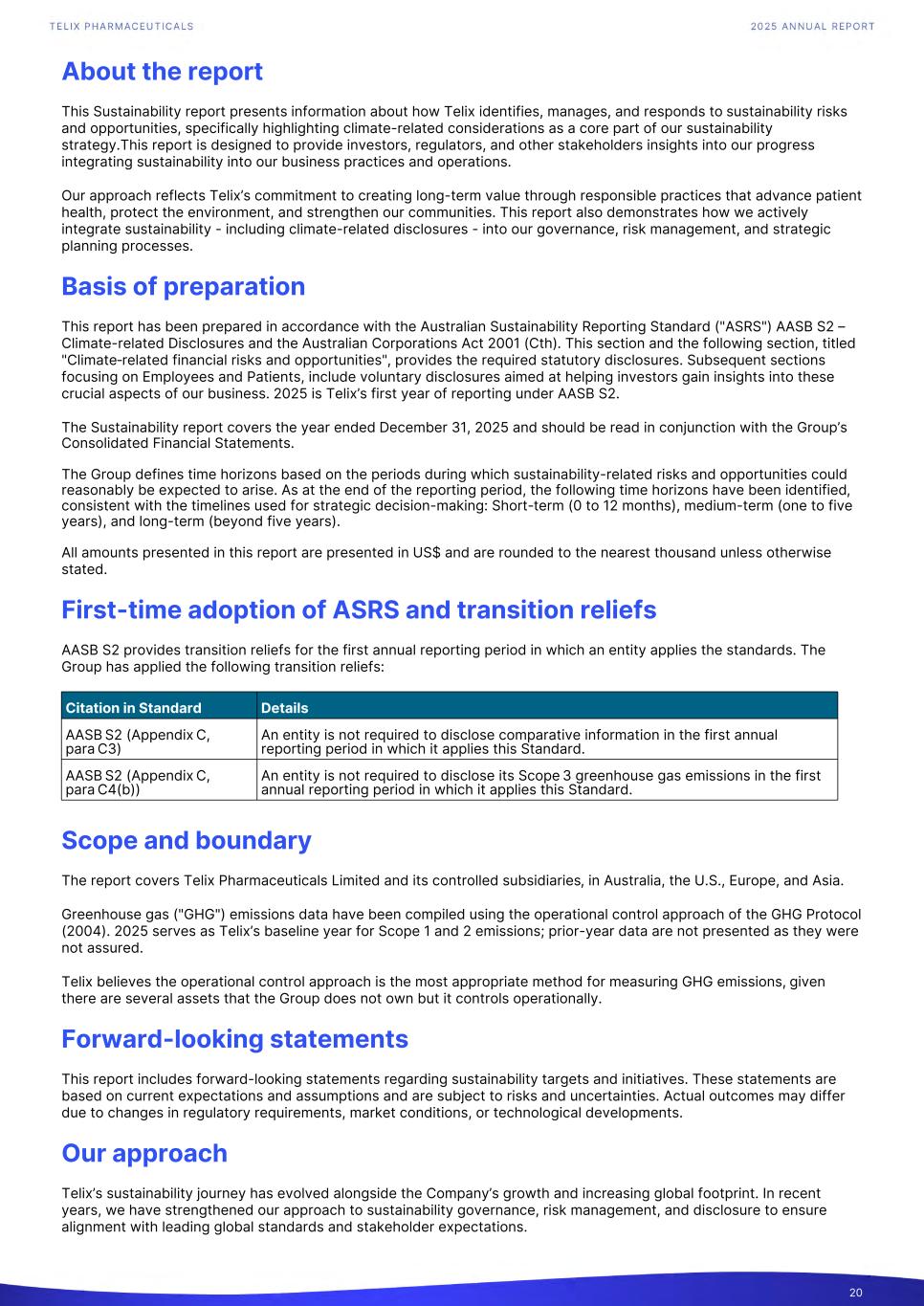 About the report This Sustainability report presents information about how Telix identifies, manages, and responds to sustainability risks and opportunities, specifically highlighting climate-related considerations as a core part of our sustainability strategy.This report is designed to provide investors, regulators, and other stakeholders insights into our progress integrating sustainability into our business practices and operations. Our approach reflects Telix’s commitment to creating long-term value through responsible practices that advance patient health, protect the environment, and strengthen our communities. This report also demonstrates how we actively integrate sustainability - including climate-related disclosures - into our governance, risk management, and strategic planning processes. Basis of preparation This report has been prepared in accordance with the Australian Sustainability Reporting Standard ("ASRS") AASB S2 – Climate-related Disclosures and the Australian Corporations Act 2001 (Cth). This section and the following section, titled "Climate‑related financial risks and opportunities", provides the required statutory disclosures. Subsequent sections focusing on Employees and Patients, include voluntary disclosures aimed at helping investors gain insights into these crucial aspects of our business. 2025 is Telix’s first year of reporting under AASB S2. The Sustainability report covers the year ended December 31, 2025 and should be read in conjunction with the Group’s Consolidated Financial Statements. The Group defines time horizons based on the periods during which sustainability-related risks and opportunities could reasonably be expected to arise. As at the end of the reporting period, the following time horizons have been identified, consistent with the timelines used for strategic decision-making: Short-term (0 to 12 months), medium-term (one to five years), and long-term (beyond five years). All amounts presented in this report are presented in US$ and are rounded to the nearest thousand unless otherwise stated. First-time adoption of ASRS and transition reliefs AASB S2 provides transition reliefs for the first annual reporting period in which an entity applies the standards. The Group has applied the following transition reliefs: Citation in Standard Details AASB S2 (Appendix C, para C3) An entity is not required to disclose comparative information in the first annual reporting period in which it applies this Standard. AASB S2 (Appendix C, para C4(b)) An entity is not required to disclose its Scope 3 greenhouse gas emissions in the first annual reporting period in which it applies this Standard. Scope and boundary The report covers Telix Pharmaceuticals Limited and its controlled subsidiaries, in Australia, the U.S., Europe, and Asia. Greenhouse gas ("GHG") emissions data have been compiled using the operational control approach of the GHG Protocol (2004). 2025 serves as Telix’s baseline year for Scope 1 and 2 emissions; prior-year data are not presented as they were not assured. Telix believes the operational control approach is the most appropriate method for measuring GHG emissions, given there are several assets that the Group does not own but it controls operationally. Forward-looking statements This report includes forward-looking statements regarding sustainability targets and initiatives. These statements are based on current expectations and assumptions and are subject to risks and uncertainties. Actual outcomes may differ due to changes in regulatory requirements, market conditions, or technological developments. Our approach Telix’s sustainability journey has evolved alongside the Company’s growth and increasing global footprint. In recent years, we have strengthened our approach to sustainability governance, risk management, and disclosure to ensure alignment with leading global standards and stakeholder expectations. 20