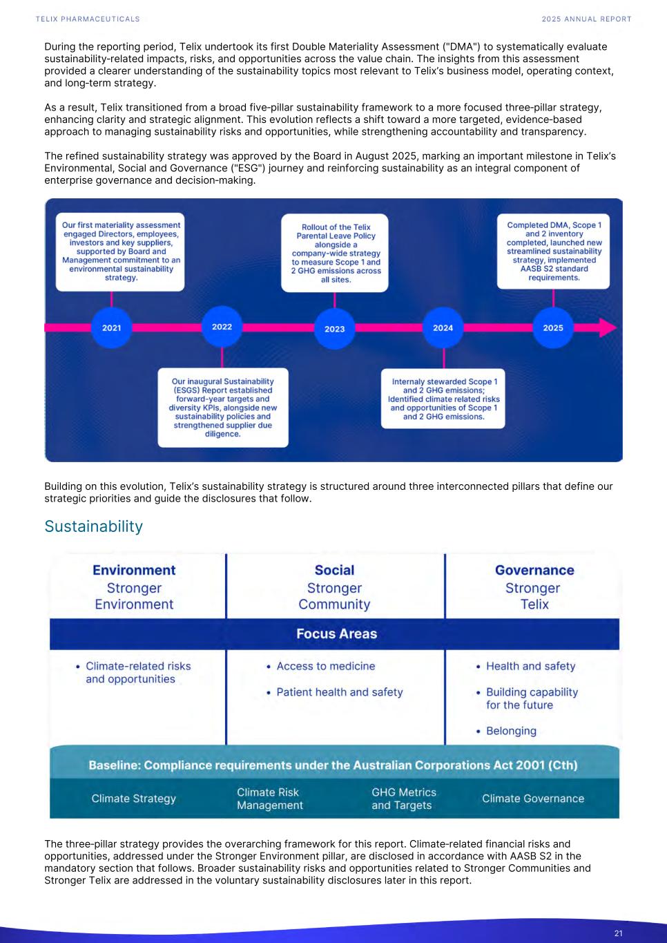 During the reporting period, Telix undertook its first Double Materiality Assessment ("DMA") to systematically evaluate sustainability‑related impacts, risks, and opportunities across the value chain. The insights from this assessment provided a clearer understanding of the sustainability topics most relevant to Telix’s business model, operating context, and long‑term strategy. As a result, Telix transitioned from a broad five‑pillar sustainability framework to a more focused three‑pillar strategy, enhancing clarity and strategic alignment. This evolution reflects a shift toward a more targeted, evidence‑based approach to managing sustainability risks and opportunities, while strengthening accountability and transparency. The refined sustainability strategy was approved by the Board in August 2025, marking an important milestone in Telix’s Environmental, Social and Governance ("ESG") journey and reinforcing sustainability as an integral component of enterprise governance and decision‑making. Building on this evolution, Telix’s sustainability strategy is structured around three interconnected pillars that define our strategic priorities and guide the disclosures that follow. Sustainability The three‑pillar strategy provides the overarching framework for this report. Climate‑related financial risks and opportunities, addressed under the Stronger Environment pillar, are disclosed in accordance with AASB S2 in the mandatory section that follows. Broader sustainability risks and opportunities related to Stronger Communities and Stronger Telix are addressed in the voluntary sustainability disclosures later in this report. 21
