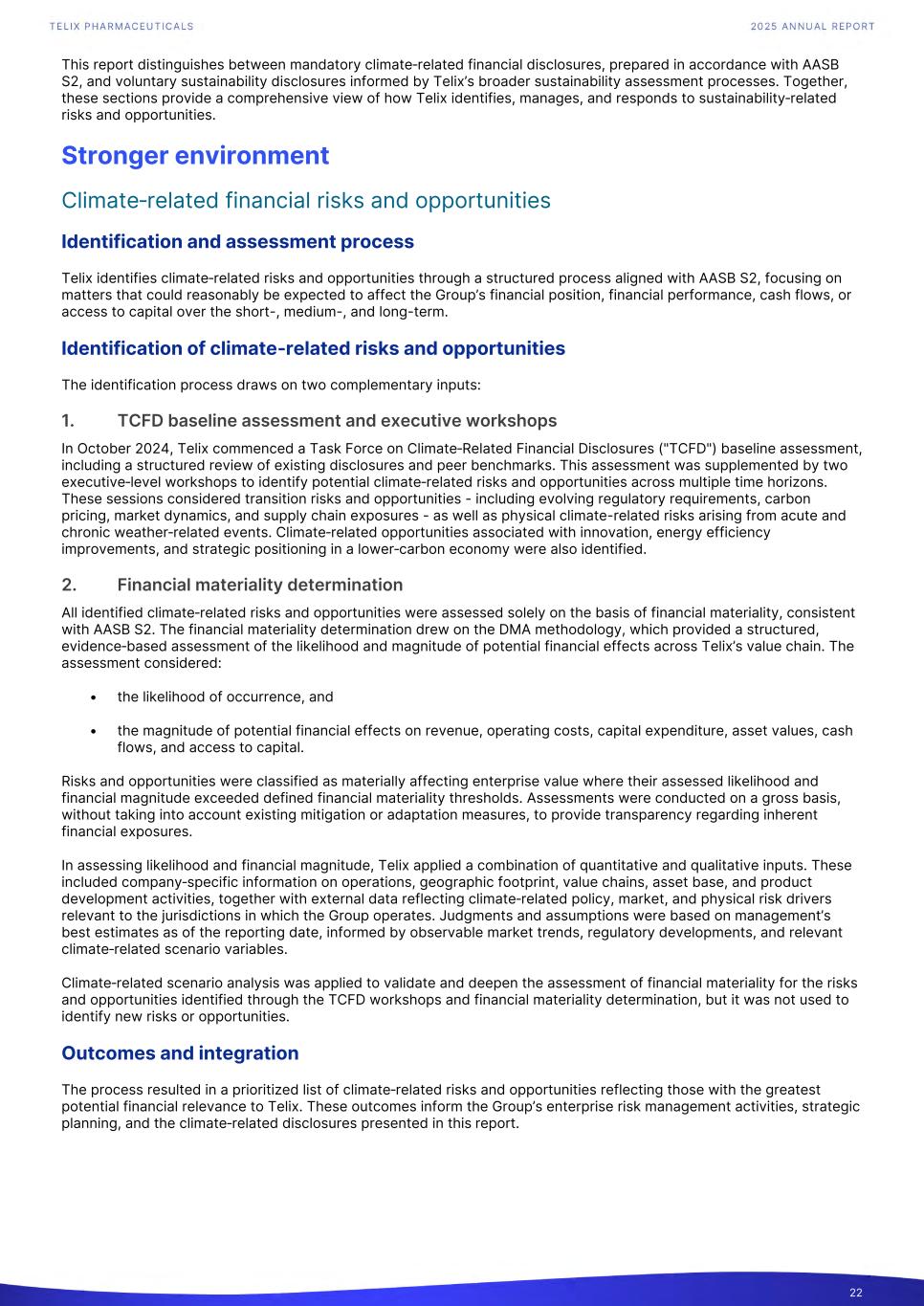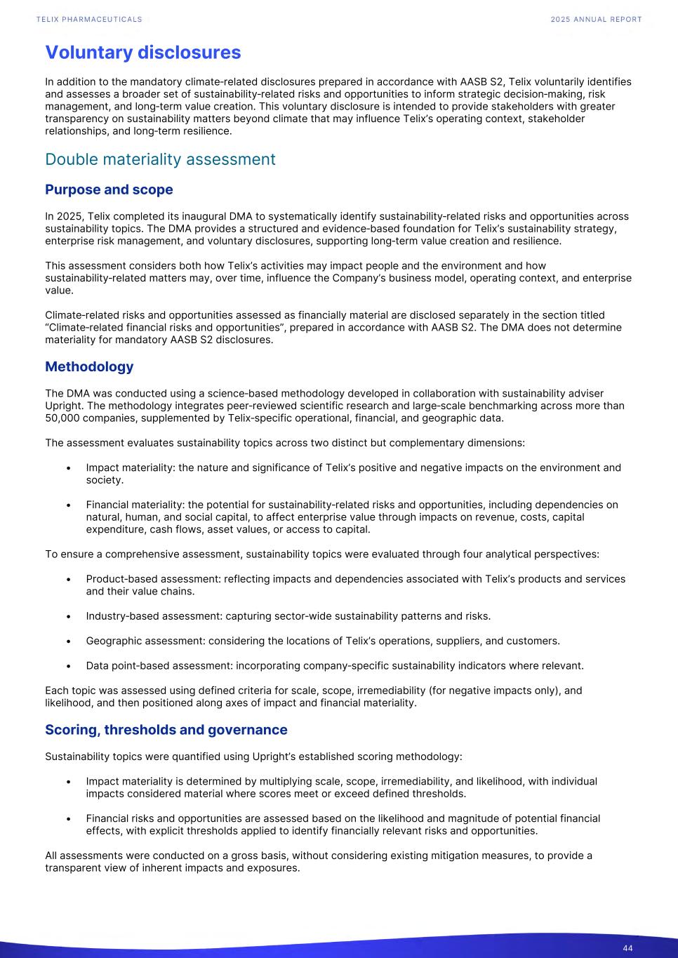 Voluntary disclosures In addition to the mandatory climate‑related disclosures prepared in accordance with AASB S2, Telix voluntarily identifies and assesses a broader set of sustainability‑related risks and opportunities to inform strategic decision‑making, risk management, and long‑term value creation. This voluntary disclosure is intended to provide stakeholders with greater transparency on sustainability matters beyond climate that may influence Telix’s operating context, stakeholder relationships, and long‑term resilience. Double materiality assessment Purpose and scope In 2025, Telix completed its inaugural DMA to systematically identify sustainability‑related risks and opportunities across sustainability topics. The DMA provides a structured and evidence‑based foundation for Telix’s sustainability strategy, enterprise risk management, and voluntary disclosures, supporting long‑term value creation and resilience. This assessment considers both how Telix’s activities may impact people and the environment and how sustainability‑related matters may, over time, influence the Company’s business model, operating context, and enterprise value. Climate‑related risks and opportunities assessed as financially material are disclosed separately in the section titled “Climate‑related financial risks and opportunities”, prepared in accordance with AASB S2. The DMA does not determine materiality for mandatory AASB S2 disclosures. Methodology The DMA was conducted using a science‑based methodology developed in collaboration with sustainability adviser Upright. The methodology integrates peer‑reviewed scientific research and large‑scale benchmarking across more than 50,000 companies, supplemented by Telix‑specific operational, financial, and geographic data. The assessment evaluates sustainability topics across two distinct but complementary dimensions: • Impact materiality: the nature and significance of Telix’s positive and negative impacts on the environment and society. • Financial materiality: the potential for sustainability‑related risks and opportunities, including dependencies on natural, human, and social capital, to affect enterprise value through impacts on revenue, costs, capital expenditure, cash flows, asset values, or access to capital. To ensure a comprehensive assessment, sustainability topics were evaluated through four analytical perspectives: • Product‑based assessment: reflecting impacts and dependencies associated with Telix’s products and services and their value chains. • Industry‑based assessment: capturing sector‑wide sustainability patterns and risks. • Geographic assessment: considering the locations of Telix’s operations, suppliers, and customers. • Data point‑based assessment: incorporating company‑specific sustainability indicators where relevant. Each topic was assessed using defined criteria for scale, scope, irremediability (for negative impacts only), and likelihood, and then positioned along axes of impact and financial materiality. Scoring, thresholds and governance Sustainability topics were quantified using Upright’s established scoring methodology: • Impact materiality is determined by multiplying scale, scope, irremediability, and likelihood, with individual impacts considered material where scores meet or exceed defined thresholds. • Financial risks and opportunities are assessed based on the likelihood and magnitude of potential financial effects, with explicit thresholds applied to identify financially relevant risks and opportunities. All assessments were conducted on a gross basis, without considering existing mitigation measures, to provide a transparent view of inherent impacts and exposures. 44