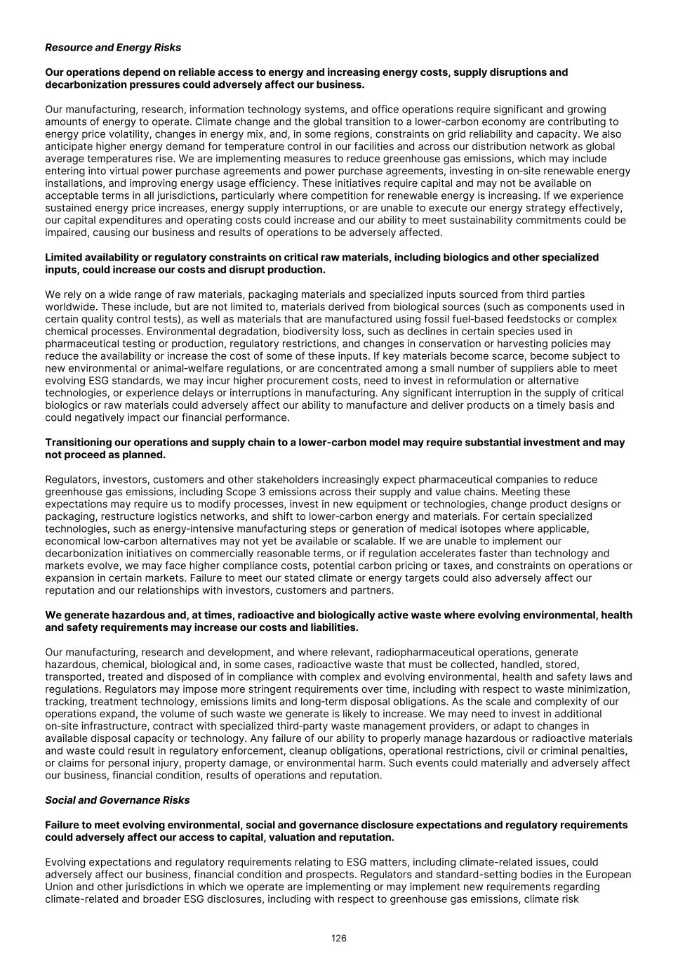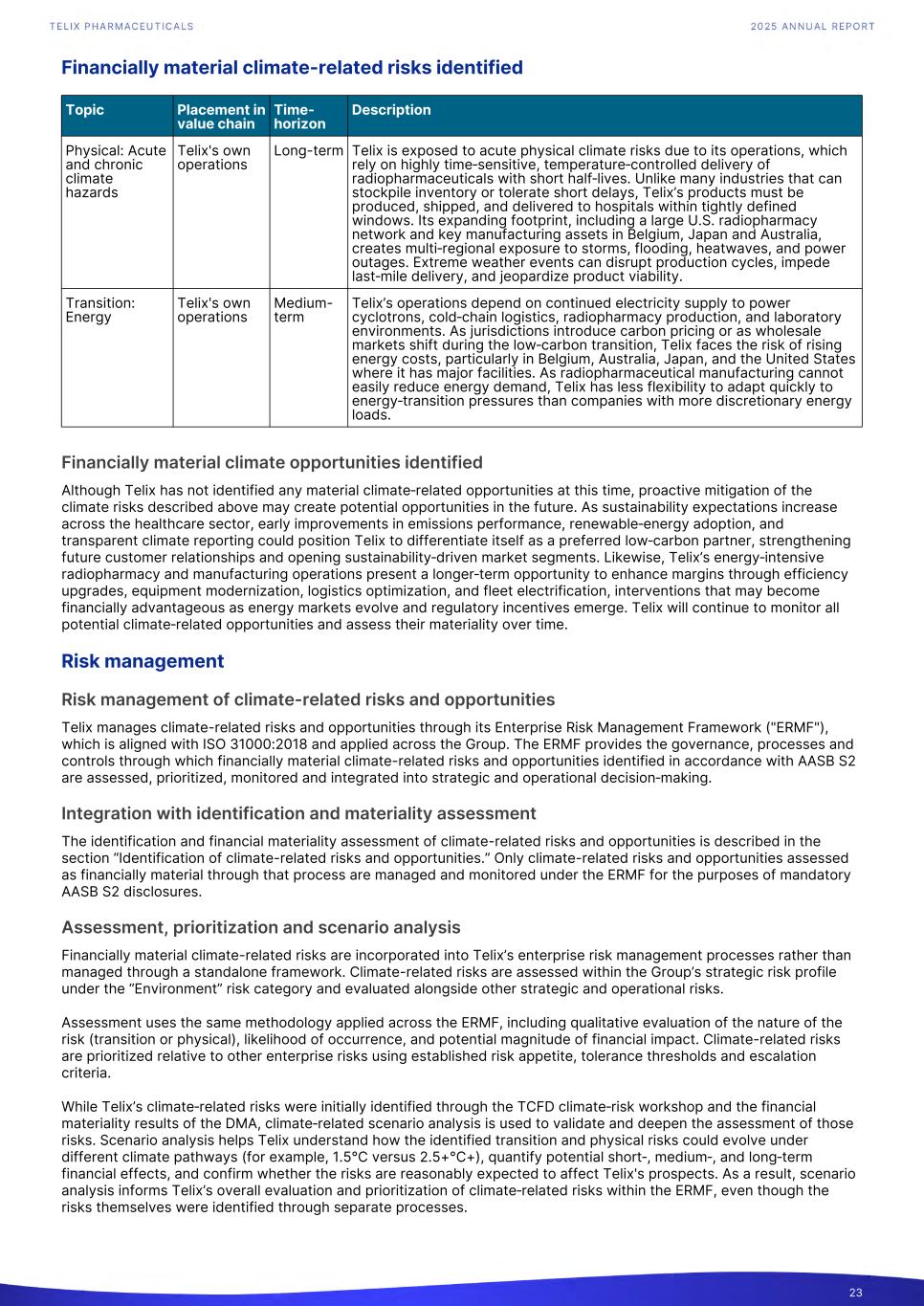 Financially material climate-related risks identified Physical: Acute and chronic climate hazards Telix's own operations Long-term Telix is exposed to acute physical climate risks due to its operations, which rely on highly time‑sensitive, temperature‑controlled delivery of radiopharmaceuticals with short half‑lives. Unlike many industries that can stockpile inventory or tolerate short delays, Telix’s products must be produced, shipped, and delivered to hospitals within tightly defined windows. Its expanding footprint, including a large U.S. radiopharmacy network and key manufacturing assets in Belgium, Japan and Australia, creates multi‑regional exposure to storms, flooding, heatwaves, and power outages. Extreme weather events can disrupt production cycles, impede last‑mile delivery, and jeopardize product viability. Transition: Energy Telix's own operations Medium- term Telix’s operations depend on continued electricity supply to power cyclotrons, cold‑chain logistics, radiopharmacy production, and laboratory environments. As jurisdictions introduce carbon pricing or as wholesale markets shift during the low‑carbon transition, Telix faces the risk of rising energy costs, particularly in Belgium, Australia, Japan, and the United States where it has major facilities. As radiopharmaceutical manufacturing cannot easily reduce energy demand, Telix has less flexibility to adapt quickly to energy‑transition pressures than companies with more discretionary energy loads. Topic Placement in value chain Time- horizon Description Financially material climate opportunities identified Although Telix has not identified any material climate‑related opportunities at this time, proactive mitigation of the climate risks described above may create potential opportunities in the future. As sustainability expectations increase across the healthcare sector, early improvements in emissions performance, renewable‑energy adoption, and transparent climate reporting could position Telix to differentiate itself as a preferred low‑carbon partner, strengthening future customer relationships and opening sustainability‑driven market segments. Likewise, Telix’s energy‑intensive radiopharmacy and manufacturing operations present a longer‑term opportunity to enhance margins through efficiency upgrades, equipment modernization, logistics optimization, and fleet electrification, interventions that may become financially advantageous as energy markets evolve and regulatory incentives emerge. Telix will continue to monitor all potential climate‑related opportunities and assess their materiality over time. Risk management Risk management of climate-related risks and opportunities Telix manages climate-related risks and opportunities through its Enterprise Risk Management Framework ("ERMF"), which is aligned with ISO 31000:2018 and applied across the Group. The ERMF provides the governance, processes and controls through which financially material climate-related risks and opportunities identified in accordance with AASB S2 are assessed, prioritized, monitored and integrated into strategic and operational decision‑making. Integration with identification and materiality assessment The identification and financial materiality assessment of climate-related risks and opportunities is described in the section “Identification of climate-related risks and opportunities.” Only climate-related risks and opportunities assessed as financially material through that process are managed and monitored under the ERMF for the purposes of mandatory AASB S2 disclosures. Assessment, prioritization and scenario analysis Financially material climate-related risks are incorporated into Telix’s enterprise risk management processes rather than managed through a standalone framework. Climate-related risks are assessed within the Group’s strategic risk profile under the “Environment” risk category and evaluated alongside other strategic and operational risks. Assessment uses the same methodology applied across the ERMF, including qualitative evaluation of the nature of the risk (transition or physical), likelihood of occurrence, and potential magnitude of financial impact. Climate-related risks are prioritized relative to other enterprise risks using established risk appetite, tolerance thresholds and escalation criteria. While Telix’s climate‑related risks were initially identified through the TCFD climate‑risk workshop and the financial materiality results of the DMA, climate‑related scenario analysis is used to validate and deepen the assessment of those risks. Scenario analysis helps Telix understand how the identified transition and physical risks could evolve under different climate pathways (for example, 1.5°C versus 2.5+°C+), quantify potential short‑, medium‑, and long‑term financial effects, and confirm whether the risks are reasonably expected to affect Telix's prospects. As a result, scenario analysis informs Telix’s overall evaluation and prioritization of climate‑related risks within the ERMF, even though the risks themselves were identified through separate processes. 23