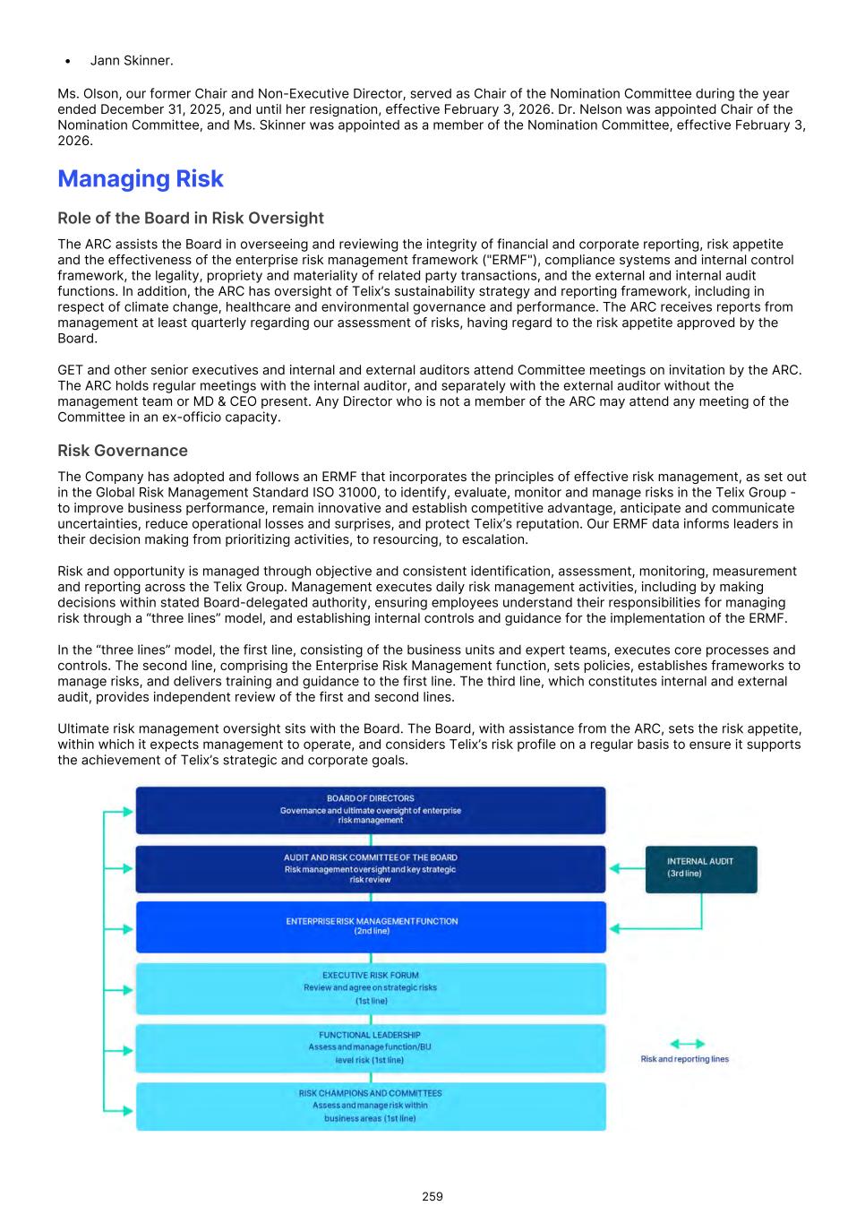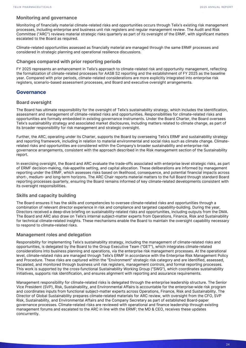 Monitoring and governance Monitoring of financially material climate-related risks and opportunities occurs through Telix’s existing risk management processes, including enterprise and business unit risk registers and regular management review. The Audit and Risk Committee ("ARC") reviews material strategic risks quarterly as part of its oversight of the ERMF, with significant matters escalated to the Board as required. Climate-related opportunities assessed as financially material are managed through the same ERMF processes and considered in strategic planning and operational resilience discussions. Changes compared with prior reporting periods FY 2025 represents an enhancement in Telix’s approach to climate-related risk and opportunity management, reflecting the formalization of climate-related processes for AASB S2 reporting and the establishment of FY 2025 as the baseline year. Compared with prior periods, climate-related considerations are more explicitly integrated into enterprise risk registers, scenario-based assessment processes, and Board and executive oversight arrangements. Governance Board oversight The Board has ultimate responsibility for the oversight of Telix’s sustainability strategy, which includes the identification, assessment and management of climate-related risks and opportunities. Responsibilities for climate‑related risks and opportunities are formally embedded in existing governance instruments. Under the Board Charter, the Board oversees Telix’s sustainability strategy and associated market disclosures, including matters related to climate change, as part of its broader responsibility for risk management and strategic oversight. Further, the ARC, operating under its Charter, supports the Board by overseeing Telix’s ERMF and sustainability strategy and reporting framework, including in relation to material environmental and social risks such as climate change. Climate- related risks and opportunities are considered within the Company’s broader sustainability and enterprise risk governance arrangements, consistent with the approach described in the Risk management section of the Sustainability report. In exercising oversight, the Board and ARC evaluate the trade‑offs associated with enterprise level strategic risks, as part of ERMF decision‑making, risk‑appetite setting, and capital allocation. These deliberations are informed by management reporting under the ERMF, which assesses risks based on likelihood, consequence, and potential financial impacts across short‑, medium‑ and long‑term horizons. The ARC Chair reports material matters to the full Board through standard Board reporting processes quarterly, ensuring the Board remains informed of key climate‑related developments consistent with its oversight responsibilities. Skills and capacity building The Board ensures it has the skills and competencies to oversee climate‑related risks and opportunities through a combination of relevant director experience in risk and compliance and targeted capability‑building. During the year, Directors received a deep‑dive briefing on sustainability‑related risks and opportunities, including outputs from the DMA. The Board and ARC also draw on Telix’s internal subject‑matter experts from Operations, Finance, Risk and Sustainability for technical climate‑related insights. These mechanisms enable the Board to maintain the oversight capability necessary to respond to climate‑related risks. Management roles and delegation Responsibility for implementing Telix’s sustainability strategy, including the management of climate‑related risks and opportunities, is delegated by the Board to the Group Executive Team ("GET"), which integrates climate‑related considerations into business planning and operations, via the enterprise risk management processes. At the operational level, climate‑related risks are managed through Telix’s ERMF in accordance with the Enterprise Risk Management Policy and Procedure. These risks are captured within the “Environment” strategic risk category and are identified, assessed, escalated, and monitored through business unit risk registers, management controls, and formal reporting processes. This work is supported by the cross‑functional Sustainability Working Group ("SWG"), which coordinates sustainability initiatives, supports risk identification, and ensures alignment with reporting and assurance requirements. Management responsibility for climate‑related risks is delegated through the enterprise leadership structure. The Senior Vice President (SVP), Risk, Sustainability, and Environmental Affairs is accountable for the enterprise‑wide risk program and coordinates inputs from functional subject‑matter experts across Operations, Finance, Risk and Sustainability. The Director of Global Sustainability prepares climate‑related materials for ARC review, with oversight from the CFO, SVP Risk, Sustainability, and Environmental Affairs and the Company Secretary as part of established Board‑paper governance processes. Climate‑related risks are reviewed with operational and finance leadership through existing management forums and escalated to the ARC in line with the ERMF; the MD & CEO, receives these updates concurrently. 24