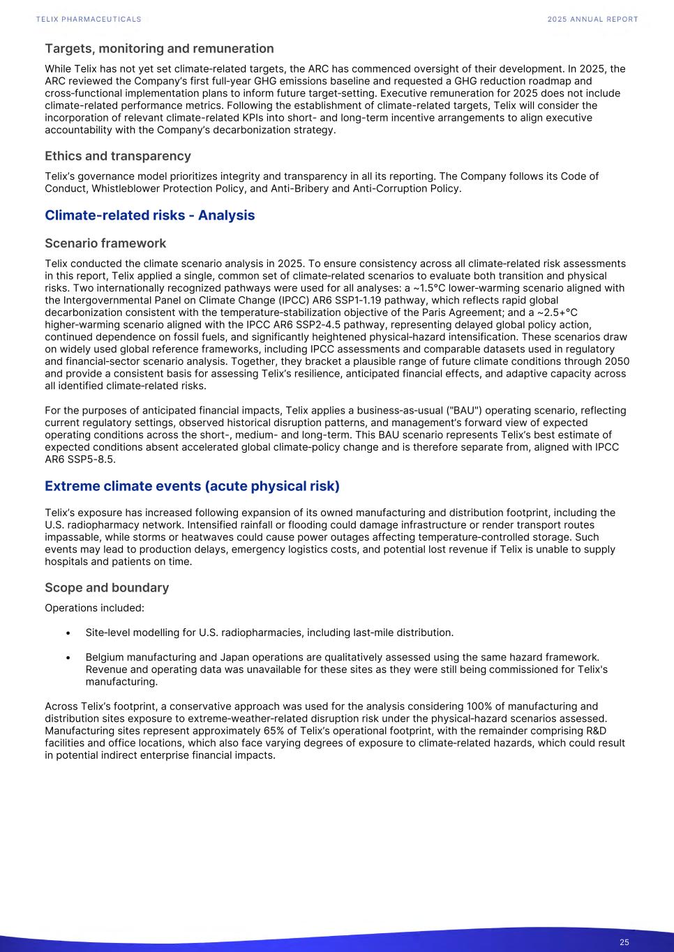 Targets, monitoring and remuneration While Telix has not yet set climate‑related targets, the ARC has commenced oversight of their development. In 2025, the ARC reviewed the Company’s first full‑year GHG emissions baseline and requested a GHG reduction roadmap and cross‑functional implementation plans to inform future target‑setting. Executive remuneration for 2025 does not include climate-related performance metrics. Following the establishment of climate-related targets, Telix will consider the incorporation of relevant climate-related KPIs into short- and long-term incentive arrangements to align executive accountability with the Company’s decarbonization strategy. Ethics and transparency Telix’s governance model prioritizes integrity and transparency in all its reporting. The Company follows its Code of Conduct, Whistleblower Protection Policy, and Anti-Bribery and Anti-Corruption Policy. Climate-related risks - Analysis Scenario framework Telix conducted the climate scenario analysis in 2025. To ensure consistency across all climate‑related risk assessments in this report, Telix applied a single, common set of climate‑related scenarios to evaluate both transition and physical risks. Two internationally recognized pathways were used for all analyses: a ~1.5°C lower‑warming scenario aligned with the Intergovernmental Panel on Climate Change (IPCC) AR6 SSP1‑1.19 pathway, which reflects rapid global decarbonization consistent with the temperature‑stabilization objective of the Paris Agreement; and a ~2.5+°C higher‑warming scenario aligned with the IPCC AR6 SSP2‑4.5 pathway, representing delayed global policy action, continued dependence on fossil fuels, and significantly heightened physical‑hazard intensification. These scenarios draw on widely used global reference frameworks, including IPCC assessments and comparable datasets used in regulatory and financial‑sector scenario analysis. Together, they bracket a plausible range of future climate conditions through 2050 and provide a consistent basis for assessing Telix’s resilience, anticipated financial effects, and adaptive capacity across all identified climate‑related risks. For the purposes of anticipated financial impacts, Telix applies a business‑as‑usual ("BAU") operating scenario, reflecting current regulatory settings, observed historical disruption patterns, and management’s forward view of expected operating conditions across the short-, medium- and long-term. This BAU scenario represents Telix’s best estimate of expected conditions absent accelerated global climate‑policy change and is therefore separate from, aligned with IPCC AR6 SSP5-8.5. Extreme climate events (acute physical risk) Telix’s exposure has increased following expansion of its owned manufacturing and distribution footprint, including the U.S. radiopharmacy network. Intensified rainfall or flooding could damage infrastructure or render transport routes impassable, while storms or heatwaves could cause power outages affecting temperature‑controlled storage. Such events may lead to production delays, emergency logistics costs, and potential lost revenue if Telix is unable to supply hospitals and patients on time. Scope and boundary Operations included: • Site‑level modelling for U.S. radiopharmacies, including last‑mile distribution. • Belgium manufacturing and Japan operations are qualitatively assessed using the same hazard framework. Revenue and operating data was unavailable for these sites as they were still being commissioned for Telix's manufacturing. Across Telix’s footprint, a conservative approach was used for the analysis considering 100% of manufacturing and distribution sites exposure to extreme‑weather‑related disruption risk under the physical‑hazard scenarios assessed. Manufacturing sites represent approximately 65% of Telix’s operational footprint, with the remainder comprising R&D facilities and office locations, which also face varying degrees of exposure to climate‑related hazards, which could result in potential indirect enterprise financial impacts. 25