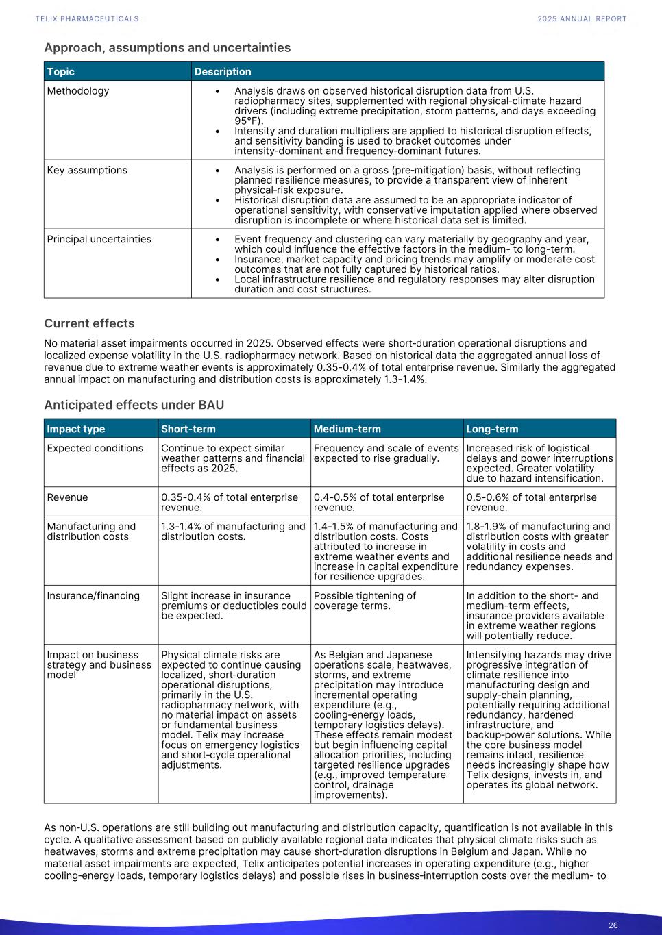 Approach, assumptions and uncertainties Topic Description Methodology • Analysis draws on observed historical disruption data from U.S. radiopharmacy sites, supplemented with regional physical‑climate hazard drivers (including extreme precipitation, storm patterns, and days exceeding 95°F). • Intensity and duration multipliers are applied to historical disruption effects, and sensitivity banding is used to bracket outcomes under intensity‑dominant and frequency‑dominant futures. Key assumptions • Analysis is performed on a gross (pre‑mitigation) basis, without reflecting planned resilience measures, to provide a transparent view of inherent physical‑risk exposure. • Historical disruption data are assumed to be an appropriate indicator of operational sensitivity, with conservative imputation applied where observed disruption is incomplete or where historical data set is limited. Principal uncertainties • Event frequency and clustering can vary materially by geography and year, which could influence the effective factors in the medium- to long-term. • Insurance, market capacity and pricing trends may amplify or moderate cost outcomes that are not fully captured by historical ratios. • Local infrastructure resilience and regulatory responses may alter disruption duration and cost structures. Current effects No material asset impairments occurred in 2025. Observed effects were short‑duration operational disruptions and localized expense volatility in the U.S. radiopharmacy network. Based on historical data the aggregated annual loss of revenue due to extreme weather events is approximately 0.35-0.4% of total enterprise revenue. Similarly the aggregated annual impact on manufacturing and distribution costs is approximately 1.3-1.4%. Anticipated effects under BAU Impact type Short-term Medium-term Long-term Expected conditions Continue to expect similar weather patterns and financial effects as 2025. Frequency and scale of events expected to rise gradually. Increased risk of logistical delays and power interruptions expected. Greater volatility due to hazard intensification. Revenue 0.35-0.4% of total enterprise revenue. 0.4-0.5% of total enterprise revenue. 0.5-0.6% of total enterprise revenue. Manufacturing and distribution costs 1.3-1.4% of manufacturing and distribution costs. 1.4-1.5% of manufacturing and distribution costs. Costs attributed to increase in extreme weather events and increase in capital expenditure for resilience upgrades. 1.8-1.9% of manufacturing and distribution costs with greater volatility in costs and additional resilience needs and redundancy expenses. Insurance/financing Slight increase in insurance premiums or deductibles could be expected. Possible tightening of coverage terms. In addition to the short- and medium-term effects, insurance providers available in extreme weather regions will potentially reduce. Impact on business strategy and business model Physical climate risks are expected to continue causing localized, short‑duration operational disruptions, primarily in the U.S. radiopharmacy network, with no material impact on assets or fundamental business model. Telix may increase focus on emergency logistics and short‑cycle operational adjustments. As Belgian and Japanese operations scale, heatwaves, storms, and extreme precipitation may introduce incremental operating expenditure (e.g., cooling‑energy loads, temporary logistics delays). These effects remain modest but begin influencing capital allocation priorities, including targeted resilience upgrades (e.g., improved temperature control, drainage improvements). Intensifying hazards may drive progressive integration of climate resilience into manufacturing design and supply‑chain planning, potentially requiring additional redundancy, hardened infrastructure, and backup‑power solutions. While the core business model remains intact, resilience needs increasingly shape how Telix designs, invests in, and operates its global network. As non‑U.S. operations are still building out manufacturing and distribution capacity, quantification is not available in this cycle. A qualitative assessment based on publicly available regional data indicates that physical climate risks such as heatwaves, storms and extreme precipitation may cause short‑duration disruptions in Belgium and Japan. While no material asset impairments are expected, Telix anticipates potential increases in operating expenditure (e.g., higher cooling‑energy loads, temporary logistics delays) and possible rises in business‑interruption costs over the medium- to 26