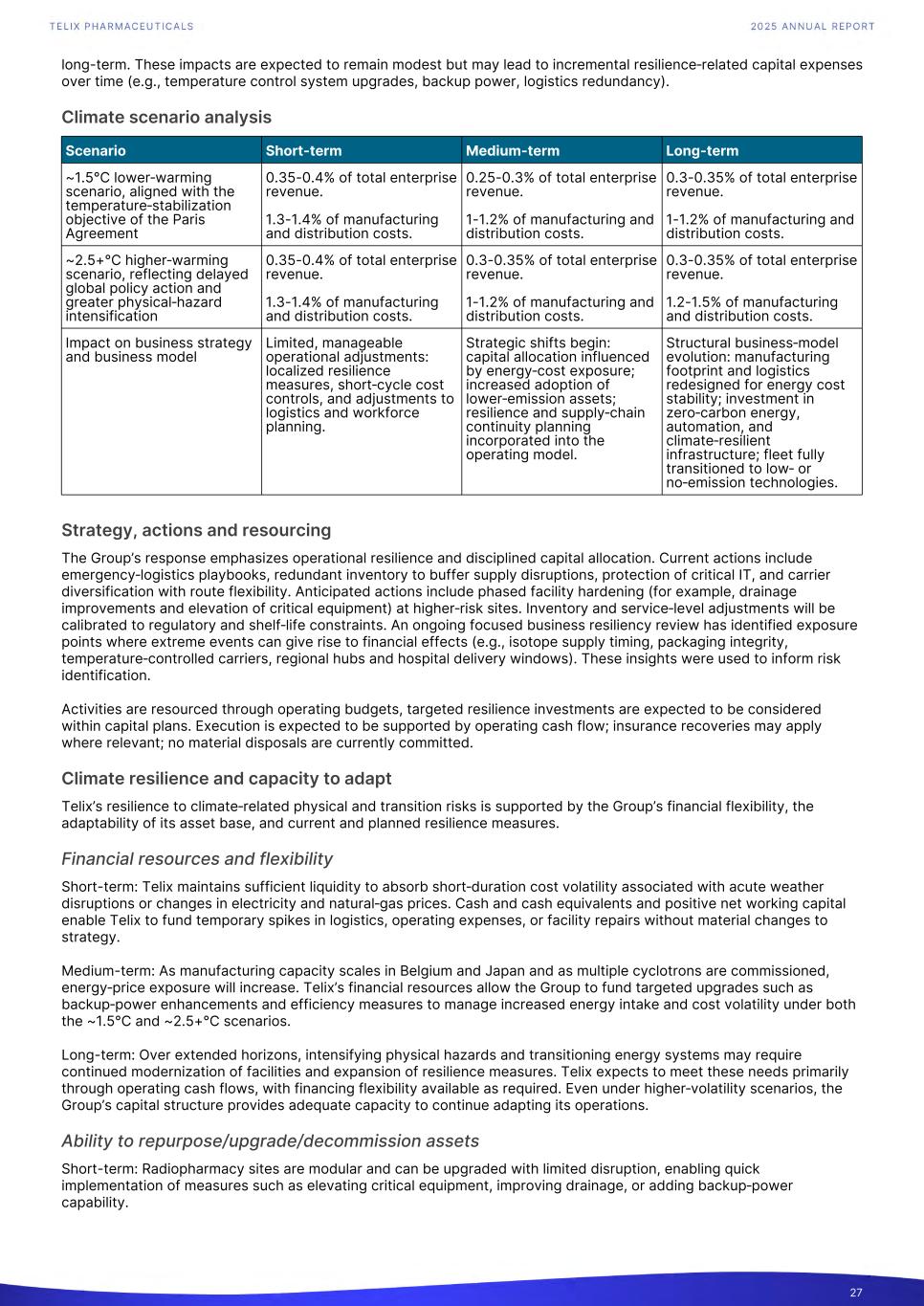 long-term. These impacts are expected to remain modest but may lead to incremental resilience‑related capital expenses over time (e.g., temperature control system upgrades, backup power, logistics redundancy). Climate scenario analysis Scenario Short-term Medium-term Long-term ~1.5°C lower‑warming scenario, aligned with the temperature‑stabilization objective of the Paris Agreement 0.35-0.4% of total enterprise revenue. 1.3-1.4% of manufacturing and distribution costs. 0.25-0.3% of total enterprise revenue. 1-1.2% of manufacturing and distribution costs. 0.3-0.35% of total enterprise revenue. 1-1.2% of manufacturing and distribution costs. ~2.5+°C higher‑warming scenario, reflecting delayed global policy action and greater physical‑hazard intensification 0.35-0.4% of total enterprise revenue. 1.3-1.4% of manufacturing and distribution costs. 0.3-0.35% of total enterprise revenue. 1-1.2% of manufacturing and distribution costs. 0.3-0.35% of total enterprise revenue. 1.2-1.5% of manufacturing and distribution costs. Impact on business strategy and business model Limited, manageable operational adjustments: localized resilience measures, short‑cycle cost controls, and adjustments to logistics and workforce planning. Strategic shifts begin: capital allocation influenced by energy‑cost exposure; increased adoption of lower‑emission assets; resilience and supply‑chain continuity planning incorporated into the operating model. Structural business‑model evolution: manufacturing footprint and logistics redesigned for energy cost stability; investment in zero‑carbon energy, automation, and climate‑resilient infrastructure; fleet fully transitioned to low‑ or no‑emission technologies. Strategy, actions and resourcing The Group’s response emphasizes operational resilience and disciplined capital allocation. Current actions include emergency‑logistics playbooks, redundant inventory to buffer supply disruptions, protection of critical IT, and carrier diversification with route flexibility. Anticipated actions include phased facility hardening (for example, drainage improvements and elevation of critical equipment) at higher‑risk sites. Inventory and service‑level adjustments will be calibrated to regulatory and shelf‑life constraints. An ongoing focused business resiliency review has identified exposure points where extreme events can give rise to financial effects (e.g., isotope supply timing, packaging integrity, temperature‑controlled carriers, regional hubs and hospital delivery windows). These insights were used to inform risk identification. Activities are resourced through operating budgets, targeted resilience investments are expected to be considered within capital plans. Execution is expected to be supported by operating cash flow; insurance recoveries may apply where relevant; no material disposals are currently committed. Climate resilience and capacity to adapt Telix’s resilience to climate‑related physical and transition risks is supported by the Group’s financial flexibility, the adaptability of its asset base, and current and planned resilience measures. Financial resources and flexibility Short-term: Telix maintains sufficient liquidity to absorb short‑duration cost volatility associated with acute weather disruptions or changes in electricity and natural‑gas prices. Cash and cash equivalents and positive net working capital enable Telix to fund temporary spikes in logistics, operating expenses, or facility repairs without material changes to strategy. Medium-term: As manufacturing capacity scales in Belgium and Japan and as multiple cyclotrons are commissioned, energy‑price exposure will increase. Telix’s financial resources allow the Group to fund targeted upgrades such as backup‑power enhancements and efficiency measures to manage increased energy intake and cost volatility under both the ~1.5°C and ~2.5+°C scenarios. Long-term: Over extended horizons, intensifying physical hazards and transitioning energy systems may require continued modernization of facilities and expansion of resilience measures. Telix expects to meet these needs primarily through operating cash flows, with financing flexibility available as required. Even under higher‑volatility scenarios, the Group’s capital structure provides adequate capacity to continue adapting its operations. Ability to repurpose/upgrade/decommission assets Short-term: Radiopharmacy sites are modular and can be upgraded with limited disruption, enabling quick implementation of measures such as elevating critical equipment, improving drainage, or adding backup‑power capability. 27