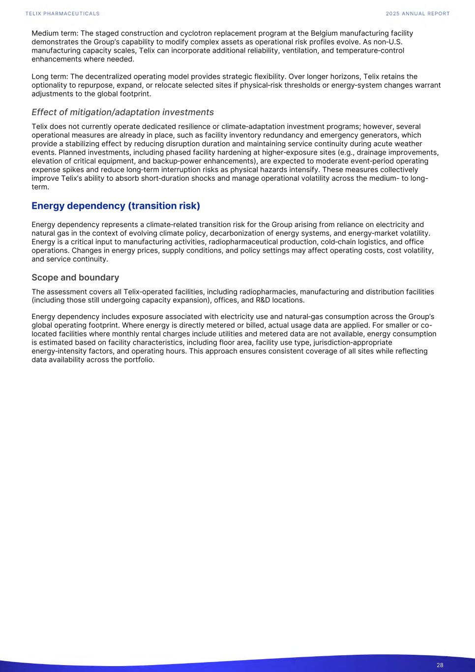 Medium term: The staged construction and cyclotron replacement program at the Belgium manufacturing facility demonstrates the Group’s capability to modify complex assets as operational risk profiles evolve. As non‑U.S. manufacturing capacity scales, Telix can incorporate additional reliability, ventilation, and temperature‑control enhancements where needed. Long term: The decentralized operating model provides strategic flexibility. Over longer horizons, Telix retains the optionality to repurpose, expand, or relocate selected sites if physical‑risk thresholds or energy‑system changes warrant adjustments to the global footprint. Effect of mitigation/adaptation investments Telix does not currently operate dedicated resilience or climate‑adaptation investment programs; however, several operational measures are already in place, such as facility inventory redundancy and emergency generators, which provide a stabilizing effect by reducing disruption duration and maintaining service continuity during acute weather events. Planned investments, including phased facility hardening at higher‑exposure sites (e.g., drainage improvements, elevation of critical equipment, and backup‑power enhancements), are expected to moderate event‑period operating expense spikes and reduce long‑term interruption risks as physical hazards intensify. These measures collectively improve Telix’s ability to absorb short‑duration shocks and manage operational volatility across the medium- to long- term. Energy dependency (transition risk) Energy dependency represents a climate‑related transition risk for the Group arising from reliance on electricity and natural gas in the context of evolving climate policy, decarbonization of energy systems, and energy‑market volatility. Energy is a critical input to manufacturing activities, radiopharmaceutical production, cold‑chain logistics, and office operations. Changes in energy prices, supply conditions, and policy settings may affect operating costs, cost volatility, and service continuity. Scope and boundary The assessment covers all Telix‑operated facilities, including radiopharmacies, manufacturing and distribution facilities (including those still undergoing capacity expansion), offices, and R&D locations. Energy dependency includes exposure associated with electricity use and natural‑gas consumption across the Group’s global operating footprint. Where energy is directly metered or billed, actual usage data are applied. For smaller or co- located facilities where monthly rental charges include utilities and metered data are not available, energy consumption is estimated based on facility characteristics, including floor area, facility use type, jurisdiction‑appropriate energy‑intensity factors, and operating hours. This approach ensures consistent coverage of all sites while reflecting data availability across the portfolio. 28