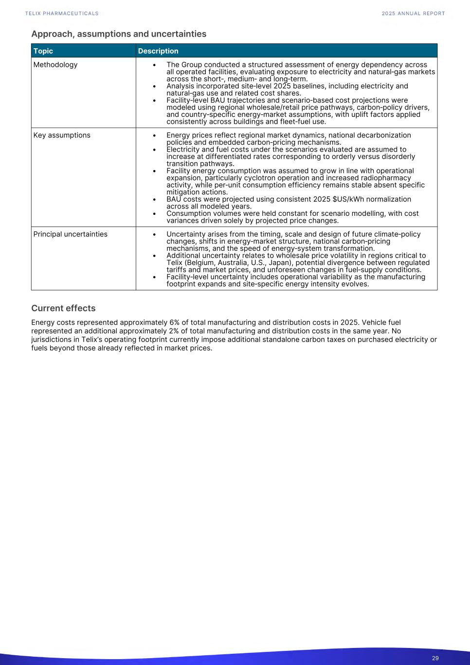 Approach, assumptions and uncertainties Topic Description Methodology • The Group conducted a structured assessment of energy dependency across all operated facilities, evaluating exposure to electricity and natural‑gas markets across the short‑, medium‑ and long‑term. • Analysis incorporated site‑level 2025 baselines, including electricity and natural‑gas use and related cost shares. • Facility‑level BAU trajectories and scenario‑based cost projections were modeled using regional wholesale/retail price pathways, carbon‑policy drivers, and country‑specific energy‑market assumptions, with uplift factors applied consistently across buildings and fleet‑fuel use. Key assumptions • Energy prices reflect regional market dynamics, national decarbonization policies and embedded carbon‑pricing mechanisms. • Electricity and fuel costs under the scenarios evaluated are assumed to increase at differentiated rates corresponding to orderly versus disorderly transition pathways. • Facility energy consumption was assumed to grow in line with operational expansion, particularly cyclotron operation and increased radiopharmacy activity, while per‑unit consumption efficiency remains stable absent specific mitigation actions. • BAU costs were projected using consistent 2025 $US/kWh normalization across all modeled years. • Consumption volumes were held constant for scenario modelling, with cost variances driven solely by projected price changes. Principal uncertainties • Uncertainty arises from the timing, scale and design of future climate‑policy changes, shifts in energy‑market structure, national carbon‑pricing mechanisms, and the speed of energy‑system transformation. • Additional uncertainty relates to wholesale price volatility in regions critical to Telix (Belgium, Australia, U.S., Japan), potential divergence between regulated tariffs and market prices, and unforeseen changes in fuel‑supply conditions. • Facility‑level uncertainty includes operational variability as the manufacturing footprint expands and site‑specific energy intensity evolves. Current effects Energy costs represented approximately 6% of total manufacturing and distribution costs in 2025. Vehicle fuel represented an additional approximately 2% of total manufacturing and distribution costs in the same year. No jurisdictions in Telix’s operating footprint currently impose additional standalone carbon taxes on purchased electricity or fuels beyond those already reflected in market prices. 29