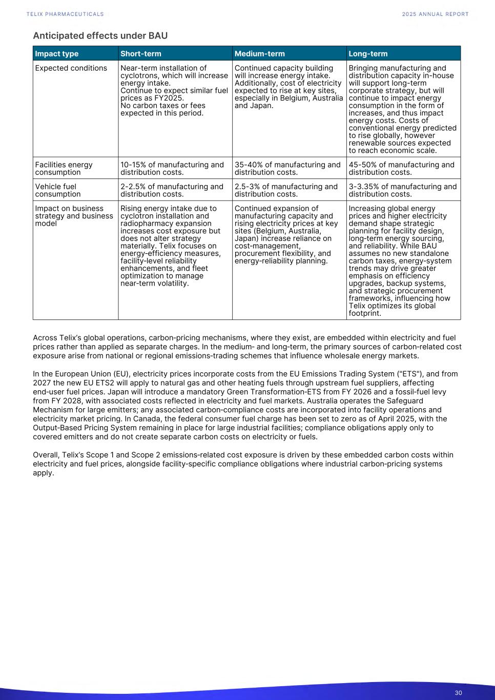 Anticipated effects under BAU Impact type Short-term Medium-term Long-term Expected conditions Near-term installation of cyclotrons, which will increase energy intake. Continue to expect similar fuel prices as FY2025. No carbon taxes or fees expected in this period. Continued capacity building will increase energy intake. Additionally, cost of electricity expected to rise at key sites, especially in Belgium, Australia and Japan. Bringing manufacturing and distribution capacity in-house will support long-term corporate strategy, but will continue to impact energy consumption in the form of increases, and thus impact energy costs. Costs of conventional energy predicted to rise globally, however renewable sources expected to reach economic scale. Facilities energy consumption 10-15% of manufacturing and distribution costs. 35-40% of manufacturing and distribution costs. 45-50% of manufacturing and distribution costs. Vehicle fuel consumption 2-2.5% of manufacturing and distribution costs. 2.5-3% of manufacturing and distribution costs. 3-3.35% of manufacturing and distribution costs. Impact on business strategy and business model Rising energy intake due to cyclotron installation and radiopharmacy expansion increases cost exposure but does not alter strategy materially. Telix focuses on energy‑efficiency measures, facility‑level reliability enhancements, and fleet optimization to manage near‑term volatility. Continued expansion of manufacturing capacity and rising electricity prices at key sites (Belgium, Australia, Japan) increase reliance on cost‑management, procurement flexibility, and energy‑reliability planning. Increasing global energy prices and higher electricity demand shape strategic planning for facility design, long‑term energy sourcing, and reliability. While BAU assumes no new standalone carbon taxes, energy‑system trends may drive greater emphasis on efficiency upgrades, backup systems, and strategic procurement frameworks, influencing how Telix optimizes its global footprint. Across Telix’s global operations, carbon‑pricing mechanisms, where they exist, are embedded within electricity and fuel prices rather than applied as separate charges. In the medium‑ and long‑term, the primary sources of carbon‑related cost exposure arise from national or regional emissions‑trading schemes that influence wholesale energy markets. In the European Union (EU), electricity prices incorporate costs from the EU Emissions Trading System ("ETS"), and from 2027 the new EU ETS2 will apply to natural gas and other heating fuels through upstream fuel suppliers, affecting end‑user fuel prices. Japan will introduce a mandatory Green Transformation‑ETS from FY 2026 and a fossil‑fuel levy from FY 2028, with associated costs reflected in electricity and fuel markets. Australia operates the Safeguard Mechanism for large emitters; any associated carbon‑compliance costs are incorporated into facility operations and electricity market pricing. In Canada, the federal consumer fuel charge has been set to zero as of April 2025, with the Output‑Based Pricing System remaining in place for large industrial facilities; compliance obligations apply only to covered emitters and do not create separate carbon costs on electricity or fuels. Overall, Telix’s Scope 1 and Scope 2 emissions‑related cost exposure is driven by these embedded carbon costs within electricity and fuel prices, alongside facility‑specific compliance obligations where industrial carbon‑pricing systems apply. 30