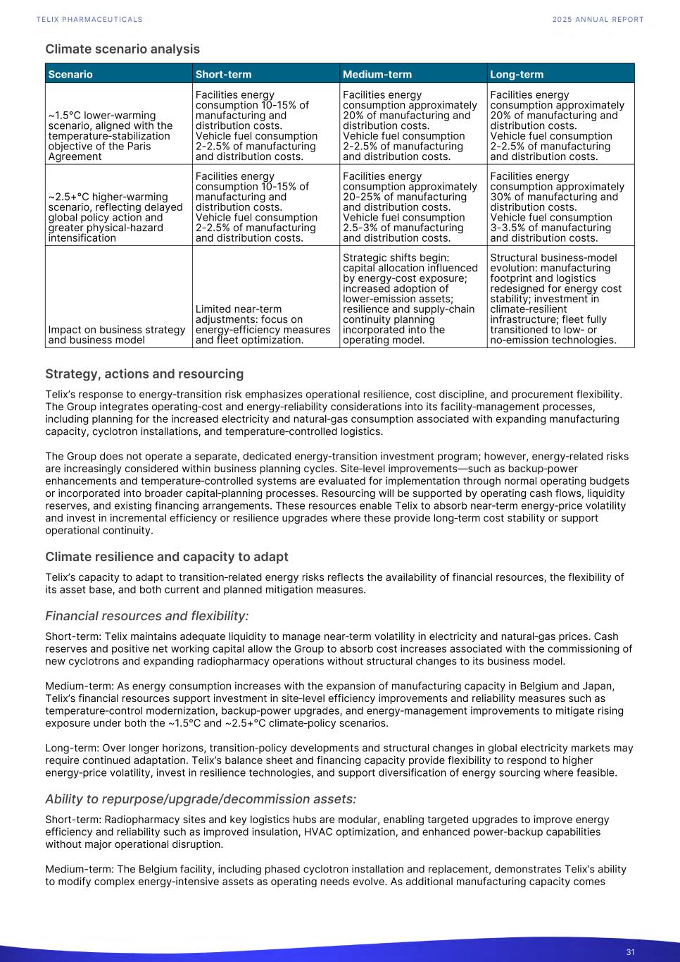 Climate scenario analysis Scenario Short-term Medium-term Long-term ~1.5°C lower‑warming scenario, aligned with the temperature‑stabilization objective of the Paris Agreement Facilities energy consumption 10-15% of manufacturing and distribution costs. Vehicle fuel consumption 2-2.5% of manufacturing and distribution costs. Facilities energy consumption approximately 20% of manufacturing and distribution costs. Vehicle fuel consumption 2-2.5% of manufacturing and distribution costs. Facilities energy consumption approximately 20% of manufacturing and distribution costs. Vehicle fuel consumption 2-2.5% of manufacturing and distribution costs. ~2.5+°C higher‑warming scenario, reflecting delayed global policy action and greater physical‑hazard intensification Facilities energy consumption 10-15% of manufacturing and distribution costs. Vehicle fuel consumption 2-2.5% of manufacturing and distribution costs. Facilities energy consumption approximately 20-25% of manufacturing and distribution costs. Vehicle fuel consumption 2.5-3% of manufacturing and distribution costs. Facilities energy consumption approximately 30% of manufacturing and distribution costs. Vehicle fuel consumption 3-3.5% of manufacturing and distribution costs. Impact on business strategy and business model Limited near‑term adjustments: focus on energy‑efficiency measures and fleet optimization. Strategic shifts begin: capital allocation influenced by energy‑cost exposure; increased adoption of lower‑emission assets; resilience and supply‑chain continuity planning incorporated into the operating model. Structural business‑model evolution: manufacturing footprint and logistics redesigned for energy cost stability; investment in climate‑resilient infrastructure; fleet fully transitioned to low‑ or no‑emission technologies. Strategy, actions and resourcing Telix’s response to energy‑transition risk emphasizes operational resilience, cost discipline, and procurement flexibility. The Group integrates operating‑cost and energy‑reliability considerations into its facility‑management processes, including planning for the increased electricity and natural‑gas consumption associated with expanding manufacturing capacity, cyclotron installations, and temperature‑controlled logistics. The Group does not operate a separate, dedicated energy‑transition investment program; however, energy‑related risks are increasingly considered within business planning cycles. Site‑level improvements—such as backup‑power enhancements and temperature‑controlled systems are evaluated for implementation through normal operating budgets or incorporated into broader capital‑planning processes. Resourcing will be supported by operating cash flows, liquidity reserves, and existing financing arrangements. These resources enable Telix to absorb near‑term energy‑price volatility and invest in incremental efficiency or resilience upgrades where these provide long‑term cost stability or support operational continuity. Climate resilience and capacity to adapt Telix’s capacity to adapt to transition‑related energy risks reflects the availability of financial resources, the flexibility of its asset base, and both current and planned mitigation measures. Financial resources and flexibility: Short-term: Telix maintains adequate liquidity to manage near‑term volatility in electricity and natural‑gas prices. Cash reserves and positive net working capital allow the Group to absorb cost increases associated with the commissioning of new cyclotrons and expanding radiopharmacy operations without structural changes to its business model. Medium-term: As energy consumption increases with the expansion of manufacturing capacity in Belgium and Japan, Telix’s financial resources support investment in site‑level efficiency improvements and reliability measures such as temperature‑control modernization, backup‑power upgrades, and energy‑management improvements to mitigate rising exposure under both the ~1.5°C and ~2.5+°C climate‑policy scenarios. Long-term: Over longer horizons, transition‑policy developments and structural changes in global electricity markets may require continued adaptation. Telix’s balance sheet and financing capacity provide flexibility to respond to higher energy‑price volatility, invest in resilience technologies, and support diversification of energy sourcing where feasible. Ability to repurpose/upgrade/decommission assets: Short-term: Radiopharmacy sites and key logistics hubs are modular, enabling targeted upgrades to improve energy efficiency and reliability such as improved insulation, HVAC optimization, and enhanced power‑backup capabilities without major operational disruption. Medium-term: The Belgium facility, including phased cyclotron installation and replacement, demonstrates Telix’s ability to modify complex energy‑intensive assets as operating needs evolve. As additional manufacturing capacity comes 31