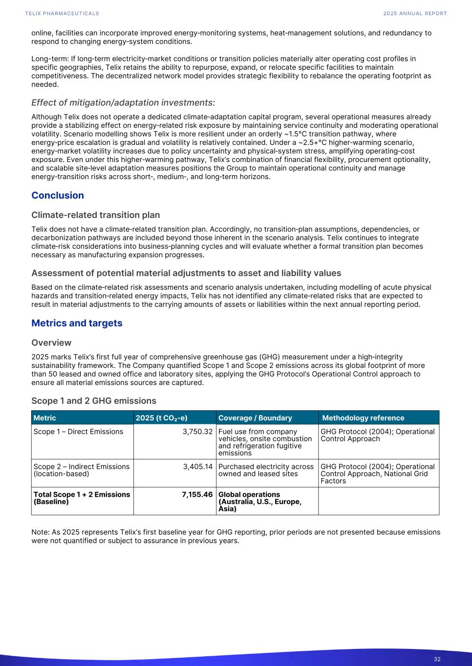 online, facilities can incorporate improved energy‑monitoring systems, heat‑management solutions, and redundancy to respond to changing energy‑system conditions. Long-term: If long‑term electricity‑market conditions or transition policies materially alter operating cost profiles in specific geographies, Telix retains the ability to repurpose, expand, or relocate specific facilities to maintain competitiveness. The decentralized network model provides strategic flexibility to rebalance the operating footprint as needed. Effect of mitigation/adaptation investments: Although Telix does not operate a dedicated climate‑adaptation capital program, several operational measures already provide a stabilizing effect on energy‑related risk exposure by maintaining service continuity and moderating operational volatility. Scenario modelling shows Telix is more resilient under an orderly ~1.5°C transition pathway, where energy‑price escalation is gradual and volatility is relatively contained. Under a ~2.5+°C higher‑warming scenario, energy‑market volatility increases due to policy uncertainty and physical‑system stress, amplifying operating‑cost exposure. Even under this higher‑warming pathway, Telix’s combination of financial flexibility, procurement optionality, and scalable site‑level adaptation measures positions the Group to maintain operational continuity and manage energy‑transition risks across short‑, medium‑, and long‑term horizons. Conclusion Climate‑related transition plan Telix does not have a climate‑related transition plan. Accordingly, no transition‑plan assumptions, dependencies, or decarbonization pathways are included beyond those inherent in the scenario analysis. Telix continues to integrate climate‑risk considerations into business‑planning cycles and will evaluate whether a formal transition plan becomes necessary as manufacturing expansion progresses. Assessment of potential material adjustments to asset and liability values Based on the climate‑related risk assessments and scenario analysis undertaken, including modelling of acute physical hazards and transition‑related energy impacts, Telix has not identified any climate‑related risks that are expected to result in material adjustments to the carrying amounts of assets or liabilities within the next annual reporting period. Metrics and targets Overview 2025 marks Telix’s first full year of comprehensive greenhouse gas (GHG) measurement under a high‑integrity sustainability framework. The Company quantified Scope 1 and Scope 2 emissions across its global footprint of more than 50 leased and owned office and laboratory sites, applying the GHG Protocol’s Operational Control approach to ensure all material emissions sources are captured. Scope 1 and 2 GHG emissions Metric 2025 (t CO₂-e) Coverage / Boundary Methodology reference Scope 1 – Direct Emissions 3,750.32 Fuel use from company vehicles, onsite combustion and refrigeration fugitive emissions GHG Protocol (2004); Operational Control Approach Scope 2 – Indirect Emissions (location-based) 3,405.14 Purchased electricity across owned and leased sites GHG Protocol (2004); Operational Control Approach, National Grid Factors Total Scope 1 + 2 Emissions (Baseline) 7,155.46 Global operations (Australia, U.S., Europe, Asia) Note: As 2025 represents Telix’s first baseline year for GHG reporting, prior periods are not presented because emissions were not quantified or subject to assurance in previous years. 32