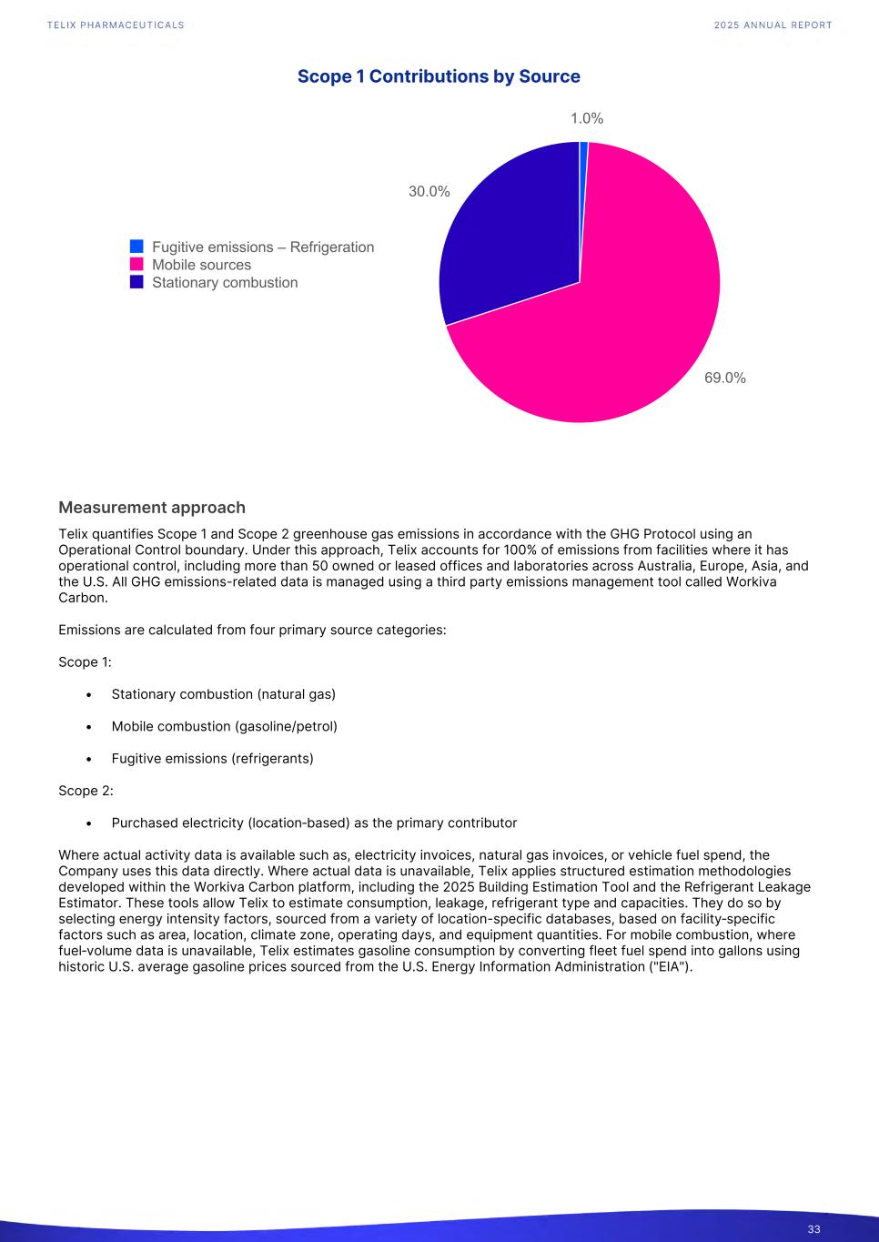 Scope 1 Contributions by Source 1.0% 69.0% 30.0% Fugitive emissions – Refrigeration Mobile sources Stationary combustion Measurement approach Telix quantifies Scope 1 and Scope 2 greenhouse gas emissions in accordance with the GHG Protocol using an Operational Control boundary. Under this approach, Telix accounts for 100% of emissions from facilities where it has operational control, including more than 50 owned or leased offices and laboratories across Australia, Europe, Asia, and the U.S. All GHG emissions-related data is managed using a third party emissions management tool called Workiva Carbon. Emissions are calculated from four primary source categories: Scope 1: • Stationary combustion (natural gas) • Mobile combustion (gasoline/petrol) • Fugitive emissions (refrigerants) Scope 2: • Purchased electricity (location‑based) as the primary contributor Where actual activity data is available such as, electricity invoices, natural gas invoices, or vehicle fuel spend, the Company uses this data directly. Where actual data is unavailable, Telix applies structured estimation methodologies developed within the Workiva Carbon platform, including the 2025 Building Estimation Tool and the Refrigerant Leakage Estimator. These tools allow Telix to estimate consumption, leakage, refrigerant type and capacities. They do so by selecting energy intensity factors, sourced from a variety of location-specific databases, based on facility‑specific factors such as area, location, climate zone, operating days, and equipment quantities. For mobile combustion, where fuel‑volume data is unavailable, Telix estimates gasoline consumption by converting fleet fuel spend into gallons using historic U.S. average gasoline prices sourced from the U.S. Energy Information Administration ("EIA"). 33