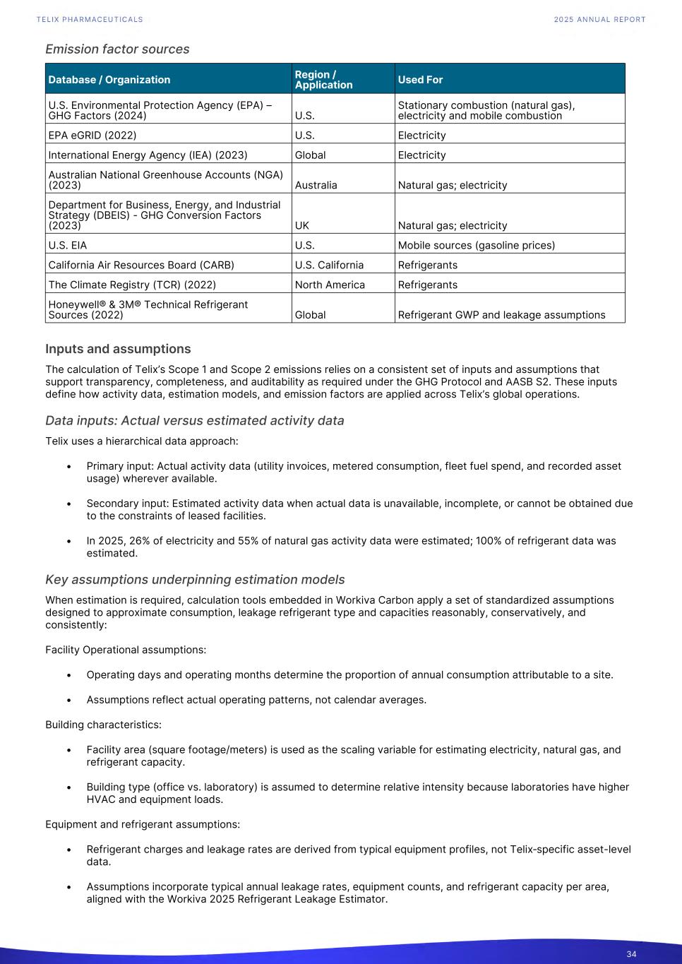 Emission factor sources Database / Organization Region / Application Used For U.S. Environmental Protection Agency (EPA) – GHG Factors (2024) U.S. Stationary combustion (natural gas), electricity and mobile combustion EPA eGRID (2022) U.S. Electricity International Energy Agency (IEA) (2023) Global Electricity Australian National Greenhouse Accounts (NGA) (2023) Australia Natural gas; electricity Department for Business, Energy, and Industrial Strategy (DBEIS) - GHG Conversion Factors (2023) UK Natural gas; electricity U.S. EIA U.S. Mobile sources (gasoline prices) California Air Resources Board (CARB) U.S. California Refrigerants The Climate Registry (TCR) (2022) North America Refrigerants Honeywell® & 3M® Technical Refrigerant Sources (2022) Global Refrigerant GWP and leakage assumptions Inputs and assumptions The calculation of Telix’s Scope 1 and Scope 2 emissions relies on a consistent set of inputs and assumptions that support transparency, completeness, and auditability as required under the GHG Protocol and AASB S2. These inputs define how activity data, estimation models, and emission factors are applied across Telix’s global operations. Data inputs: Actual versus estimated activity data Telix uses a hierarchical data approach: • Primary input: Actual activity data (utility invoices, metered consumption, fleet fuel spend, and recorded asset usage) wherever available. • Secondary input: Estimated activity data when actual data is unavailable, incomplete, or cannot be obtained due to the constraints of leased facilities. • In 2025, 26% of electricity and 55% of natural gas activity data were estimated; 100% of refrigerant data was estimated. Key assumptions underpinning estimation models When estimation is required, calculation tools embedded in Workiva Carbon apply a set of standardized assumptions designed to approximate consumption, leakage refrigerant type and capacities reasonably, conservatively, and consistently: Facility Operational assumptions: • Operating days and operating months determine the proportion of annual consumption attributable to a site. • Assumptions reflect actual operating patterns, not calendar averages. Building characteristics: • Facility area (square footage/meters) is used as the scaling variable for estimating electricity, natural gas, and refrigerant capacity. • Building type (office vs. laboratory) is assumed to determine relative intensity because laboratories have higher HVAC and equipment loads. Equipment and refrigerant assumptions: • Refrigerant charges and leakage rates are derived from typical equipment profiles, not Telix‑specific asset-level data. • Assumptions incorporate typical annual leakage rates, equipment counts, and refrigerant capacity per area, aligned with the Workiva 2025 Refrigerant Leakage Estimator. 34