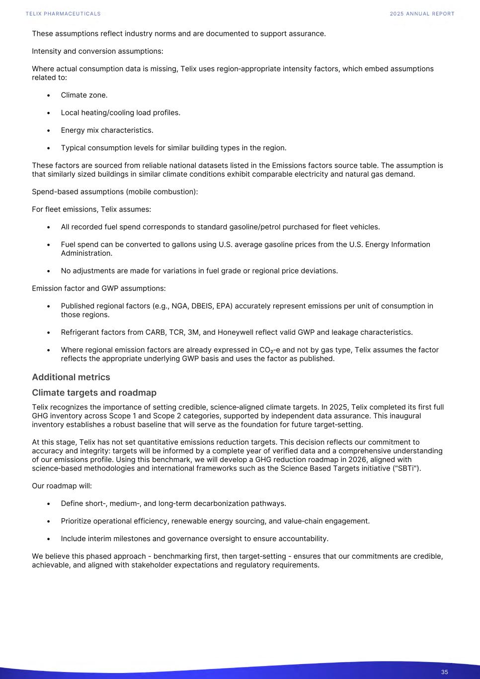 These assumptions reflect industry norms and are documented to support assurance. Intensity and conversion assumptions: Where actual consumption data is missing, Telix uses region‑appropriate intensity factors, which embed assumptions related to: • Climate zone. • Local heating/cooling load profiles. • Energy mix characteristics. • Typical consumption levels for similar building types in the region. These factors are sourced from reliable national datasets listed in the Emissions factors source table. The assumption is that similarly sized buildings in similar climate conditions exhibit comparable electricity and natural gas demand. Spend-based assumptions (mobile combustion): For fleet emissions, Telix assumes: • All recorded fuel spend corresponds to standard gasoline/petrol purchased for fleet vehicles. • Fuel spend can be converted to gallons using U.S. average gasoline prices from the U.S. Energy Information Administration. • No adjustments are made for variations in fuel grade or regional price deviations. Emission factor and GWP assumptions: • Published regional factors (e.g., NGA, DBEIS, EPA) accurately represent emissions per unit of consumption in those regions. • Refrigerant factors from CARB, TCR, 3M, and Honeywell reflect valid GWP and leakage characteristics. • Where regional emission factors are already expressed in CO₂‑e and not by gas type, Telix assumes the factor reflects the appropriate underlying GWP basis and uses the factor as published. Additional metrics Climate targets and roadmap Telix recognizes the importance of setting credible, science‑aligned climate targets. In 2025, Telix completed its first full GHG inventory across Scope 1 and Scope 2 categories, supported by independent data assurance. This inaugural inventory establishes a robust baseline that will serve as the foundation for future target‑setting. At this stage, Telix has not set quantitative emissions reduction targets. This decision reflects our commitment to accuracy and integrity: targets will be informed by a complete year of verified data and a comprehensive understanding of our emissions profile. Using this benchmark, we will develop a GHG reduction roadmap in 2026, aligned with science‑based methodologies and international frameworks such as the Science Based Targets initiative ("SBTi"). Our roadmap will: • Define short‑, medium‑, and long‑term decarbonization pathways. • Prioritize operational efficiency, renewable energy sourcing, and value‑chain engagement. • Include interim milestones and governance oversight to ensure accountability. We believe this phased approach - benchmarking first, then target‑setting - ensures that our commitments are credible, achievable, and aligned with stakeholder expectations and regulatory requirements. 35