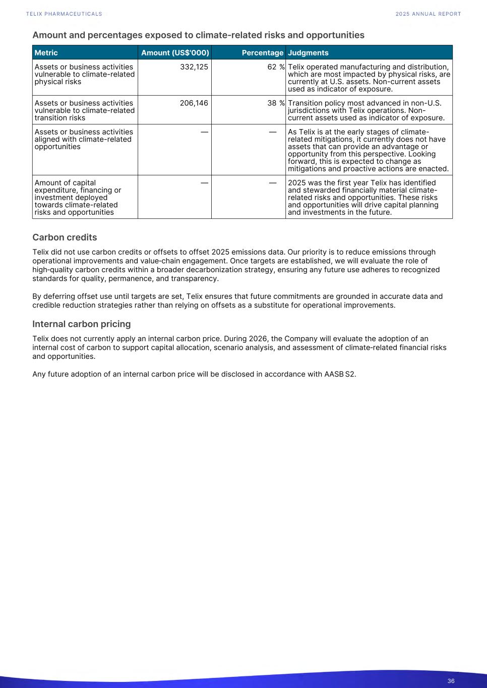 Amount and percentages exposed to climate‑related risks and opportunities Metric Amount (US$'000) Percentage Judgments Assets or business activities vulnerable to climate-related physical risks 332,125 62 % Telix operated manufacturing and distribution, which are most impacted by physical risks, are currently at U.S. assets. Non-current assets used as indicator of exposure. Assets or business activities vulnerable to climate-related transition risks 206,146 38 % Transition policy most advanced in non-U.S. jurisdictions with Telix operations. Non- current assets used as indicator of exposure. Assets or business activities aligned with climate-related opportunities — — As Telix is at the early stages of climate- related mitigations, it currently does not have assets that can provide an advantage or opportunity from this perspective. Looking forward, this is expected to change as mitigations and proactive actions are enacted. Amount of capital expenditure, financing or investment deployed towards climate-related risks and opportunities — — 2025 was the first year Telix has identified and stewarded financially material climate- related risks and opportunities. These risks and opportunities will drive capital planning and investments in the future. Carbon credits Telix did not use carbon credits or offsets to offset 2025 emissions data. Our priority is to reduce emissions through operational improvements and value‑chain engagement. Once targets are established, we will evaluate the role of high‑quality carbon credits within a broader decarbonization strategy, ensuring any future use adheres to recognized standards for quality, permanence, and transparency. By deferring offset use until targets are set, Telix ensures that future commitments are grounded in accurate data and credible reduction strategies rather than relying on offsets as a substitute for operational improvements. Internal carbon pricing Telix does not currently apply an internal carbon price. During 2026, the Company will evaluate the adoption of an internal cost of carbon to support capital allocation, scenario analysis, and assessment of climate‑related financial risks and opportunities. Any future adoption of an internal carbon price will be disclosed in accordance with AASB S2. 36