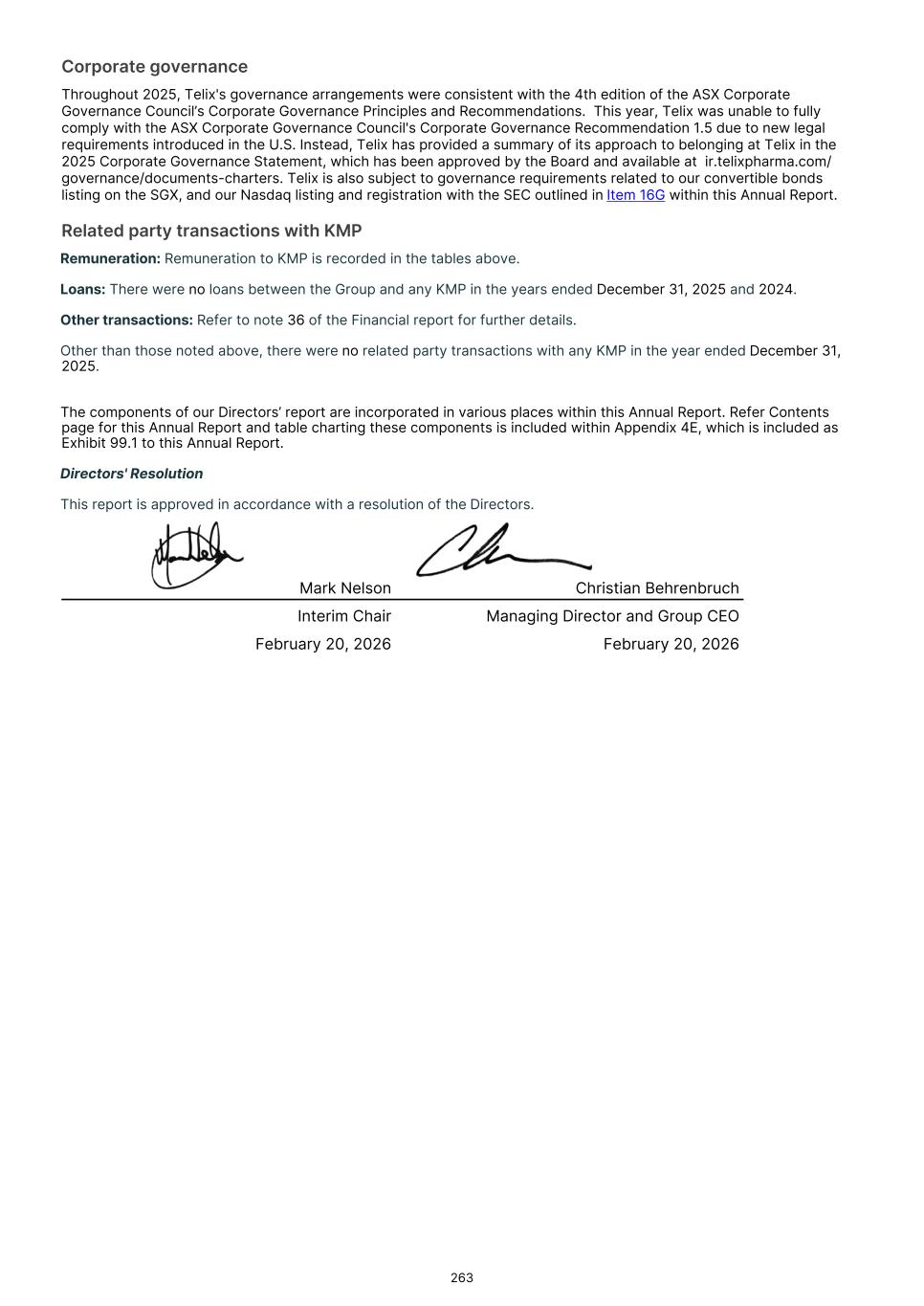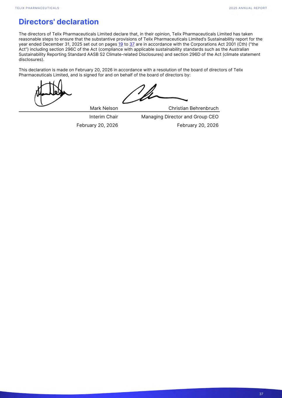 Directors' declaration The directors of Telix Pharmaceuticals Limited declare that, in their opinion, Telix Pharmaceuticals Limited has taken reasonable steps to ensure that the substantive provisions of Telix Pharmaceuticals Limited’s Sustainability report for the year ended December 31, 2025 set out on pages 19 to 37 are in accordance with the Corporations Act 2001 (Cth) (“the Act”) including section 296C of the Act (compliance with applicable sustainability standards such as the Australian Sustainability Reporting Standard AASB S2 Climate-related Disclosures) and section 296D of the Act (climate statement disclosures). This declaration is made on February 20, 2026 in accordance with a resolution of the board of directors of Telix Pharmaceuticals Limited, and is signed for and on behalf of the board of directors by: Mark Nelson Christian Behrenbruch Interim Chair Managing Director and Group CEO February 20, 2026 February 20, 2026 37