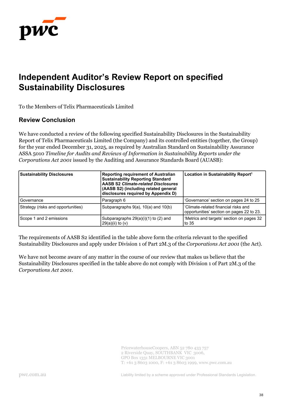 Independent Auditor’s Review Report on specified Sustainability Disclosures To the Members of Telix Pharmaceuticals Limited Review Conclusion We have conducted a review of the following specified Sustainability Disclosures in the Sustainability Report of Telix Pharmaceuticals Limited (the Company) and its controlled entities (together, the Group) for the year ended December 31, 2025, as required by Australian Standard on Sustainability Assurance ASSA 5010 Timeline for Audits and Reviews of Information in Sustainability Reports under the Corporations Act 2001 issued by the Auditing and Assurance Standards Board (AUASB): Sustainability Disclosures Reporting requirement of Australian Sustainability Reporting Standard AASB S2 Climate-related Disclosures (AASB S2) (including related general disclosures required by Appendix D) Location in Sustainability Report1 Governance Paragraph 6 ‘Governance’ section on pages 24 to 25 Strategy (risks and opportunities) Subparagraphs 9(a), 10(a) and 10(b) ‘Climate-related financial risks and opportunities’ section on pages 22 to 23. Scope 1 and 2 emissions Subparagraphs 29(a)(i)(1) to (2) and 29(a)(ii) to (v) ‘Metrics and targets’ section on pages 32 to 35 The requirements of AASB S2 identified in the table above form the criteria relevant to the specified Sustainability Disclosures and apply under Division 1 of Part 2M.3 of the Corporations Act 2001 (the Act). We have not become aware of any matter in the course of our review that makes us believe that the Sustainability Disclosures specified in the table above do not comply with Division 1 of Part 2M.3 of the Corporations Act 2001. PricewaterhouseCoopers, ABN 52 780 433 757 2 Riverside Quay, SOUTHBANK VIC 3006, GPO Box 1331 MELBOURNE VIC 3001 T: +61 3 8603 1000, F: +61 3 8603 1999, www.pwc.com.au pwc.com.au Liability limited by a scheme approved under Professional Standards Legislation. 38