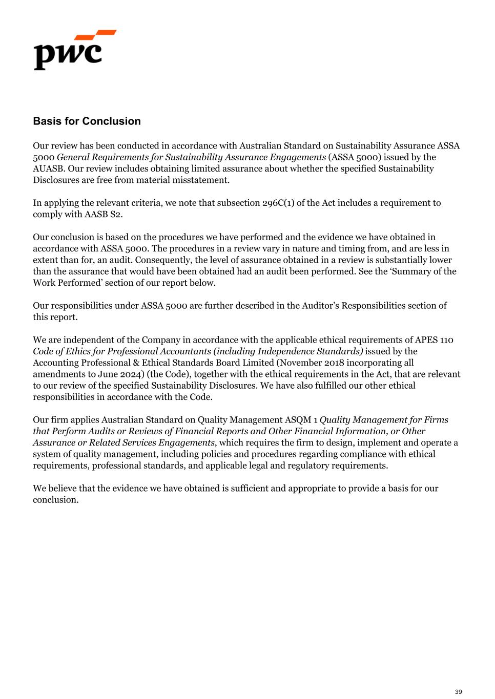 Basis for Conclusion Our review has been conducted in accordance with Australian Standard on Sustainability Assurance ASSA 5000 General Requirements for Sustainability Assurance Engagements (ASSA 5000) issued by the AUASB. Our review includes obtaining limited assurance about whether the specified Sustainability Disclosures are free from material misstatement. In applying the relevant criteria, we note that subsection 296C(1) of the Act includes a requirement to comply with AASB S2. Our conclusion is based on the procedures we have performed and the evidence we have obtained in accordance with ASSA 5000. The procedures in a review vary in nature and timing from, and are less in extent than for, an audit. Consequently, the level of assurance obtained in a review is substantially lower than the assurance that would have been obtained had an audit been performed. See the ‘Summary of the Work Performed’ section of our report below. Our responsibilities under ASSA 5000 are further described in the Auditor’s Responsibilities section of this report. We are independent of the Company in accordance with the applicable ethical requirements of APES 110 Code of Ethics for Professional Accountants (including Independence Standards) issued by the Accounting Professional & Ethical Standards Board Limited (November 2018 incorporating all amendments to June 2024) (the Code), together with the ethical requirements in the Act, that are relevant to our review of the specified Sustainability Disclosures. We have also fulfilled our other ethical responsibilities in accordance with the Code. Our firm applies Australian Standard on Quality Management ASQM 1 Quality Management for Firms that Perform Audits or Reviews of Financial Reports and Other Financial Information, or Other Assurance or Related Services Engagements, which requires the firm to design, implement and operate a system of quality management, including policies and procedures regarding compliance with ethical requirements, professional standards, and applicable legal and regulatory requirements. We believe that the evidence we have obtained is sufficient and appropriate to provide a basis for our conclusion. 39