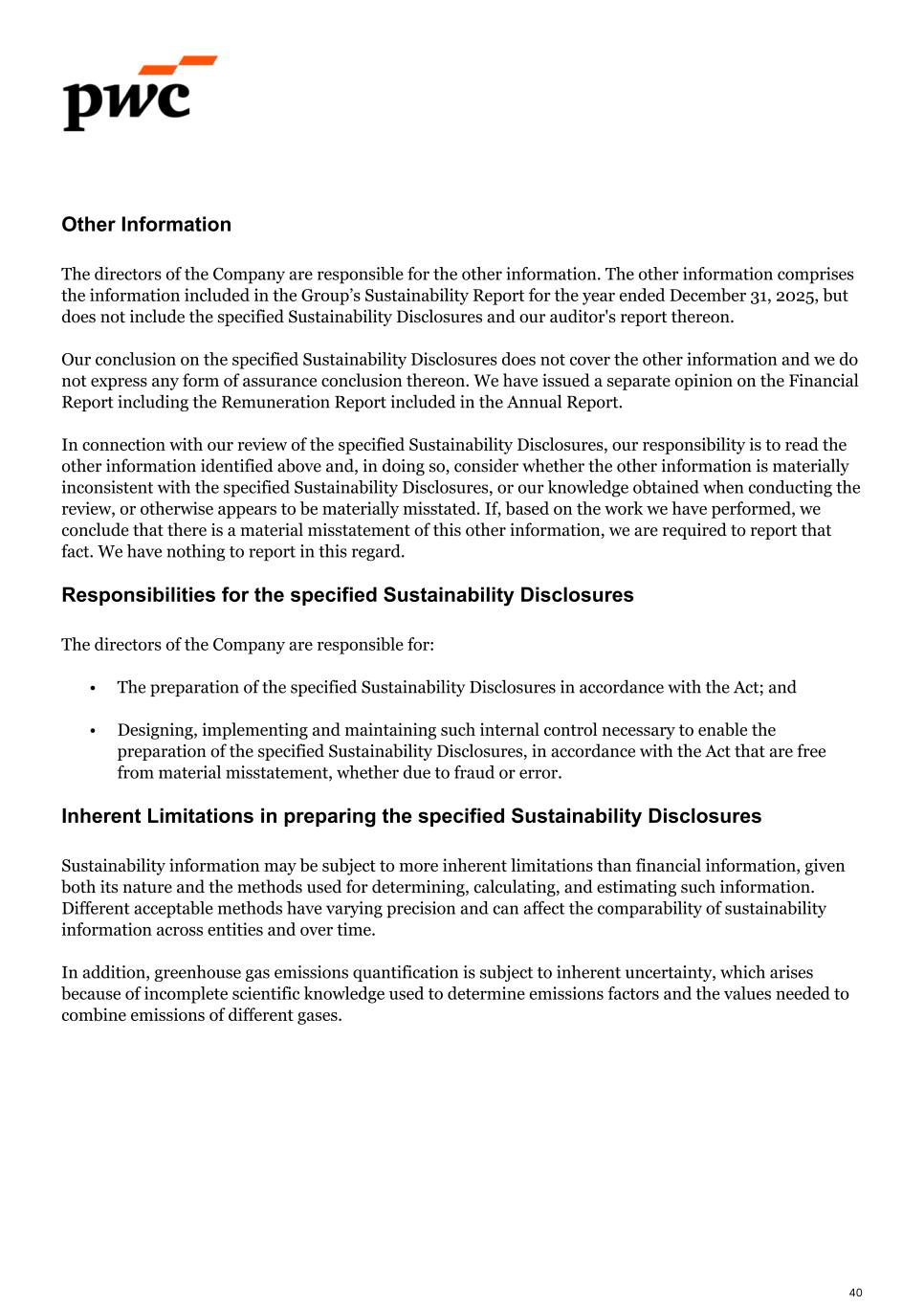 Other Information The directors of the Company are responsible for the other information. The other information comprises the information included in the Group’s Sustainability Report for the year ended December 31, 2025, but does not include the specified Sustainability Disclosures and our auditor's report thereon. Our conclusion on the specified Sustainability Disclosures does not cover the other information and we do not express any form of assurance conclusion thereon. We have issued a separate opinion on the Financial Report including the Remuneration Report included in the Annual Report. In connection with our review of the specified Sustainability Disclosures, our responsibility is to read the other information identified above and, in doing so, consider whether the other information is materially inconsistent with the specified Sustainability Disclosures, or our knowledge obtained when conducting the review, or otherwise appears to be materially misstated. If, based on the work we have performed, we conclude that there is a material misstatement of this other information, we are required to report that fact. We have nothing to report in this regard. Responsibilities for the specified Sustainability Disclosures The directors of the Company are responsible for: • The preparation of the specified Sustainability Disclosures in accordance with the Act; and • Designing, implementing and maintaining such internal control necessary to enable the preparation of the specified Sustainability Disclosures, in accordance with the Act that are free from material misstatement, whether due to fraud or error. Inherent Limitations in preparing the specified Sustainability Disclosures Sustainability information may be subject to more inherent limitations than financial information, given both its nature and the methods used for determining, calculating, and estimating such information. Different acceptable methods have varying precision and can affect the comparability of sustainability information across entities and over time. In addition, greenhouse gas emissions quantification is subject to inherent uncertainty, which arises because of incomplete scientific knowledge used to determine emissions factors and the values needed to combine emissions of different gases. 40