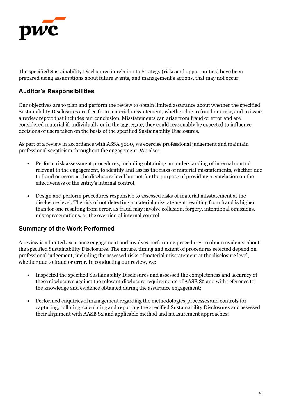 The specified Sustainability Disclosures in relation to Strategy (risks and opportunities) have been prepared using assumptions about future events, and management’s actions, that may not occur. Auditor’s Responsibilities Our objectives are to plan and perform the review to obtain limited assurance about whether the specified Sustainability Disclosures are free from material misstatement, whether due to fraud or error, and to issue a review report that includes our conclusion. Misstatements can arise from fraud or error and are considered material if, individually or in the aggregate, they could reasonably be expected to influence decisions of users taken on the basis of the specified Sustainability Disclosures. As part of a review in accordance with ASSA 5000, we exercise professional judgement and maintain professional scepticism throughout the engagement. We also: • Perform risk assessment procedures, including obtaining an understanding of internal control relevant to the engagement, to identify and assess the risks of material misstatements, whether due to fraud or error, at the disclosure level but not for the purpose of providing a conclusion on the effectiveness of the entity’s internal control. • Design and perform procedures responsive to assessed risks of material misstatement at the disclosure level. The risk of not detecting a material misstatement resulting from fraud is higher than for one resulting from error, as fraud may involve collusion, forgery, intentional omissions, misrepresentations, or the override of internal control. Summary of the Work Performed A review is a limited assurance engagement and involves performing procedures to obtain evidence about the specified Sustainability Disclosures. The nature, timing and extent of procedures selected depend on professional judgement, including the assessed risks of material misstatement at the disclosure level, whether due to fraud or error. In conducting our review, we: • Inspected the specified Sustainability Disclosures and assessed the completeness and accuracy of these disclosures against the relevant disclosure requirements of AASB S2 and with reference to the knowledge and evidence obtained during the assurance engagement;   • Performed enquiries of management regarding the methodologies, processes and controls for capturing, collating, calculating and reporting the specified Sustainability Disclosures and assessed their alignment with AASB S2 and applicable method and measurement approaches; 41