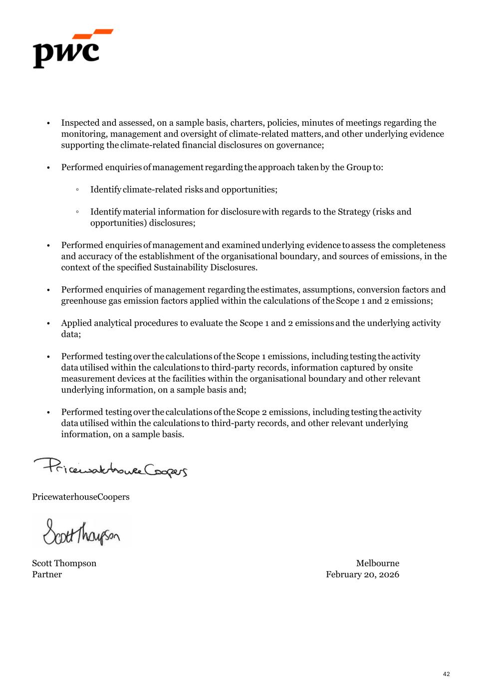 • Inspected and assessed, on a sample basis, charters, policies, minutes of meetings regarding the monitoring, management and oversight of climate-related matters, and other underlying evidence supporting the climate-related financial disclosures on governance;  • Performed enquiries of management regarding the approach taken by the Group to:   ◦ Identify climate-related risks and opportunities;  ◦ Identify material information for disclosure with regards to the Strategy (risks and opportunities) disclosures;  • Performed enquiries of management and examined underlying evidence to assess the completeness and accuracy of the establishment of the organisational boundary, and sources of emissions, in the context of the specified Sustainability Disclosures. • Performed enquiries of management regarding the estimates, assumptions, conversion factors and greenhouse gas emission factors applied within the calculations of the Scope 1 and 2 emissions;  • Applied analytical procedures to evaluate the Scope 1 and 2 emissions and the underlying activity data; • Performed testing over the calculations of the Scope 1 emissions, including testing the activity data utilised within the calculations to third-party records, information captured by onsite measurement devices at the facilities within the organisational boundary and other relevant underlying information, on a sample basis and;  • Performed testing over the calculations of the Scope 2 emissions, including testing the activity data utilised within the calculations to third-party records, and other relevant underlying information, on a sample basis. PricewaterhouseCoopers Scott Thompson Melbourne Partner February 20, 2026 42
