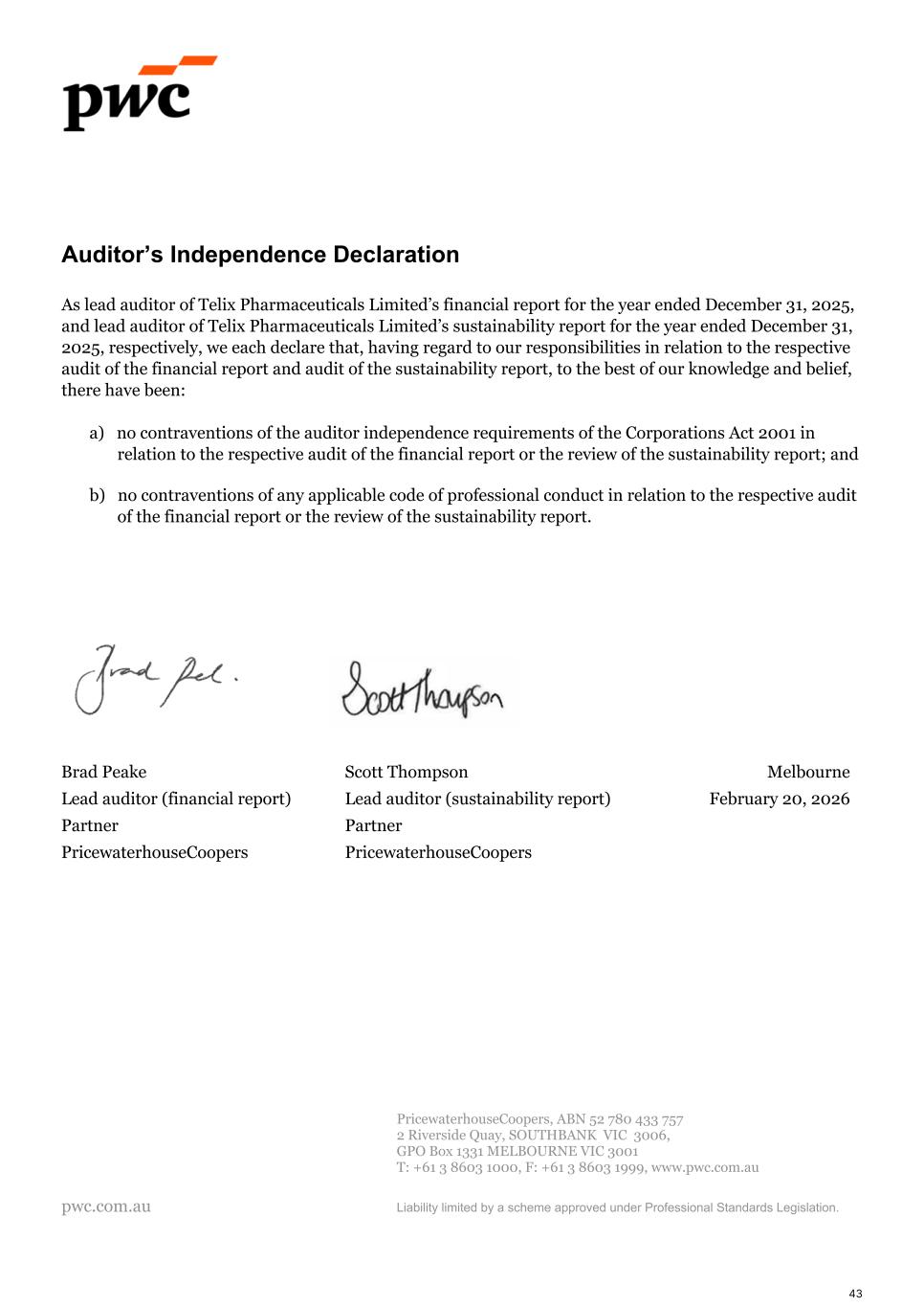 Auditor’s Independence Declaration As lead auditor of Telix Pharmaceuticals Limited’s financial report for the year ended December 31, 2025, and lead auditor of Telix Pharmaceuticals Limited’s sustainability report for the year ended December 31, 2025, respectively, we each declare that, having regard to our responsibilities in relation to the respective audit of the financial report and audit of the sustainability report, to the best of our knowledge and belief, there have been: a) no contraventions of the auditor independence requirements of the Corporations Act 2001 in relation to the respective audit of the financial report or the review of the sustainability report; and b) no contraventions of any applicable code of professional conduct in relation to the respective audit of the financial report or the review of the sustainability report. Brad Peake Scott Thompson Melbourne Lead auditor (financial report) Lead auditor (sustainability report) February 20, 2026 Partner Partner PricewaterhouseCoopers PricewaterhouseCoopers PricewaterhouseCoopers, ABN 52 780 433 757 2 Riverside Quay, SOUTHBANK VIC 3006, GPO Box 1331 MELBOURNE VIC 3001 T: +61 3 8603 1000, F: +61 3 8603 1999, www.pwc.com.au pwc.com.au Liability limited by a scheme approved under Professional Standards Legislation. 43