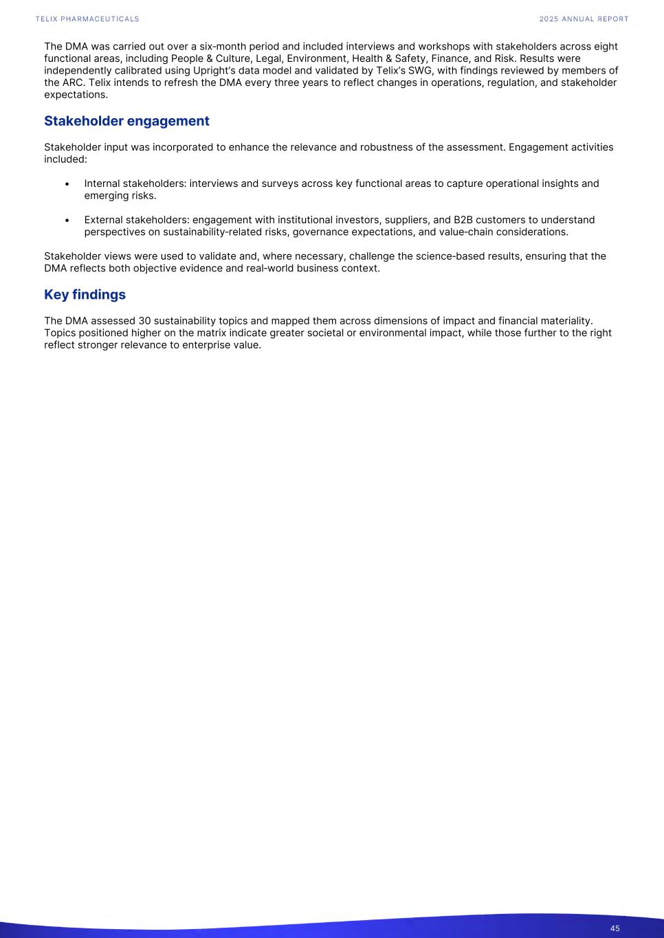 The DMA was carried out over a six‑month period and included interviews and workshops with stakeholders across eight functional areas, including People & Culture, Legal, Environment, Health & Safety, Finance, and Risk. Results were independently calibrated using Upright’s data model and validated by Telix’s SWG, with findings reviewed by members of the ARC. Telix intends to refresh the DMA every three years to reflect changes in operations, regulation, and stakeholder expectations. Stakeholder engagement Stakeholder input was incorporated to enhance the relevance and robustness of the assessment. Engagement activities included: • Internal stakeholders: interviews and surveys across key functional areas to capture operational insights and emerging risks. • External stakeholders: engagement with institutional investors, suppliers, and B2B customers to understand perspectives on sustainability‑related risks, governance expectations, and value‑chain considerations. Stakeholder views were used to validate and, where necessary, challenge the science‑based results, ensuring that the DMA reflects both objective evidence and real‑world business context. Key findings The DMA assessed 30 sustainability topics and mapped them across dimensions of impact and financial materiality. Topics positioned higher on the matrix indicate greater societal or environmental impact, while those further to the right reflect stronger relevance to enterprise value. 45
