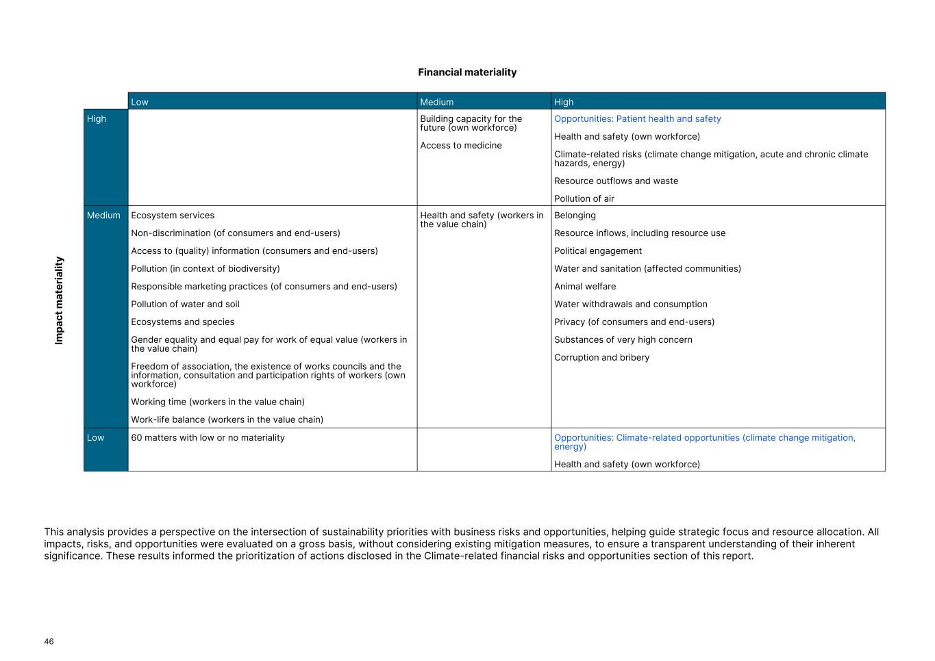 Low Medium High High Building capacity for the future (own workforce) Access to medicine Opportunities: Patient health and safety Health and safety (own workforce) Climate-related risks (climate change mitigation, acute and chronic climate hazards, energy) Resource outflows and waste Pollution of air Medium Ecosystem services Non-discrimination (of consumers and end-users) Access to (quality) information (consumers and end-users) Pollution (in context of biodiversity) Responsible marketing practices (of consumers and end-users) Pollution of water and soil Ecosystems and species Gender equality and equal pay for work of equal value (workers in the value chain) Freedom of association, the existence of works councils and the information, consultation and participation rights of workers (own workforce) Working time (workers in the value chain) Work-life balance (workers in the value chain) Health and safety (workers in the value chain) Belonging Resource inflows, including resource use Political engagement Water and sanitation (affected communities) Animal welfare Water withdrawals and consumption Privacy (of consumers and end-users) Substances of very high concern Corruption and bribery Low 60 matters with low or no materiality Opportunities: Climate-related opportunities (climate change mitigation, energy) Health and safety (own workforce) This analysis provides a perspective on the intersection of sustainability priorities with business risks and opportunities, helping guide strategic focus and resource allocation. All impacts, risks, and opportunities were evaluated on a gross basis, without considering existing mitigation measures, to ensure a transparent understanding of their inherent significance. These results informed the prioritization of actions disclosed in the Climate-related financial risks and opportunities section of this report. 46 Im pa ct m at er ia lit y Financial materiality
