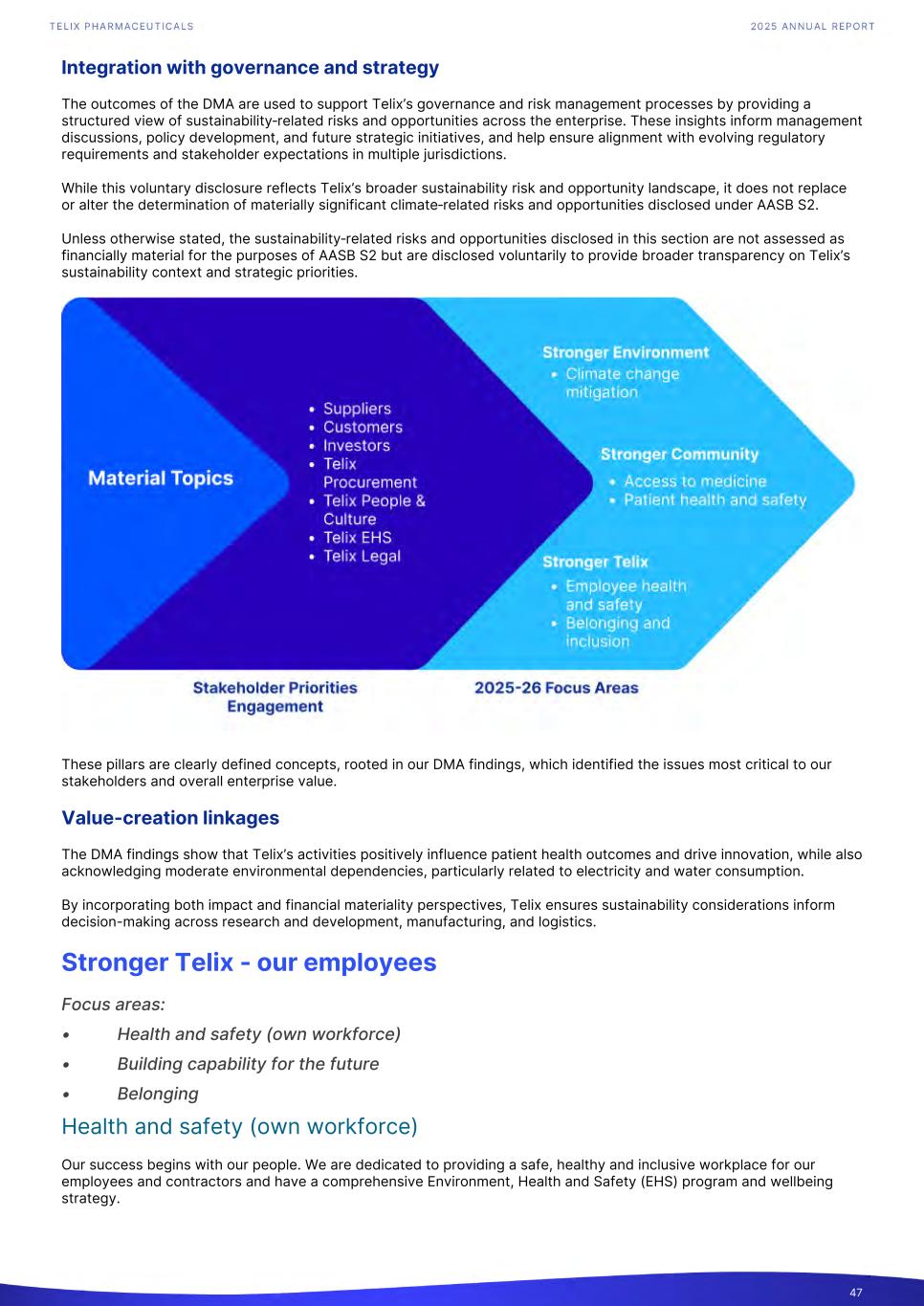 Integration with governance and strategy The outcomes of the DMA are used to support Telix’s governance and risk management processes by providing a structured view of sustainability‑related risks and opportunities across the enterprise. These insights inform management discussions, policy development, and future strategic initiatives, and help ensure alignment with evolving regulatory requirements and stakeholder expectations in multiple jurisdictions. While this voluntary disclosure reflects Telix’s broader sustainability risk and opportunity landscape, it does not replace or alter the determination of materially significant climate‑related risks and opportunities disclosed under AASB S2. Unless otherwise stated, the sustainability‑related risks and opportunities disclosed in this section are not assessed as financially material for the purposes of AASB S2 but are disclosed voluntarily to provide broader transparency on Telix’s sustainability context and strategic priorities. These pillars are clearly defined concepts, rooted in our DMA findings, which identified the issues most critical to our stakeholders and overall enterprise value. Value-creation linkages The DMA findings show that Telix’s activities positively influence patient health outcomes and drive innovation, while also acknowledging moderate environmental dependencies, particularly related to electricity and water consumption. By incorporating both impact and financial materiality perspectives, Telix ensures sustainability considerations inform decision-making across research and development, manufacturing, and logistics. Stronger Telix - our employees Focus areas: • Health and safety (own workforce) • Building capability for the future • Belonging Health and safety (own workforce) Our success begins with our people. We are dedicated to providing a safe, healthy and inclusive workplace for our employees and contractors and have a comprehensive Environment, Health and Safety (EHS) program and wellbeing strategy. 47