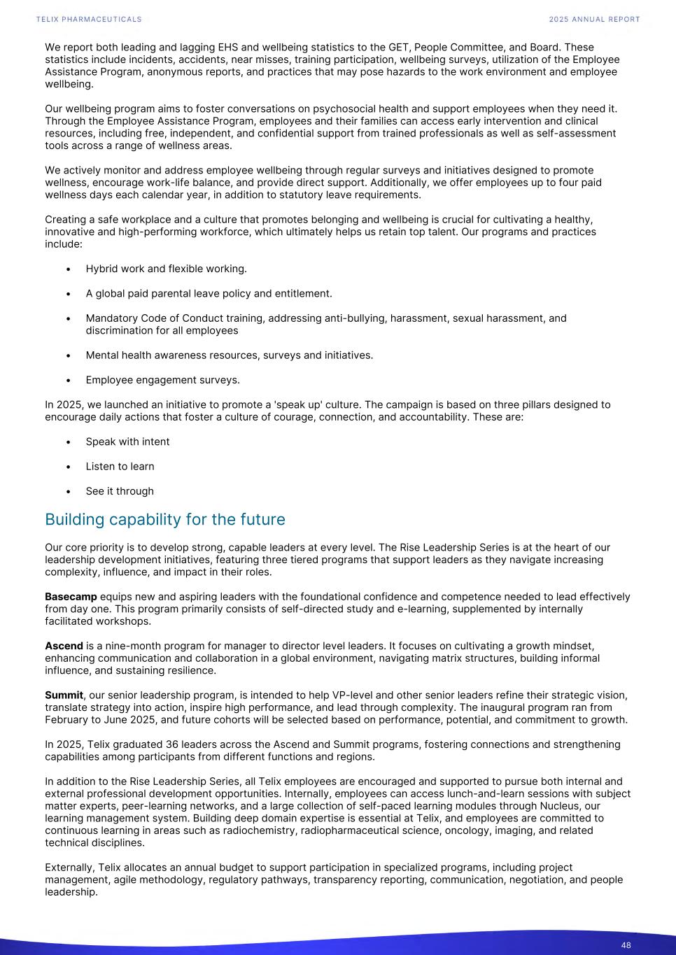 We report both leading and lagging EHS and wellbeing statistics to the GET, People Committee, and Board. These statistics include incidents, accidents, near misses, training participation, wellbeing surveys, utilization of the Employee Assistance Program, anonymous reports, and practices that may pose hazards to the work environment and employee wellbeing. Our wellbeing program aims to foster conversations on psychosocial health and support employees when they need it. Through the Employee Assistance Program, employees and their families can access early intervention and clinical resources, including free, independent, and confidential support from trained professionals as well as self-assessment tools across a range of wellness areas. We actively monitor and address employee wellbeing through regular surveys and initiatives designed to promote wellness, encourage work-life balance, and provide direct support. Additionally, we offer employees up to four paid wellness days each calendar year, in addition to statutory leave requirements. Creating a safe workplace and a culture that promotes belonging and wellbeing is crucial for cultivating a healthy, innovative and high-performing workforce, which ultimately helps us retain top talent. Our programs and practices include: • Hybrid work and flexible working. • A global paid parental leave policy and entitlement. • Mandatory Code of Conduct training, addressing anti-bullying, harassment, sexual harassment, and discrimination for all employees • Mental health awareness resources, surveys and initiatives. • Employee engagement surveys. In 2025, we launched an initiative to promote a 'speak up' culture. The campaign is based on three pillars designed to encourage daily actions that foster a culture of courage, connection, and accountability. These are: • Speak with intent • Listen to learn • See it through Building capability for the future Our core priority is to develop strong, capable leaders at every level. The Rise Leadership Series is at the heart of our leadership development initiatives, featuring three tiered programs that support leaders as they navigate increasing complexity, influence, and impact in their roles. Basecamp equips new and aspiring leaders with the foundational confidence and competence needed to lead effectively from day one. This program primarily consists of self-directed study and e-learning, supplemented by internally facilitated workshops. Ascend is a nine-month program for manager to director level leaders. It focuses on cultivating a growth mindset, enhancing communication and collaboration in a global environment, navigating matrix structures, building informal influence, and sustaining resilience. Summit, our senior leadership program, is intended to help VP-level and other senior leaders refine their strategic vision, translate strategy into action, inspire high performance, and lead through complexity. The inaugural program ran from February to June 2025, and future cohorts will be selected based on performance, potential, and commitment to growth. In 2025, Telix graduated 36 leaders across the Ascend and Summit programs, fostering connections and strengthening capabilities among participants from different functions and regions. In addition to the Rise Leadership Series, all Telix employees are encouraged and supported to pursue both internal and external professional development opportunities. Internally, employees can access lunch-and-learn sessions with subject matter experts, peer-learning networks, and a large collection of self-paced learning modules through Nucleus, our learning management system. Building deep domain expertise is essential at Telix, and employees are committed to continuous learning in areas such as radiochemistry, radiopharmaceutical science, oncology, imaging, and related technical disciplines. Externally, Telix allocates an annual budget to support participation in specialized programs, including project management, agile methodology, regulatory pathways, transparency reporting, communication, negotiation, and people leadership. 48
