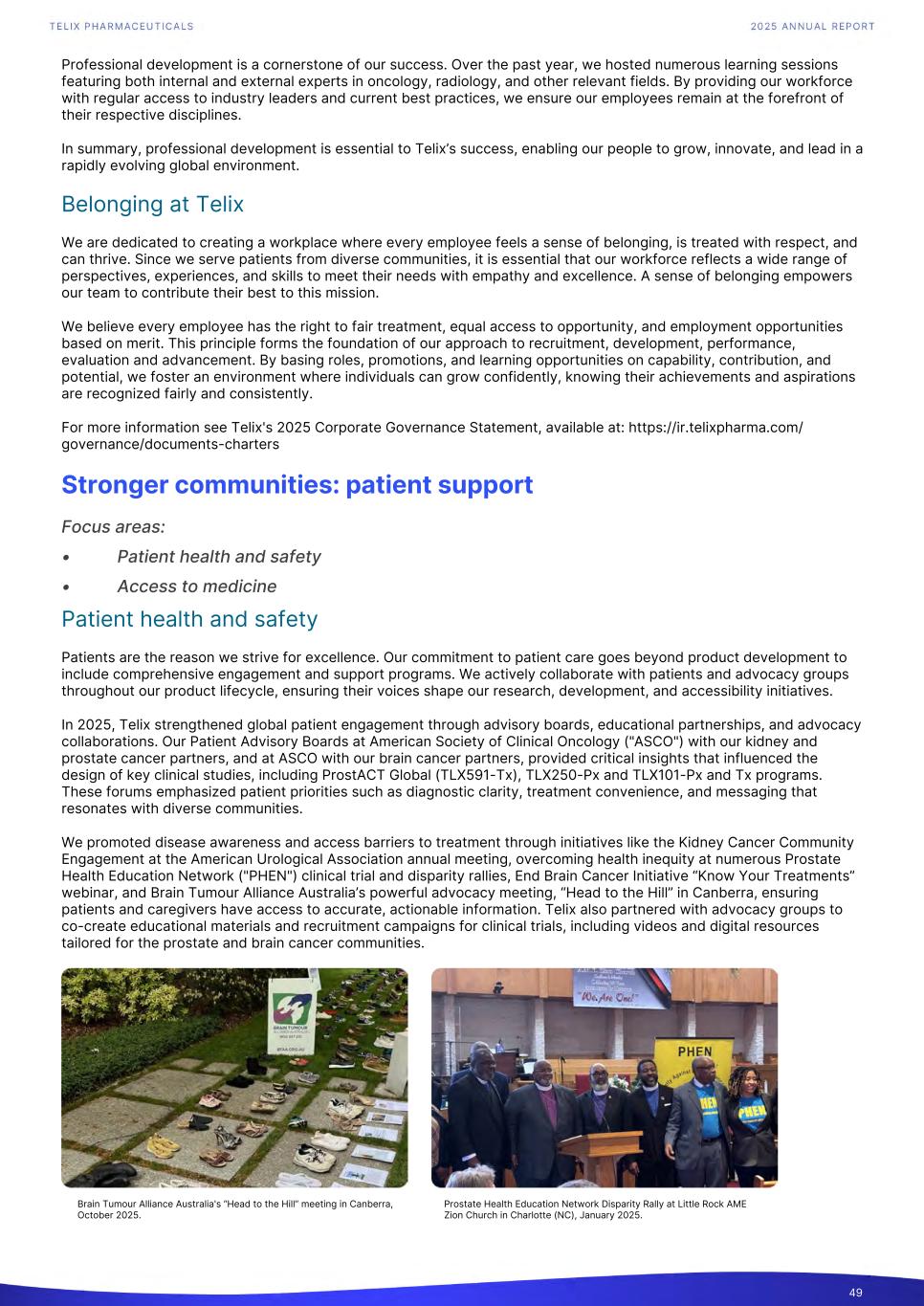 Professional development is a cornerstone of our success. Over the past year, we hosted numerous learning sessions featuring both internal and external experts in oncology, radiology, and other relevant fields. By providing our workforce with regular access to industry leaders and current best practices, we ensure our employees remain at the forefront of their respective disciplines. In summary, professional development is essential to Telix’s success, enabling our people to grow, innovate, and lead in a rapidly evolving global environment. Belonging at Telix We are dedicated to creating a workplace where every employee feels a sense of belonging, is treated with respect, and can thrive. Since we serve patients from diverse communities, it is essential that our workforce reflects a wide range of perspectives, experiences, and skills to meet their needs with empathy and excellence. A sense of belonging empowers our team to contribute their best to this mission. We believe every employee has the right to fair treatment, equal access to opportunity, and employment opportunities based on merit. This principle forms the foundation of our approach to recruitment, development, performance, evaluation and advancement. By basing roles, promotions, and learning opportunities on capability, contribution, and potential, we foster an environment where individuals can grow confidently, knowing their achievements and aspirations are recognized fairly and consistently. For more information see Telix's 2025 Corporate Governance Statement, available at: https://ir.telixpharma.com/ governance/documents-charters Stronger communities: patient support Focus areas: • Patient health and safety • Access to medicine Patient health and safety Patients are the reason we strive for excellence. Our commitment to patient care goes beyond product development to include comprehensive engagement and support programs. We actively collaborate with patients and advocacy groups throughout our product lifecycle, ensuring their voices shape our research, development, and accessibility initiatives. In 2025, Telix strengthened global patient engagement through advisory boards, educational partnerships, and advocacy collaborations. Our Patient Advisory Boards at American Society of Clinical Oncology ("ASCO") with our kidney and prostate cancer partners, and at ASCO with our brain cancer partners, provided critical insights that influenced the design of key clinical studies, including ProstACT Global (TLX591-Tx), TLX250-Px and TLX101-Px and Tx programs. These forums emphasized patient priorities such as diagnostic clarity, treatment convenience, and messaging that resonates with diverse communities. We promoted disease awareness and access barriers to treatment through initiatives like the Kidney Cancer Community Engagement at the American Urological Association annual meeting, overcoming health inequity at numerous Prostate Health Education Network ("PHEN") clinical trial and disparity rallies, End Brain Cancer Initiative “Know Your Treatments” webinar, and Brain Tumour Alliance Australia’s powerful advocacy meeting, “Head to the Hill” in Canberra, ensuring patients and caregivers have access to accurate, actionable information. Telix also partnered with advocacy groups to co-create educational materials and recruitment campaigns for clinical trials, including videos and digital resources tailored for the prostate and brain cancer communities. 49 Brain Tumour Alliance Australia's “Head to the Hill” meeting in Canberra, October 2025. Prostate Health Education Network Disparity Rally at Little Rock AME Zion Church in Charlotte (NC), January 2025.