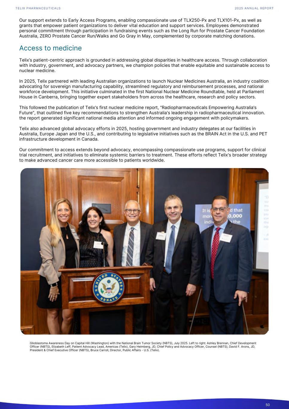 Our support extends to Early Access Programs, enabling compassionate use of TLX250-Px and TLX101-Px, as well as grants that empower patient organizations to deliver vital education and support services. Employees demonstrated personal commitment through participation in fundraising events such as the Long Run for Prostate Cancer Foundation Australia, ZERO Prostate Cancer Run/Walks and Go Gray in May, complemented by corporate matching donations. Access to medicine Telix’s patient-centric approach is grounded in addressing global disparities in healthcare access. Through collaboration with industry, government, and advocacy partners, we champion policies that enable equitable and sustainable access to nuclear medicine. In 2025, Telix partnered with leading Australian organizations to launch Nuclear Medicines Australia, an industry coalition advocating for sovereign manufacturing capability, streamlined regulatory and reimbursement processes, and national workforce development. This initiative culminated in the first National Nuclear Medicine Roundtable, held at Parliament House in Canberra, bringing together expert stakeholders from across the healthcare, research and policy sectors. This followed the publication of Telix’s first nuclear medicine report, “Radiopharmaceuticals Empowering Australia’s Future”, that outlined five key recommendations to strengthen Australia's leadership in radiopharmaceutical innovation. the report generated significant national media attention and informed ongoing engagement with policymakers. Telix also advanced global advocacy efforts in 2025, hosting government and industry delegates at our facilities in Australia, Europe Japan and the U.S., and contributing to legislative initiatives such as the BRAIN Act in the U.S. and PET infrastructure development in Canada. Our commitment to access extends beyond advocacy, encompassing compassionate use programs, support for clinical trial recruitment, and initiatives to eliminate systemic barriers to treatment. These efforts reflect Telix's broader strategy to make advanced cancer care more accessible to patients worldwide. 50 Glioblastoma Awareness Day on Capital Hill (Washington) with the National Brain Tumor Society (NBTS), July 2025. Left to right: Ashley Brennan, Chief Development Officer (NBTS), Elizabeth Leff, Patient Advocacy Lead, Americas (Telix), Gary Heimberg, JD, Chief Policy and Advocacy Officer, Counsel (NBTS), David F. Arons, JD, President & Chief Executive Officer (NBTS), Bruce Carroll, Director, Public Affairs - U.S. (Telix).