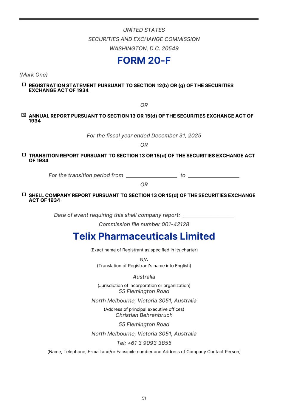 UNITED STATES SECURITIES AND EXCHANGE COMMISSION WASHINGTON, D.C. 20549 FORM 20-F (Mark One) o REGISTRATION STATEMENT PURSUANT TO SECTION 12(b) OR (g) OF THE SECURITIES EXCHANGE ACT OF 1934 OR x ANNUAL REPORT PURSUANT TO SECTION 13 OR 15(d) OF THE SECURITIES EXCHANGE ACT OF 1934 For the fiscal year ended December 31, 2025 OR o TRANSITION REPORT PURSUANT TO SECTION 13 OR 15(d) OF THE SECURITIES EXCHANGE ACT OF 1934 For the transition period from  _____________________  to  _____________________ OR o SHELL COMPANY REPORT PURSUANT TO SECTION 13 OR 15(d) OF THE SECURITIES EXCHANGE ACT OF 1934 Date of event requiring this shell company report:  _____________________ Commission file number 001-42128 Telix Pharmaceuticals Limited (Exact name of Registrant as specified in its charter) N/A (Translation of Registrant's name into English) Australia (Jurisdiction of incorporation or organization) 55 Flemington Road North Melbourne, Victoria 3051, Australia (Address of principal executive offices) Christian Behrenbruch 55 Flemington Road North Melbourne, Victoria 3051, Australia Tel: +61 3 9093 3855 (Name, Telephone, E-mail and/or Facsimile number and Address of Company Contact Person) 51