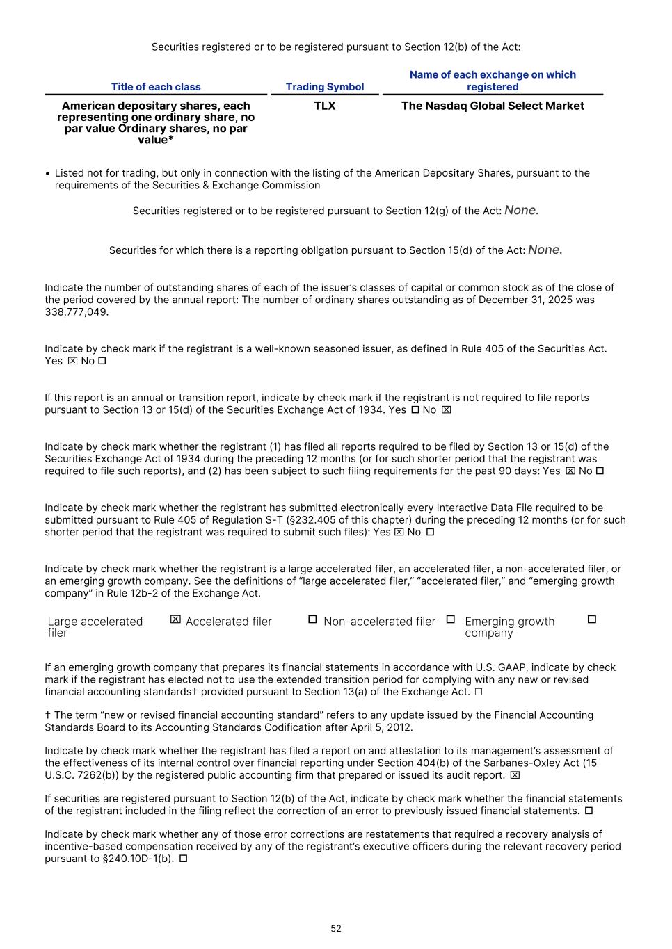 Securities registered or to be registered pursuant to Section 12(b) of the Act: Title of each class Trading Symbol Name of each exchange on which registered American depositary shares, each representing one ordinary share, no par value Ordinary shares, no par value* TLX The Nasdaq Global Select Market • Listed not for trading, but only in connection with the listing of the American Depositary Shares, pursuant to the requirements of the Securities & Exchange Commission Securities registered or to be registered pursuant to Section 12(g) of the Act: None. Securities for which there is a reporting obligation pursuant to Section 15(d) of the Act: None. Indicate the number of outstanding shares of each of the issuer’s classes of capital or common stock as of the close of the period covered by the annual report: The number of ordinary shares outstanding as of December 31, 2025 was 338,777,049. Indicate by check mark if the registrant is a well-known seasoned issuer, as defined in Rule 405 of the Securities Act. Yes  x No o If this report is an annual or transition report, indicate by check mark if the registrant is not required to file reports pursuant to Section 13 or 15(d) of the Securities Exchange Act of 1934. Yes  o No  x Indicate by check mark whether the registrant (1) has filed all reports required to be filed by Section 13 or 15(d) of the Securities Exchange Act of 1934 during the preceding 12 months (or for such shorter period that the registrant was required to file such reports), and (2) has been subject to such filing requirements for the past 90 days: Yes  x No o Indicate by check mark whether the registrant has submitted electronically every Interactive Data File required to be submitted pursuant to Rule 405 of Regulation S-T (§232.405 of this chapter) during the preceding 12 months (or for such shorter period that the registrant was required to submit such files): Yes x No  o Indicate by check mark whether the registrant is a large accelerated filer, an accelerated filer, a non-accelerated filer, or an emerging growth company. See the definitions of “large accelerated filer,” “accelerated filer,” and “emerging growth company” in Rule 12b-2 of the Exchange Act. Large accelerated filer x Accelerated filer o Non-accelerated filer o Emerging growth company o If an emerging growth company that prepares its financial statements in accordance with U.S. GAAP, indicate by check mark if the registrant has elected not to use the extended transition period for complying with any new or revised financial accounting standards† provided pursuant to Section 13(a) of the Exchange Act.  ☐ † The term “new or revised financial accounting standard” refers to any update issued by the Financial Accounting Standards Board to its Accounting Standards Codification after April 5, 2012. Indicate by check mark whether the registrant has filed a report on and attestation to its management’s assessment of the effectiveness of its internal control over financial reporting under Section 404(b) of the Sarbanes-Oxley Act (15 U.S.C. 7262(b)) by the registered public accounting firm that prepared or issued its audit report.  x If securities are registered pursuant to Section 12(b) of the Act, indicate by check mark whether the financial statements of the registrant included in the filing reflect the correction of an error to previously issued financial statements.  o Indicate by check mark whether any of those error corrections are restatements that required a recovery analysis of incentive-based compensation received by any of the registrant’s executive officers during the relevant recovery period pursuant to §240.10D-1(b).  o 52