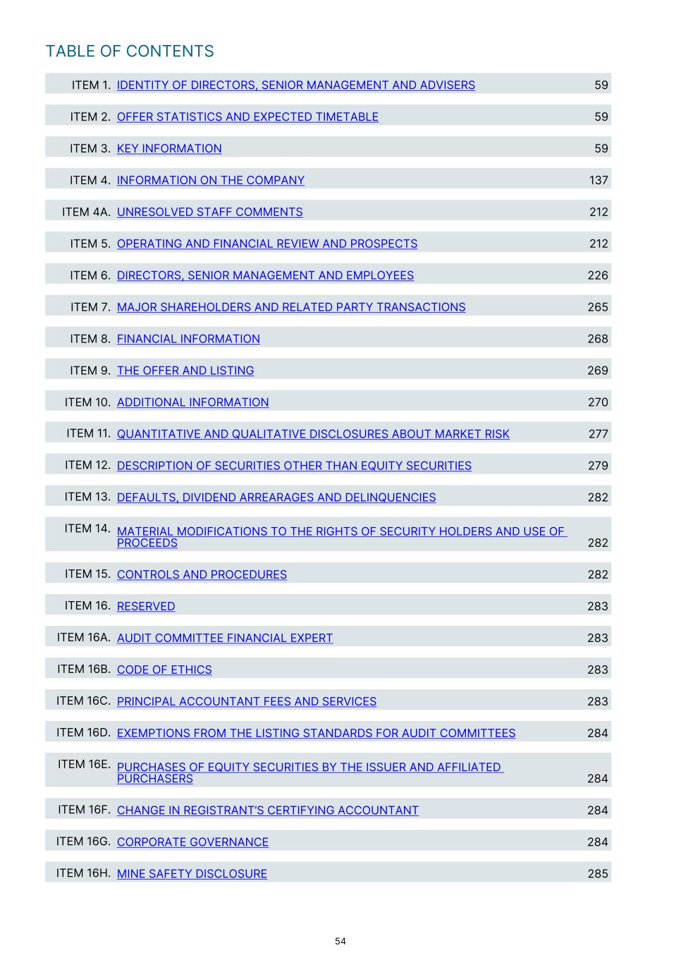 TABLE OF CONTENTS ITEM 1. IDENTITY OF DIRECTORS, SENIOR MANAGEMENT AND ADVISERS 59 ITEM 2. OFFER STATISTICS AND EXPECTED TIMETABLE 59 ITEM 3. KEY INFORMATION 59 ITEM 4. INFORMATION ON THE COMPANY 137 ITEM 4A. UNRESOLVED STAFF COMMENTS 212 ITEM 5. OPERATING AND FINANCIAL REVIEW AND PROSPECTS 212 ITEM 6. DIRECTORS, SENIOR MANAGEMENT AND EMPLOYEES 226 ITEM 7. MAJOR SHAREHOLDERS AND RELATED PARTY TRANSACTIONS 265 ITEM 8. FINANCIAL INFORMATION 268 ITEM 9. THE OFFER AND LISTING 269 ITEM 10. ADDITIONAL INFORMATION 270 ITEM 11. QUANTITATIVE AND QUALITATIVE DISCLOSURES ABOUT MARKET RISK 277 ITEM 12. DESCRIPTION OF SECURITIES OTHER THAN EQUITY SECURITIES 279 ITEM 13. DEFAULTS, DIVIDEND ARREARAGES AND DELINQUENCIES 282 ITEM 14. MATERIAL MODIFICATIONS TO THE RIGHTS OF SECURITY HOLDERS AND USE OF PROCEEDS 282 ITEM 15. CONTROLS AND PROCEDURES 282 ITEM 16. RESERVED 283 ITEM 16A. AUDIT COMMITTEE FINANCIAL EXPERT 283 ITEM 16B. CODE OF ETHICS 283 ITEM 16C. PRINCIPAL ACCOUNTANT FEES AND SERVICES 283 ITEM 16D. EXEMPTIONS FROM THE LISTING STANDARDS FOR AUDIT COMMITTEES 284 ITEM 16E. PURCHASES OF EQUITY SECURITIES BY THE ISSUER AND AFFILIATED PURCHASERS 284 ITEM 16F. CHANGE IN REGISTRANT’S CERTIFYING ACCOUNTANT 284 ITEM 16G. CORPORATE GOVERNANCE 284 ITEM 16H. MINE SAFETY DISCLOSURE 285 54